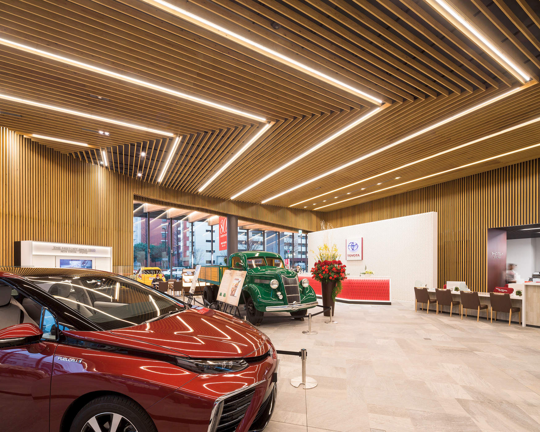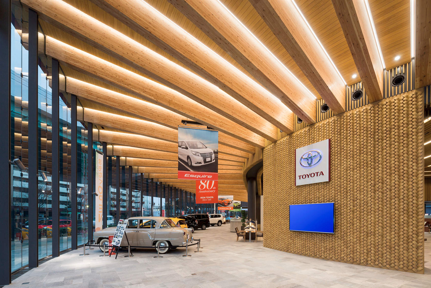 全面、木の内装でこれまでにない自動車ディーラーの大型ショールームとなっており、エコに対するイメージも重視している。この地域のランドマークの役目としてだけではなく、今後の全国のディーラーの店舗づくりへの影響も大きいと思われる。