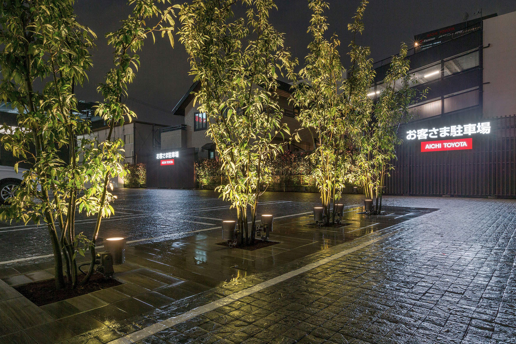 ポール灯のような高い照明器具は設置せずに、同敷地内の建物との調和が取れるように光の位置を低めに演出。それぞれの植栽の葉にアッパーライトの光が伝って、空間に明るさ感を出している。