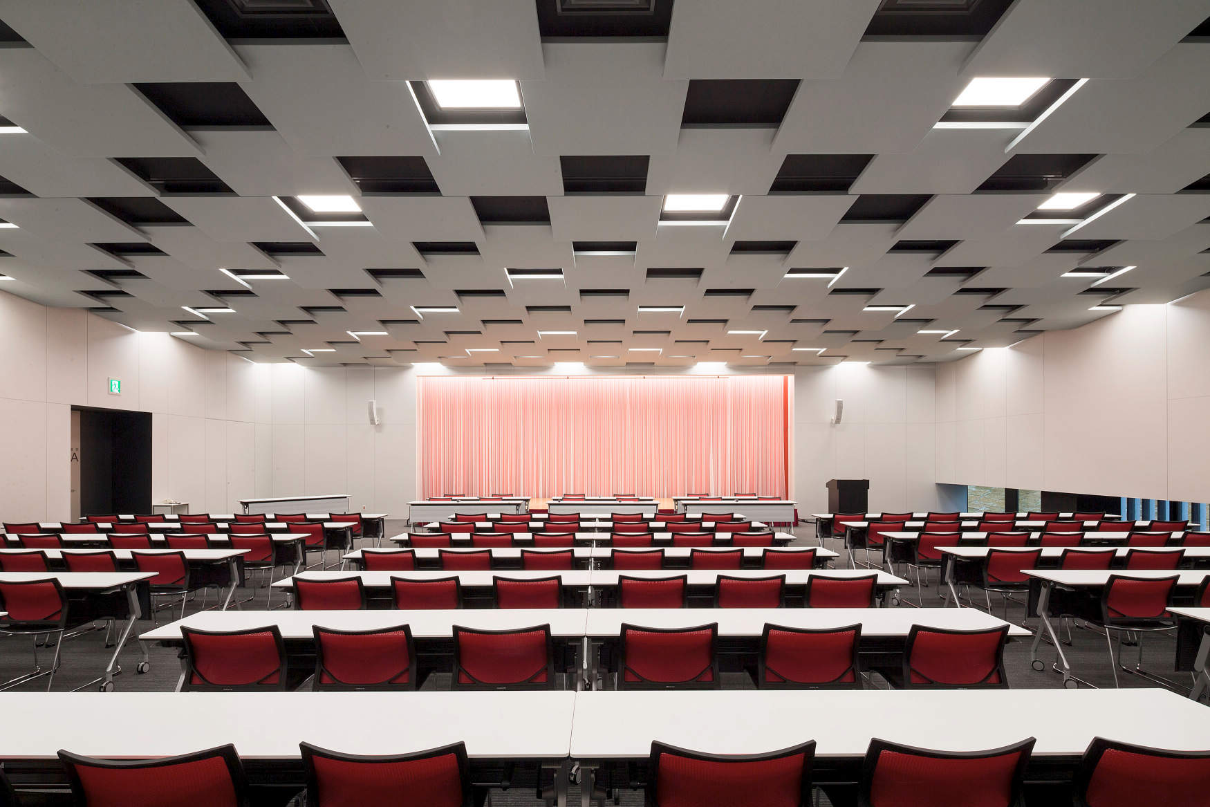 天井はうろこ状のになっており、一枚一枚のパネルが少しずつ重なっている。その間に基本照明のスクエアベース照明を設置。