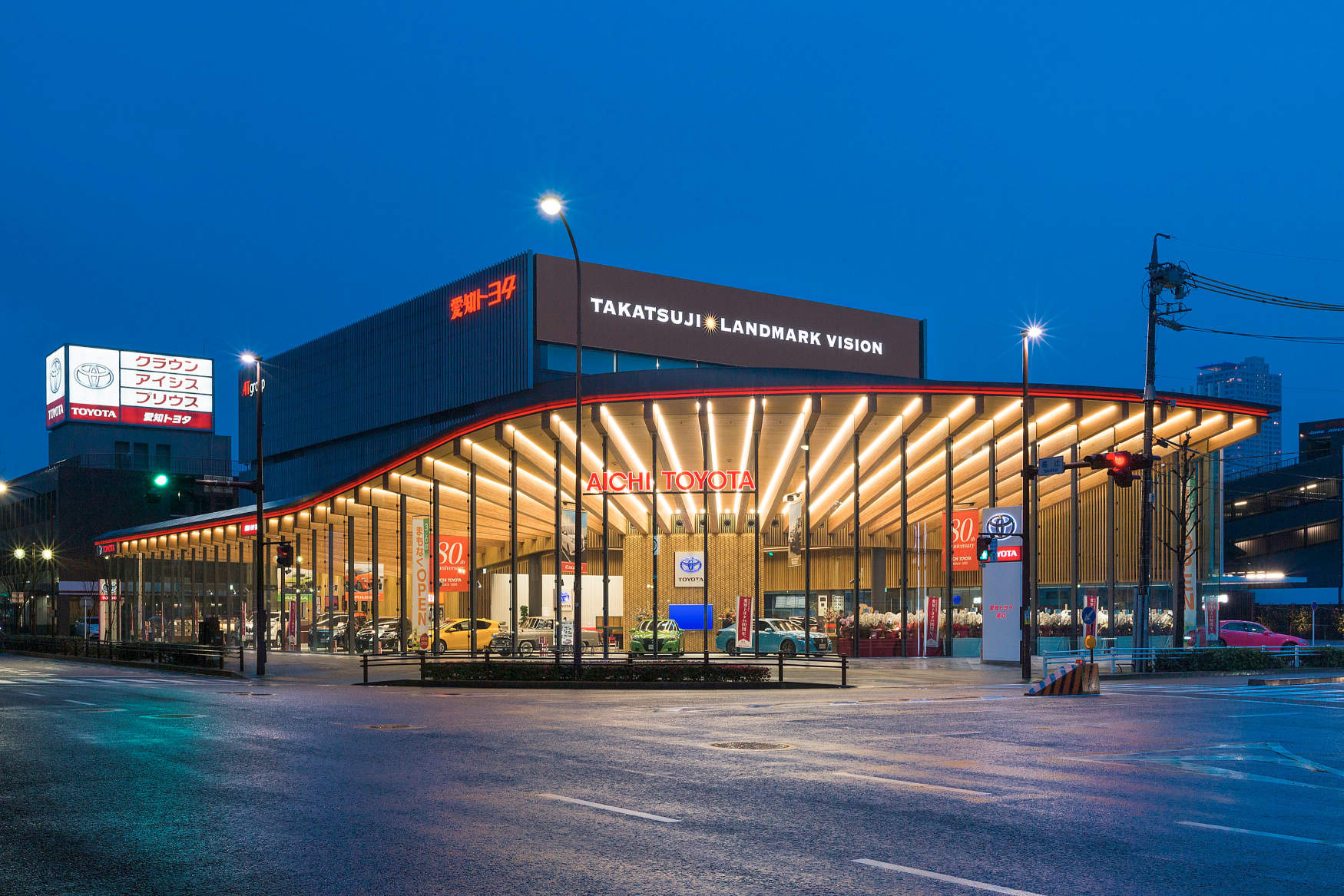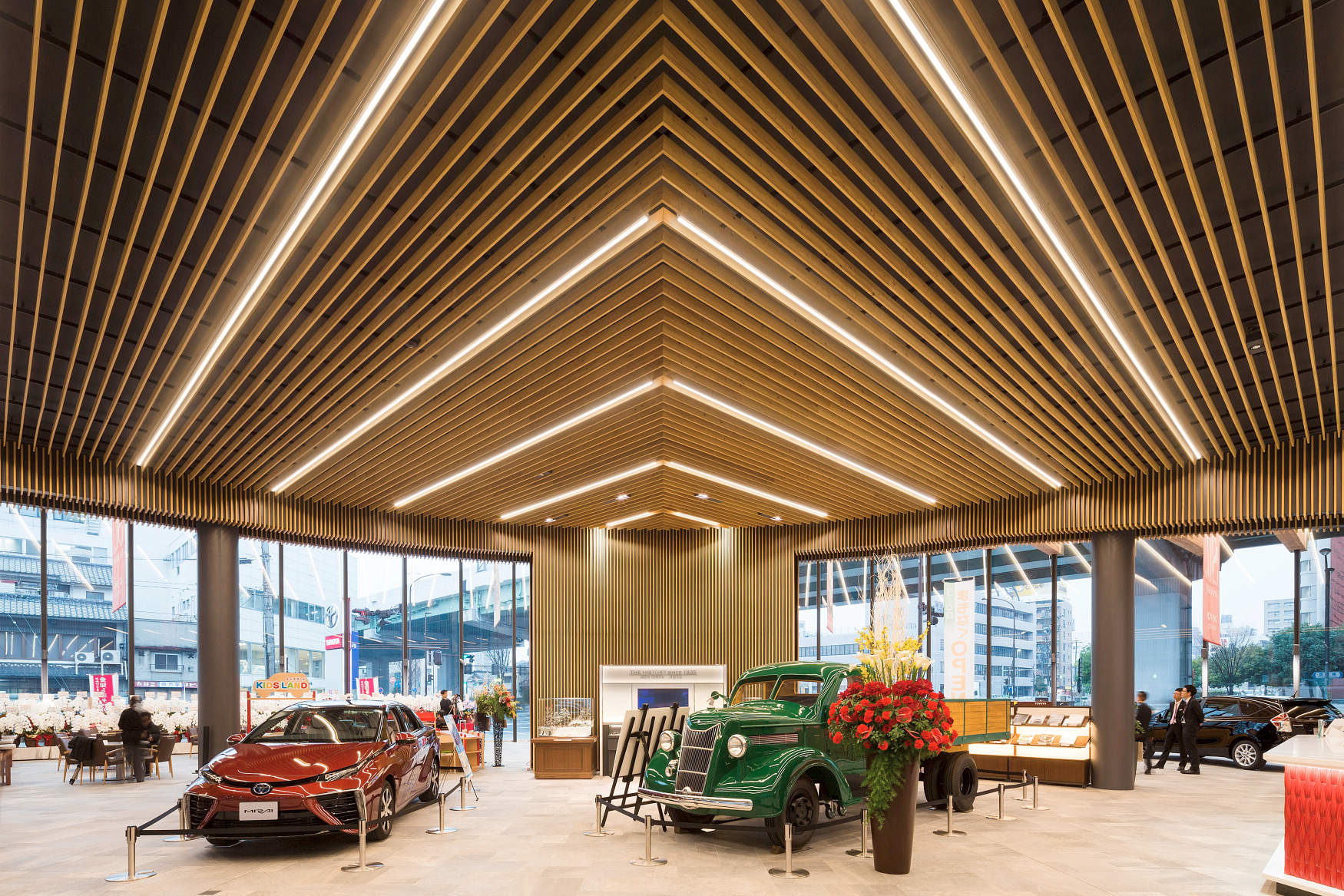 大きな木の梁が扇状に内部から外部へと広がり、その梁の両側にシームレスを採用。梁はガラスの外まで続いており、幾重にも広がるライン状の光が印象的である。照度センサにより外光と連動した調光制御を行っている。営業時間によって、調光率を変え、営業後やイベント時などもショーアップするように点滅区分を変えた演出もしている。壁面にはユニバーサルダウンライトで照射し、ガラス張りのショールームは、常に明るさ感を保っている。ガラス側にある鉄骨の細い柱からスポットで車を照射している。