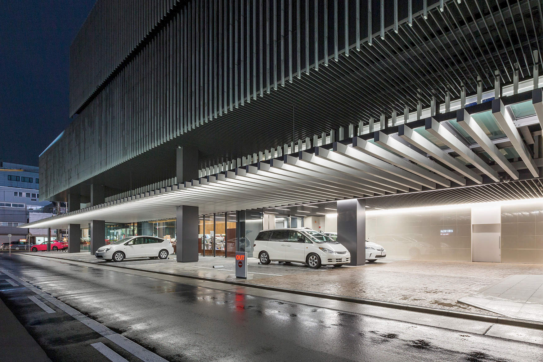 上に高速道路が走っている大きな交差点(高辻)から見た、建物は外側に向かって張り出したいくつもの梁が印象的で、周辺地域のランドマークとなっている。前面の大きなガラスからは、ショールーム内がはっきりと浮かび上がって見える。夕暮れ時からは、店内中心へと真っ直ぐに伸びるライン状の光がより美しく見える。