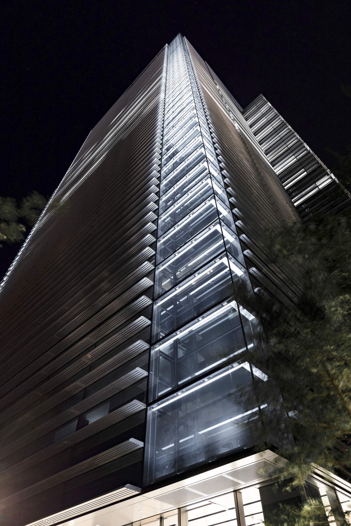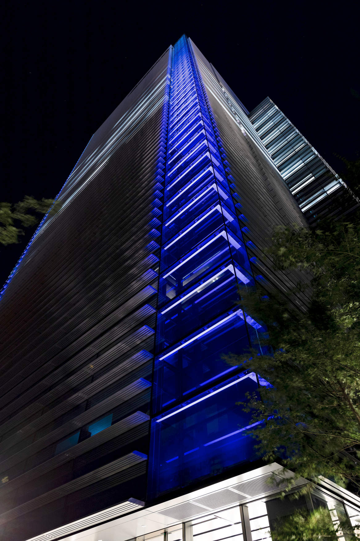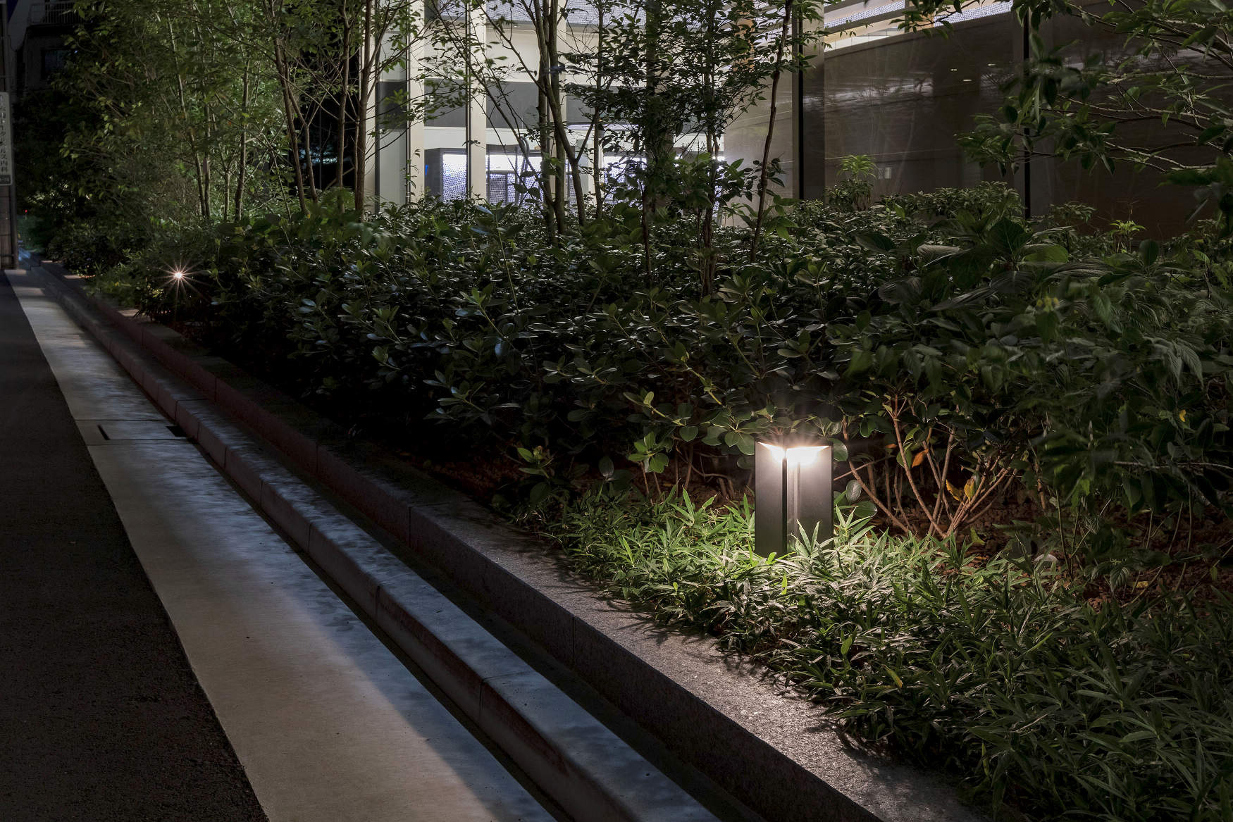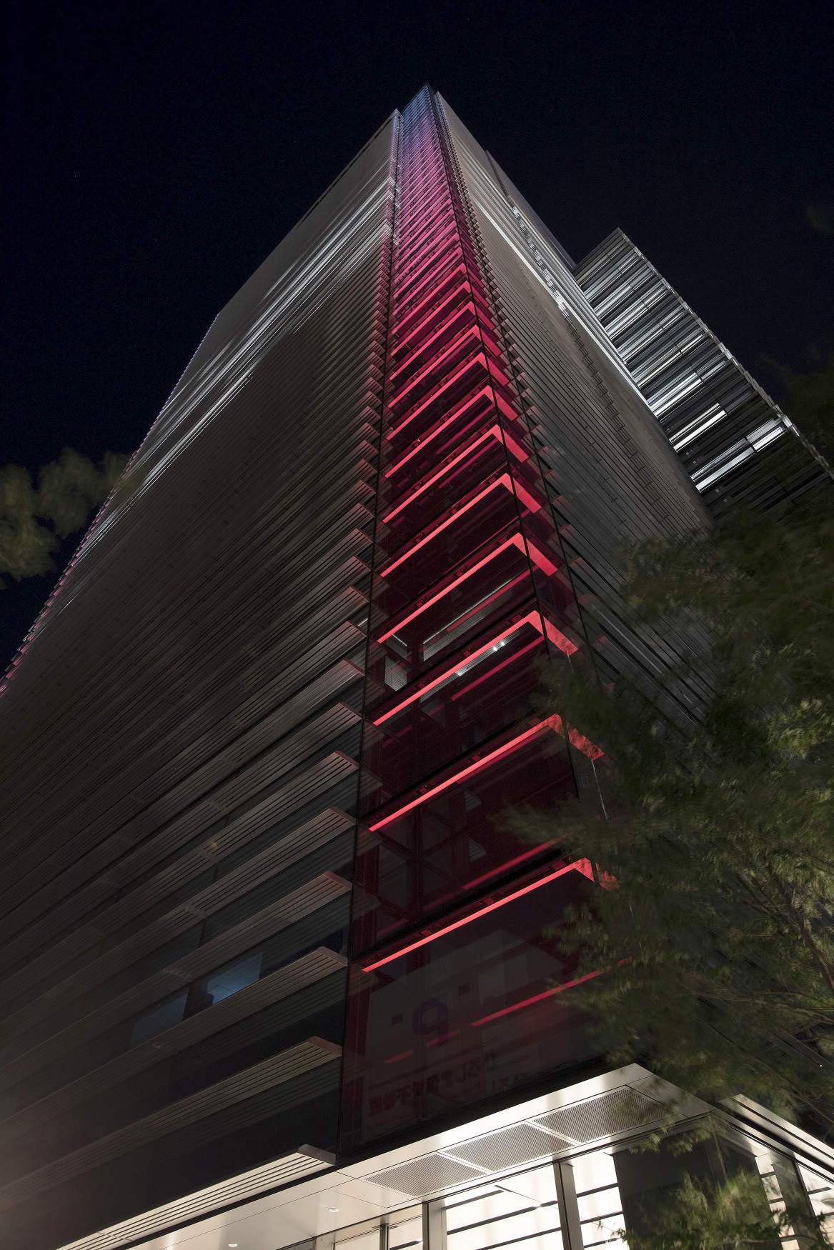 外観の特徴となっている、建物の四隅に配置した自然換気を促す「風の塔」(エコボイド)のライトアップを行うことによって「光の塔」をつくりだし、夜のまちの賑わいを演出した。