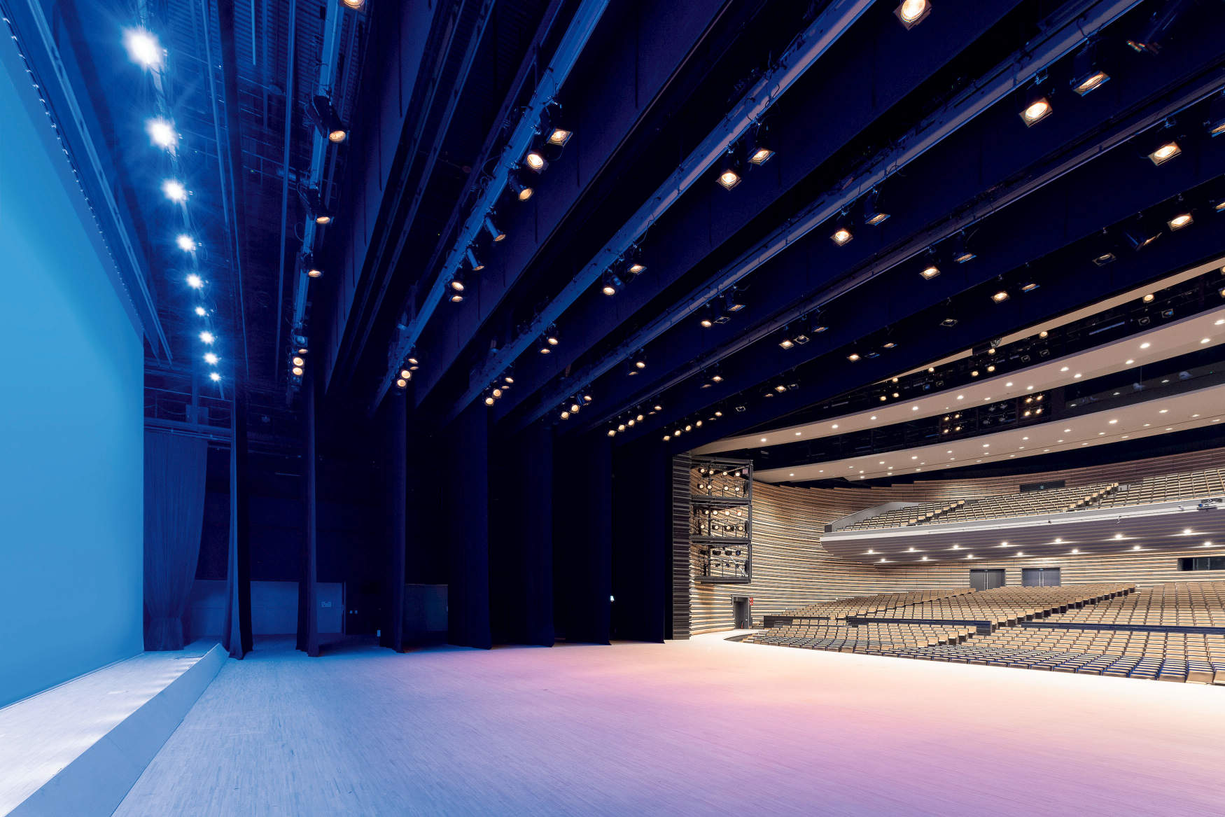 「シビックホール」は移動式観覧席の採用により、750席の利用と、320席の2分割利用が可能なホールで、Ethernetのネットワーク上の各所のLANコネクタからDMX信号のIN/OUTがフレキシブルに行えます。