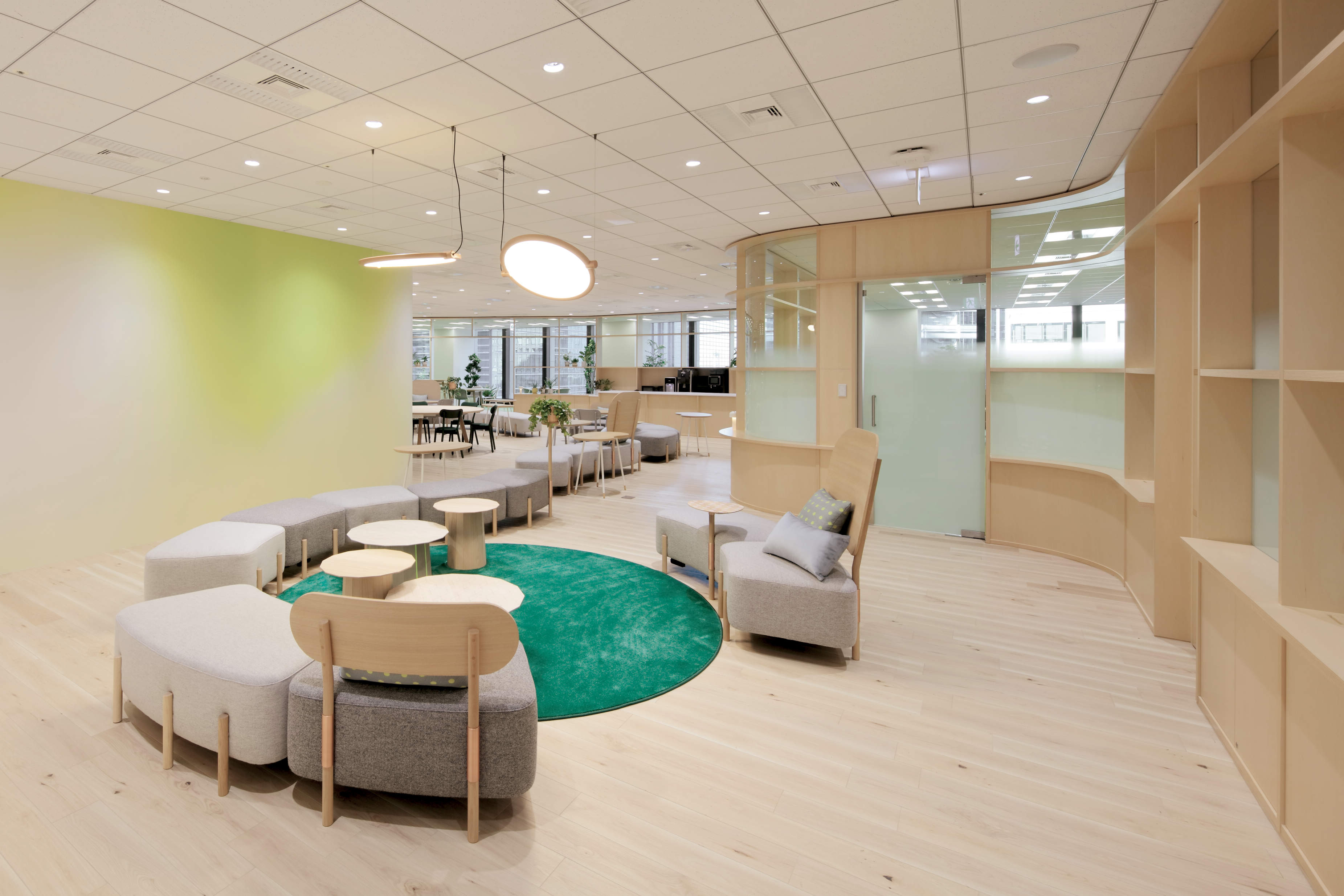 ニューノーマルに対応した働き方を加速するオフィスを構築。印象的な「Shelf」で空間を緩やかに仕切り、多様な場を構成しています。