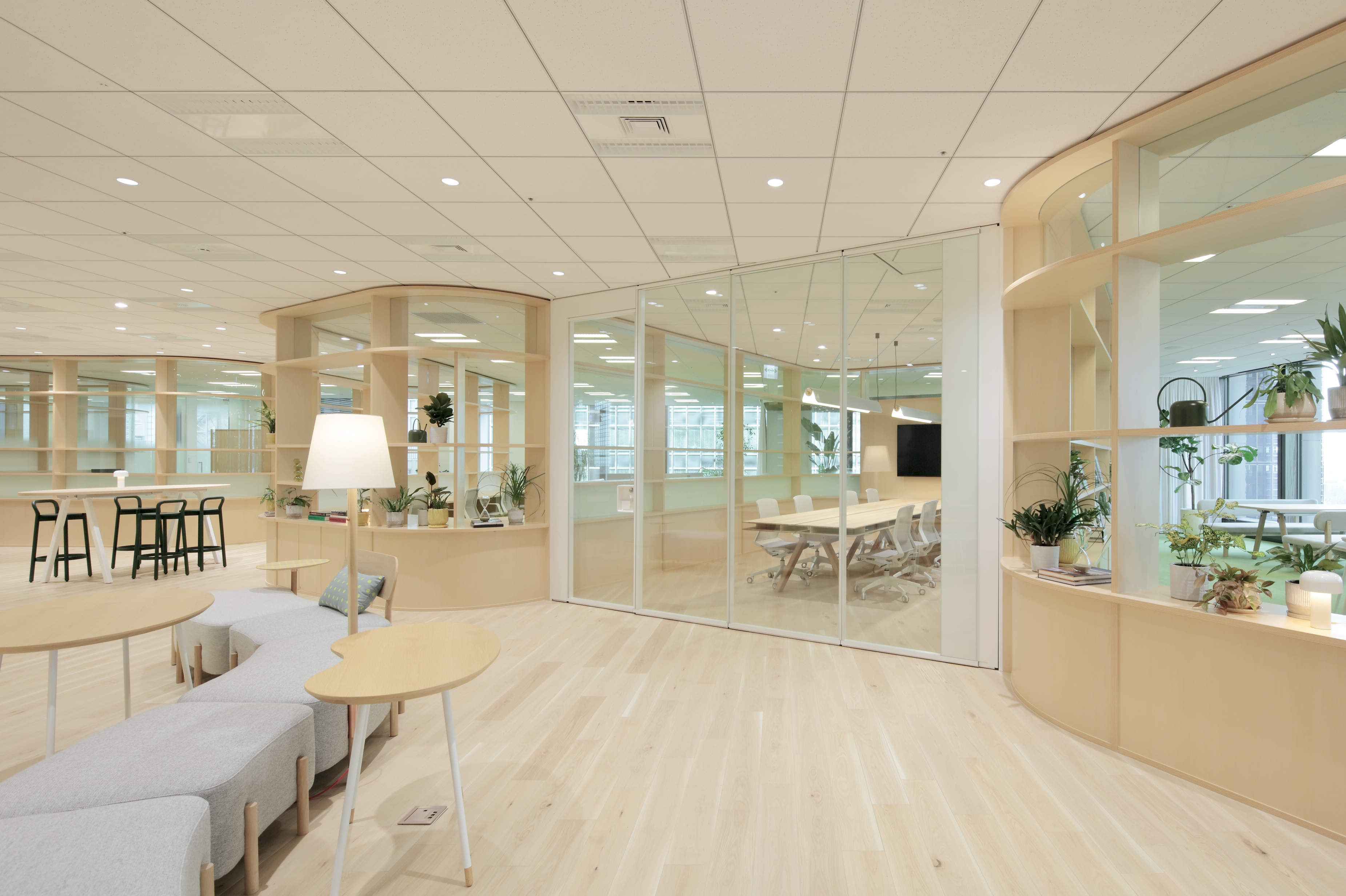 - ニューノーマルに対応した働き方を加速するオフィスを構築。印象的な「Shelf」で空間を緩やかに仕切り、多様な場を構成しています。