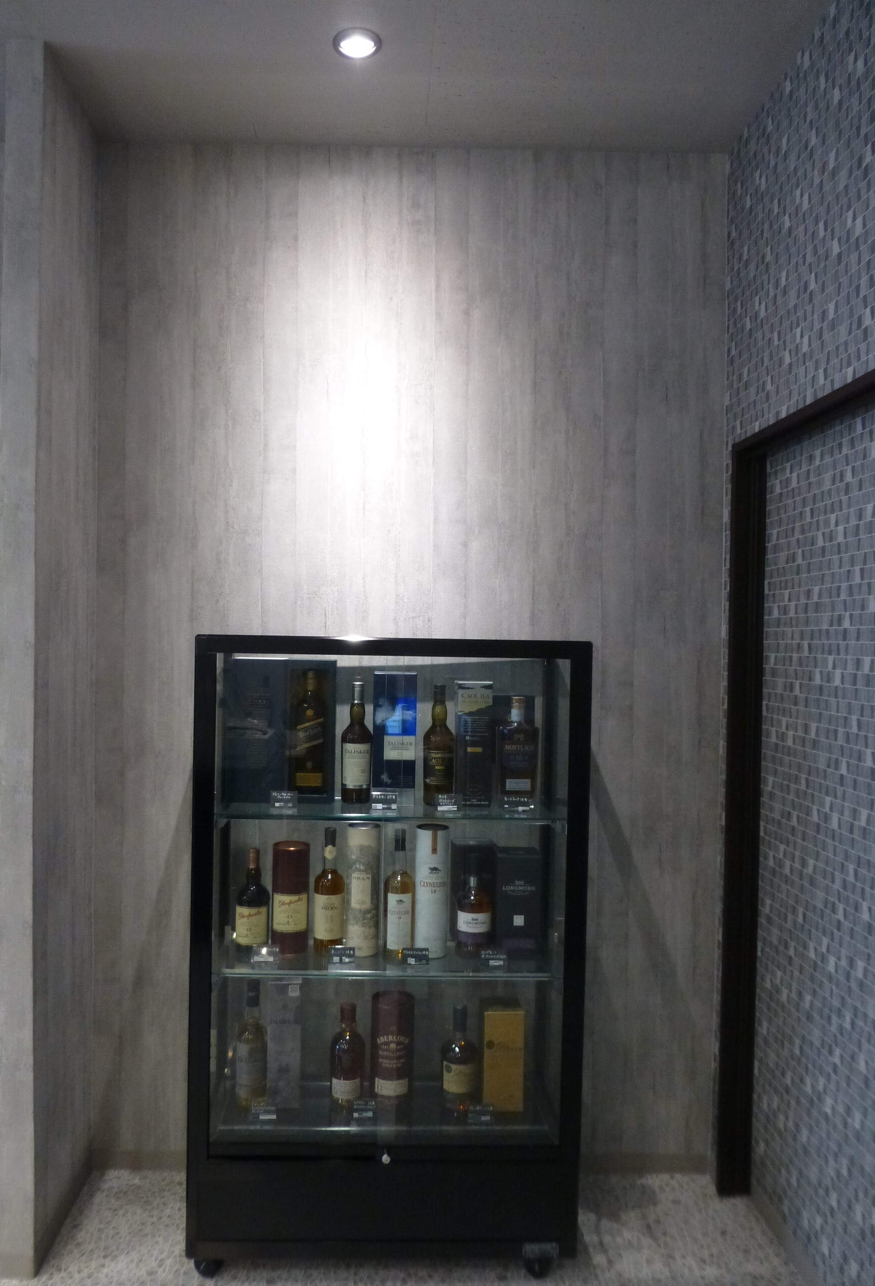 ダウンライトのベースのあかりとダクトレールに取り付けた集光のスポットライトでお酒を照らします。