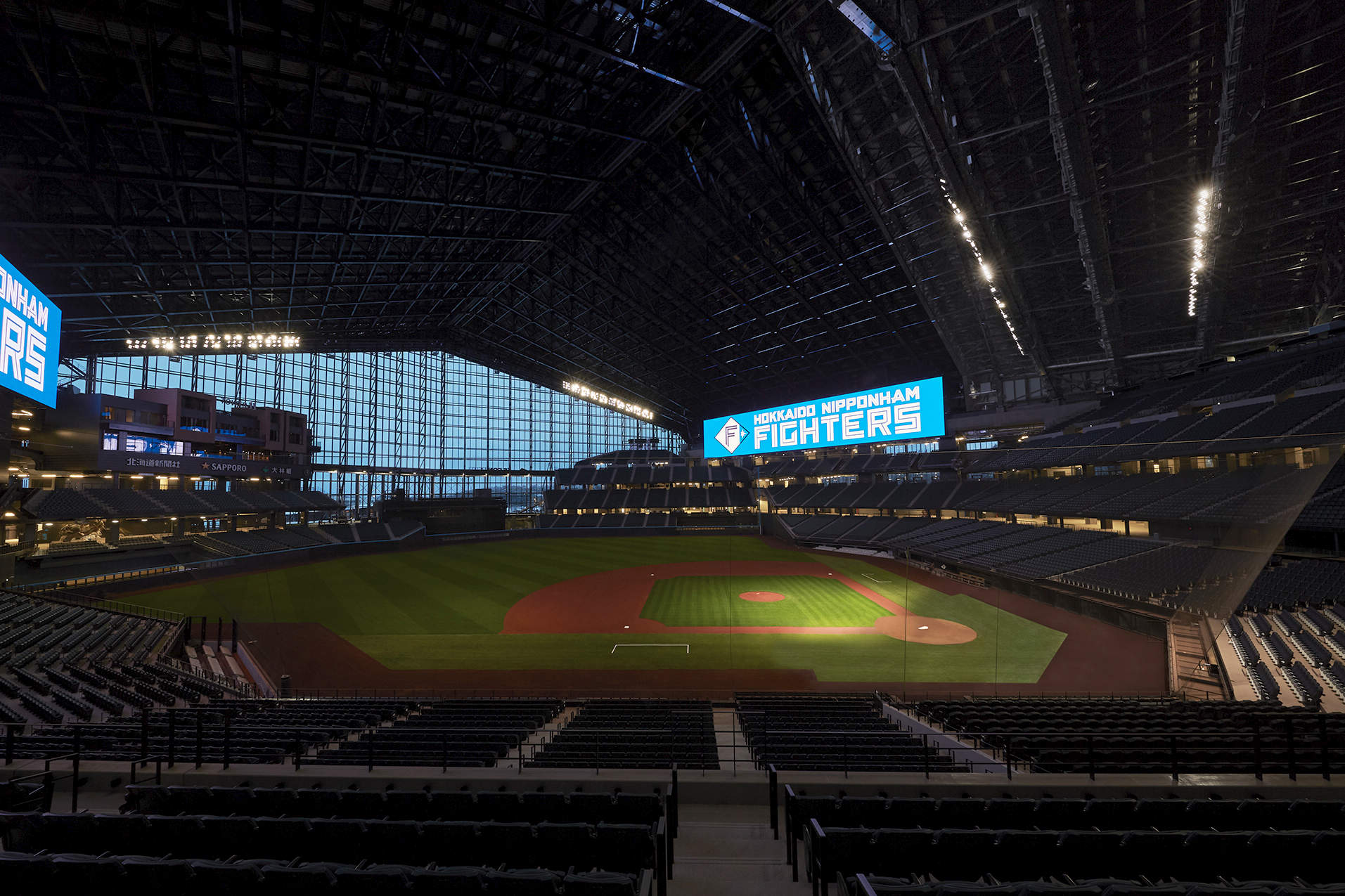 - 北海道北広島市Fビレッジに建設された北海道日本ハムファイターズの本拠地となる球場。敷地面接5ha、収容人数3万5000人の日本初開閉式屋根付き天然芝球場となっています。建物は道民に馴染のある切妻屋根が特徴的なデザインで、外壁はレンガ調タイルを採用し、北海道のシンボルを目指しています。天然芝を育てるために、PCライン(ピッチャーキャッチャー)の向きを南東向きとし、大きなガラスカーテンウォールから直射日光を取り込める仕様となっています。また、大きな屋根の1枚が水平に開閉することで、屋外環境にもなり、天然芝育成のための光・風環境の向上、および多様な観戦環境の提供に寄与しています。フィールドに面したレフト側には、温浴施設(温泉・サウナ)・ホテル、ライト側にはビールの醸造所・キッズスペースがあり、試合がない日にも人々が集うことができる機能も有しています。