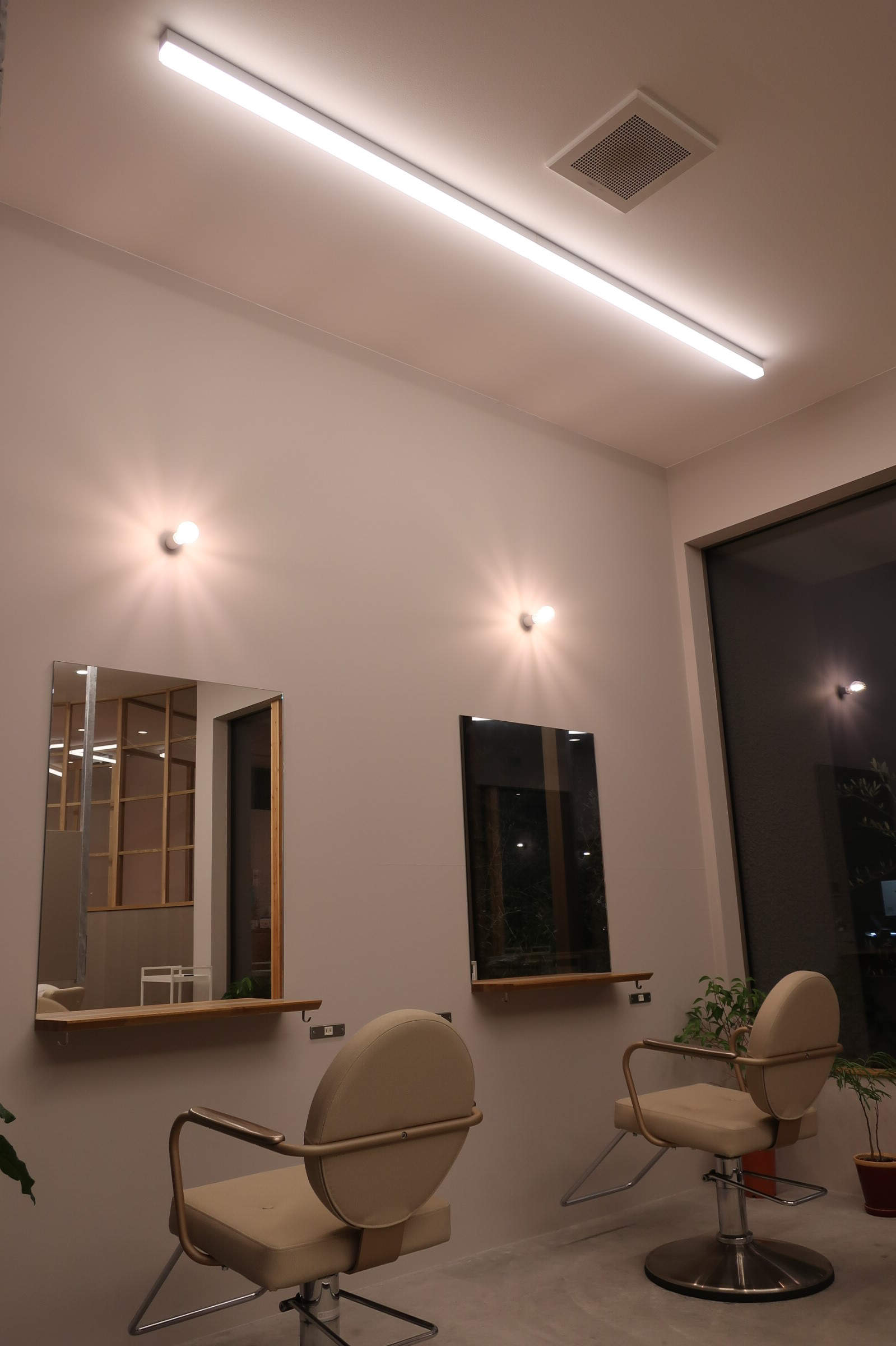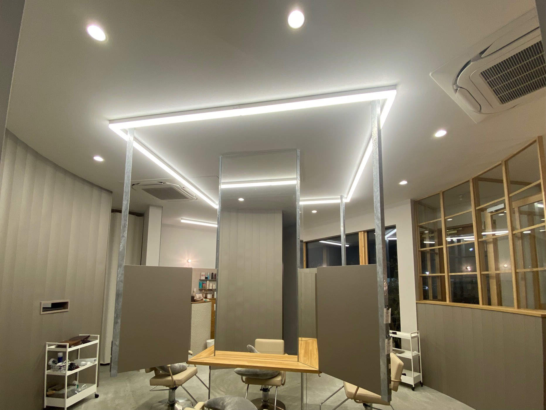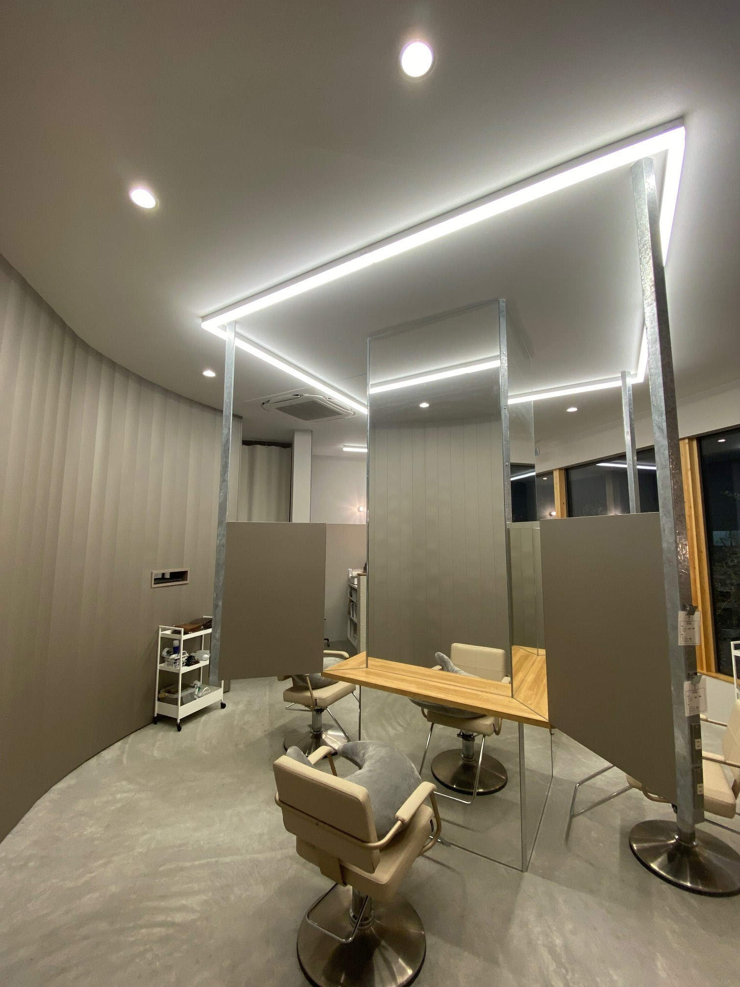 - 店内に入るとまず目に入るカットスペースの印象的な四角形のライン照明はsBシリーズが採用されています。