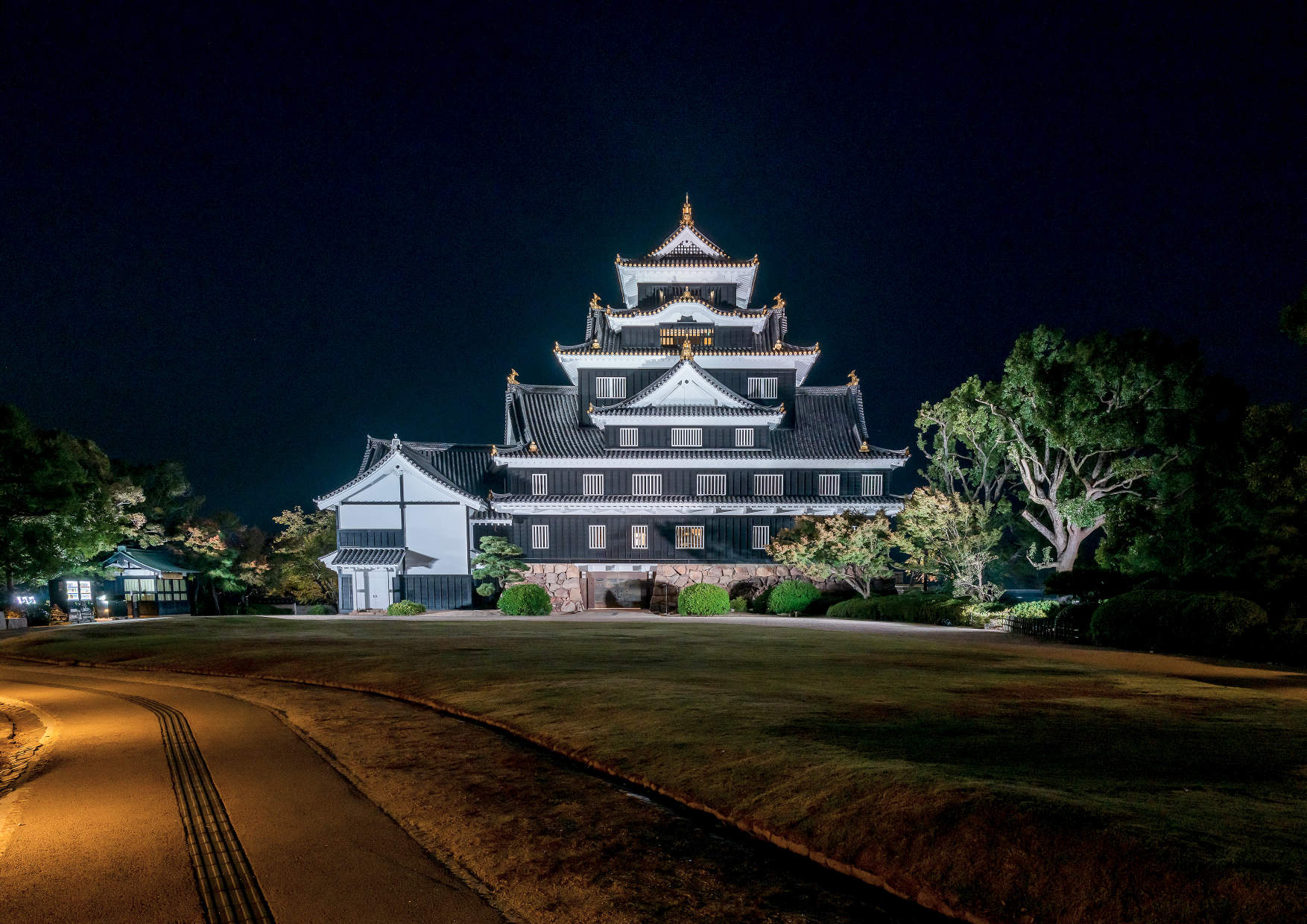 岡山城正面からのライトアップ。岡山城の白と黒の見栄えが良くなるように独自プログラムにより細かく色見を調整しております。