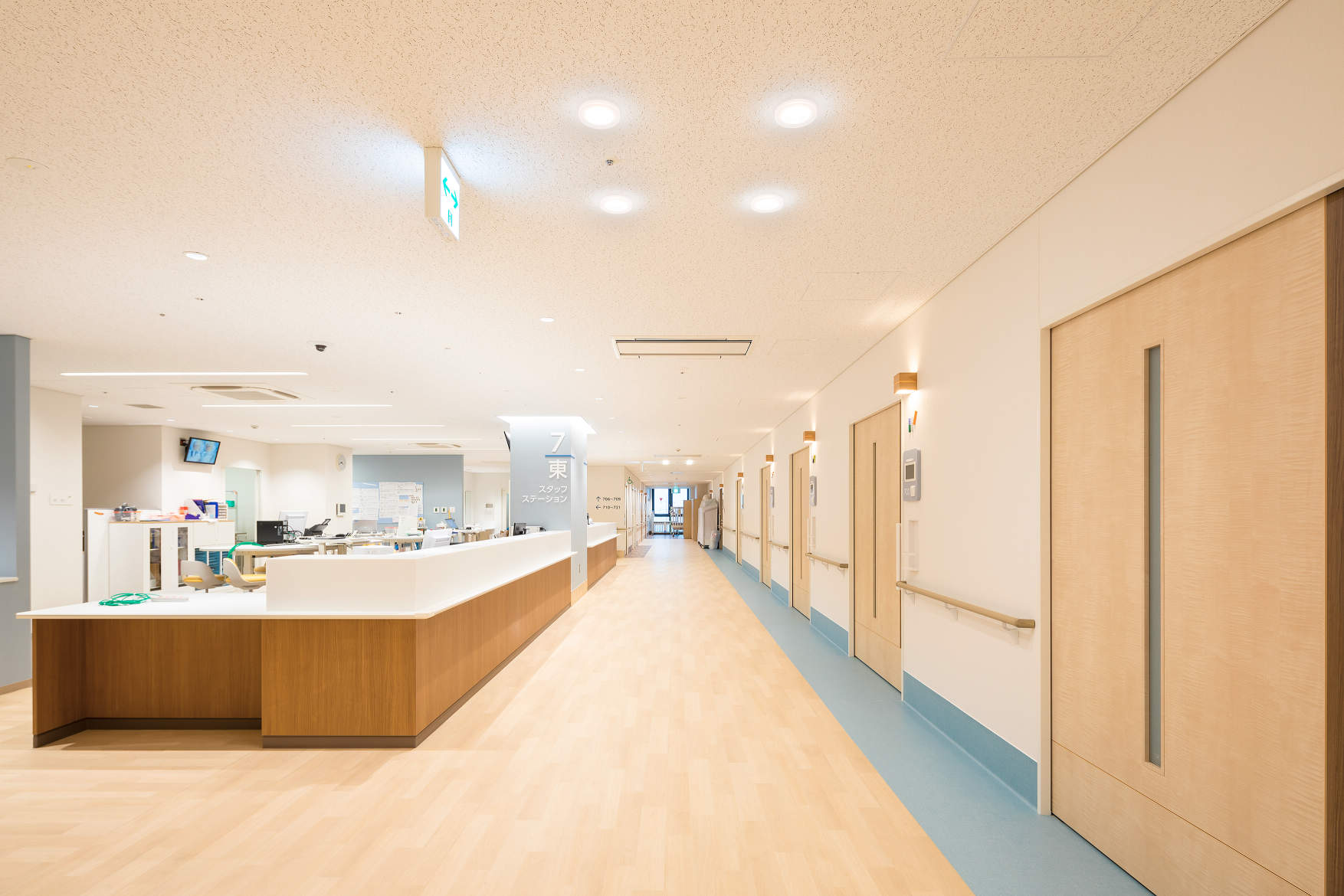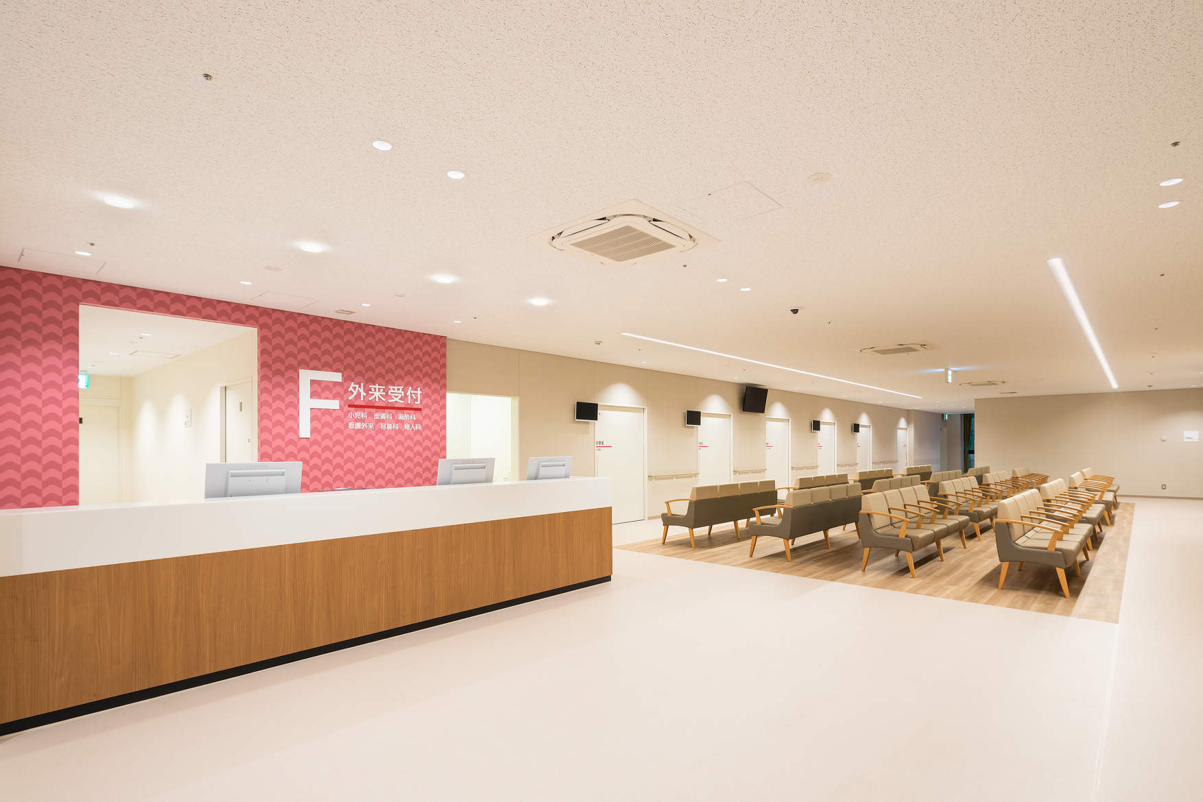 診察室前はソフトライトラインを連結で照度を確保するとともに、グレアを抑えることで長時間の待ち時間に配慮しました。廊下の交差点は、透過枠のダウンライトで目印になるような照明計画としました。