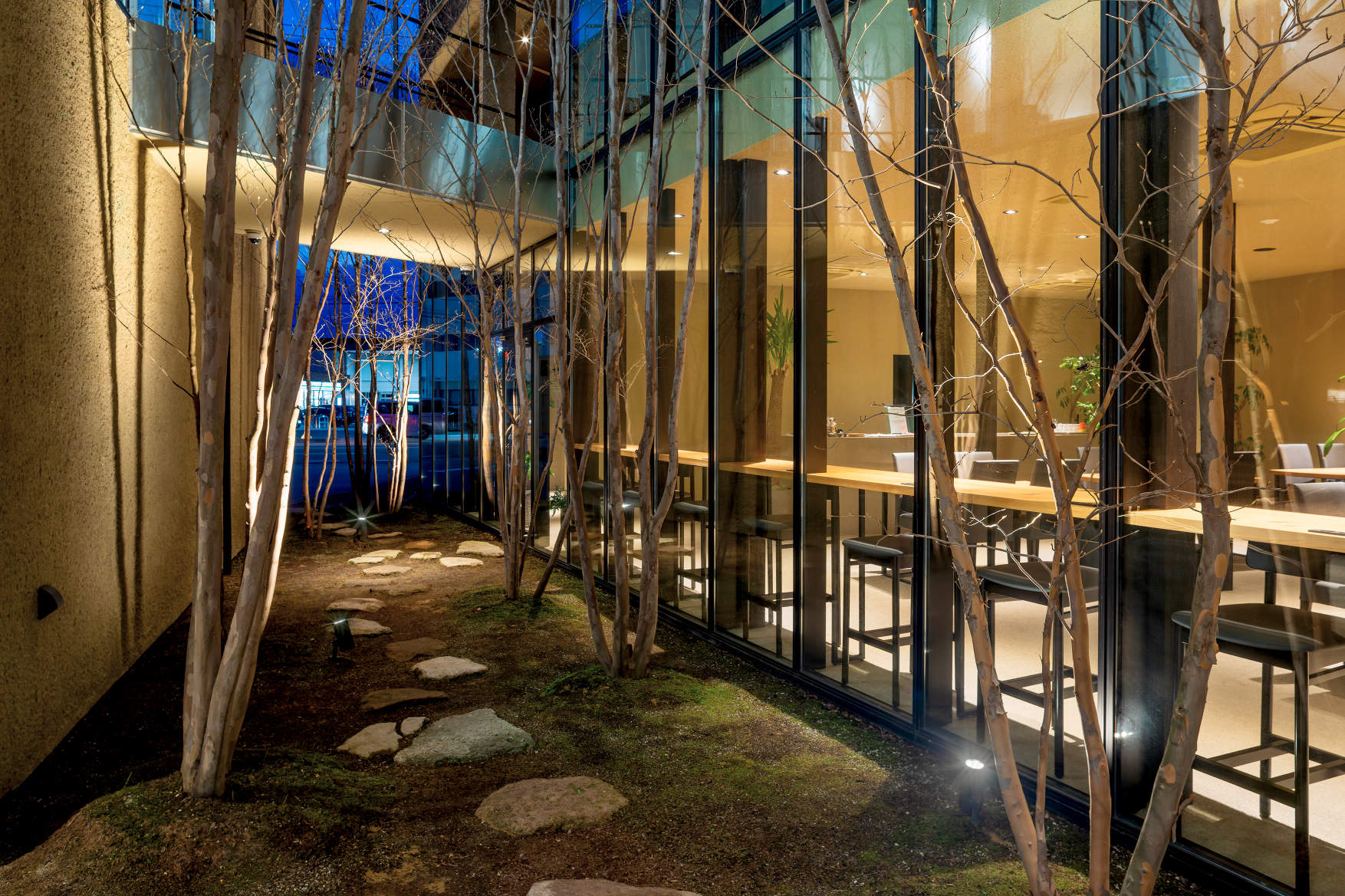 また駐車スペースの横は中庭になっており、植栽をスポットライトで照らしています。