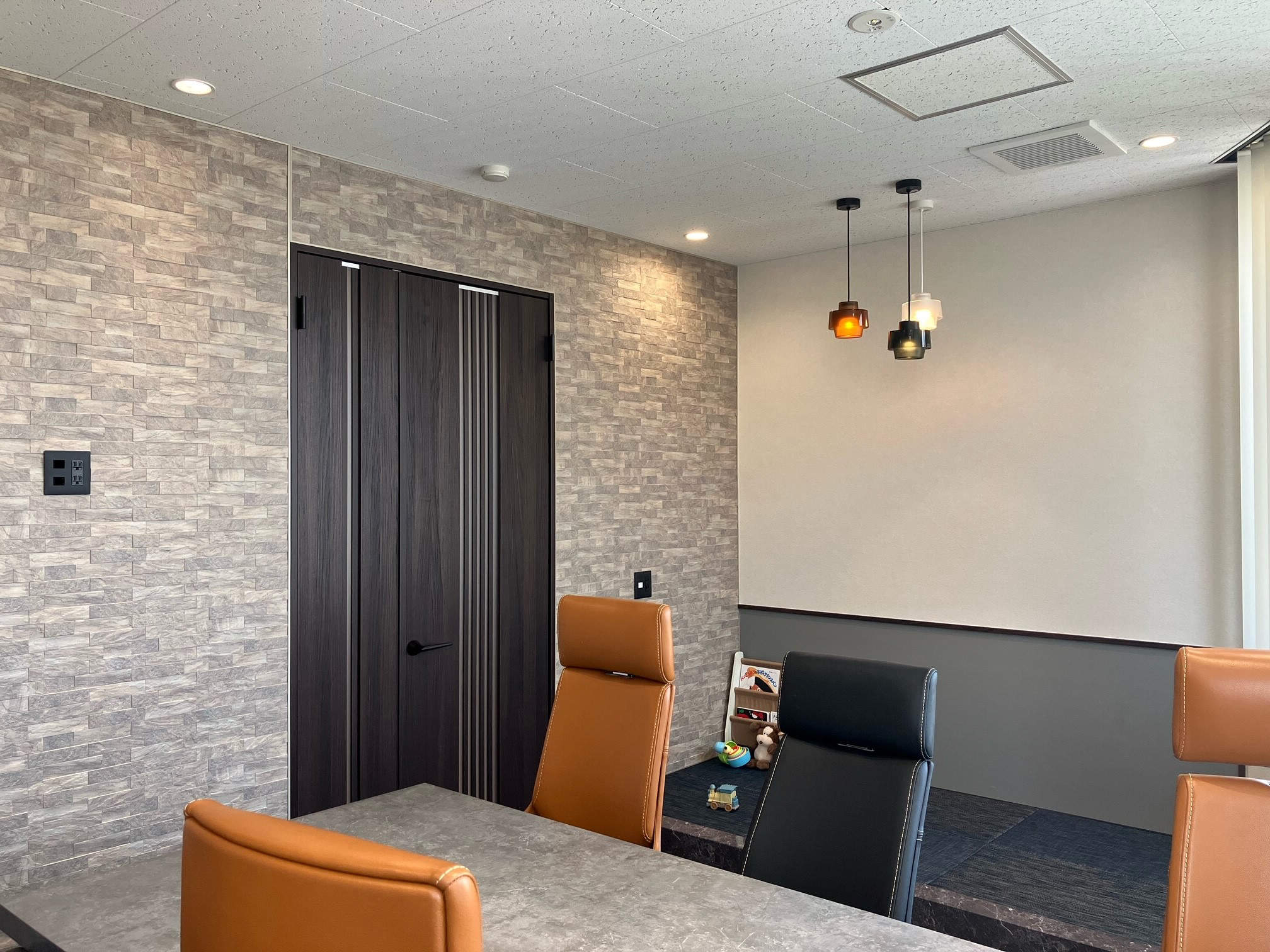 受付と役員エリアには黒のダクトレールに小型シーリングで