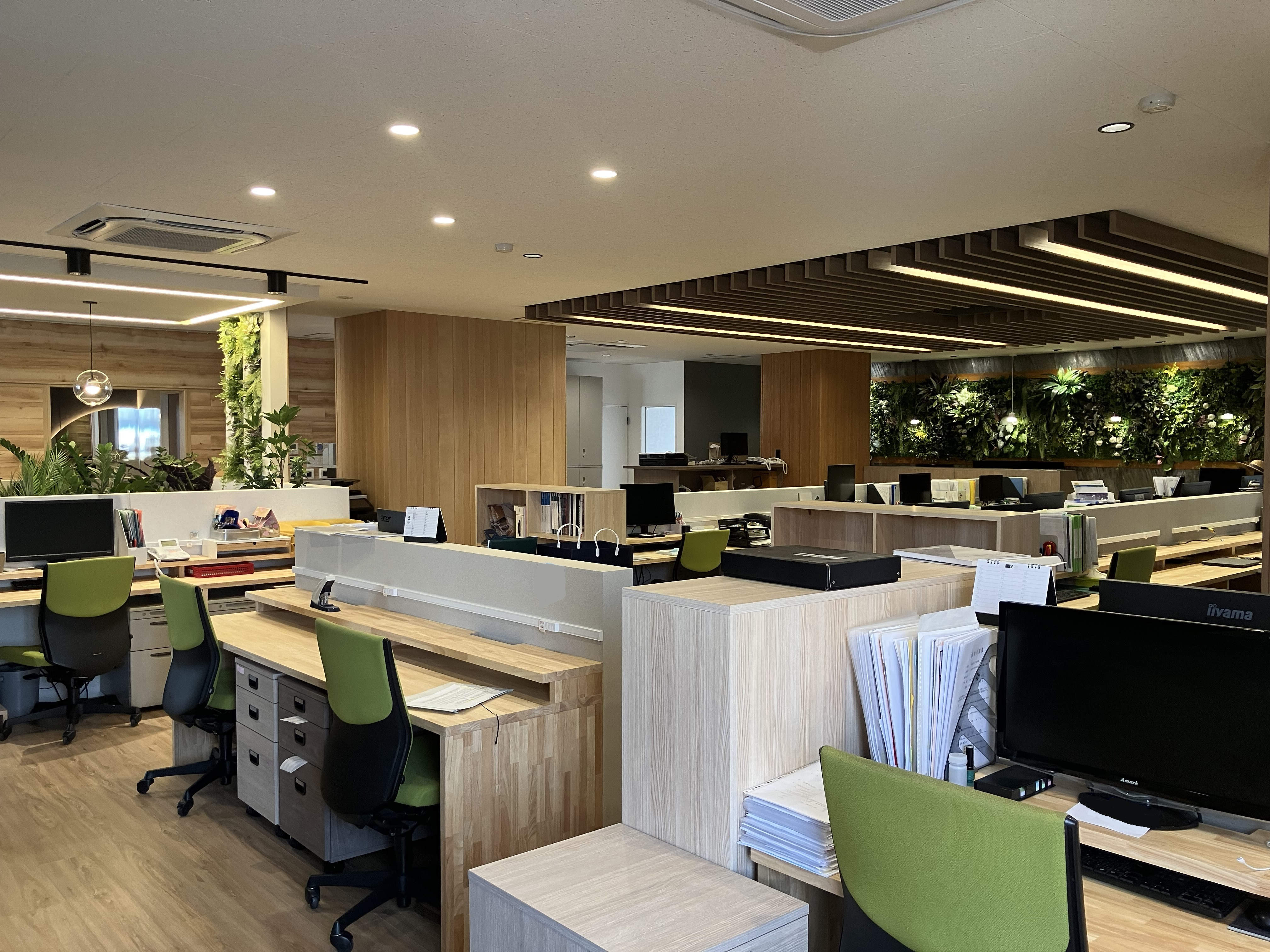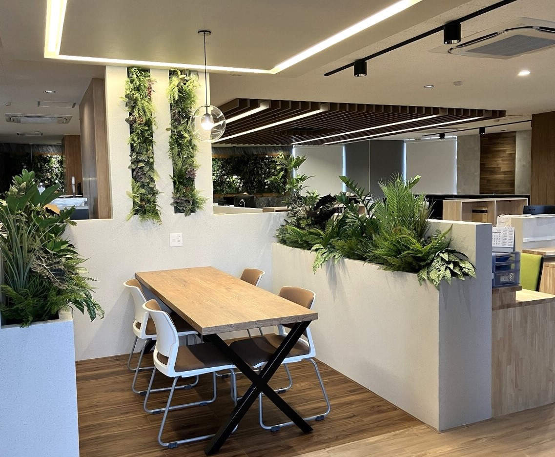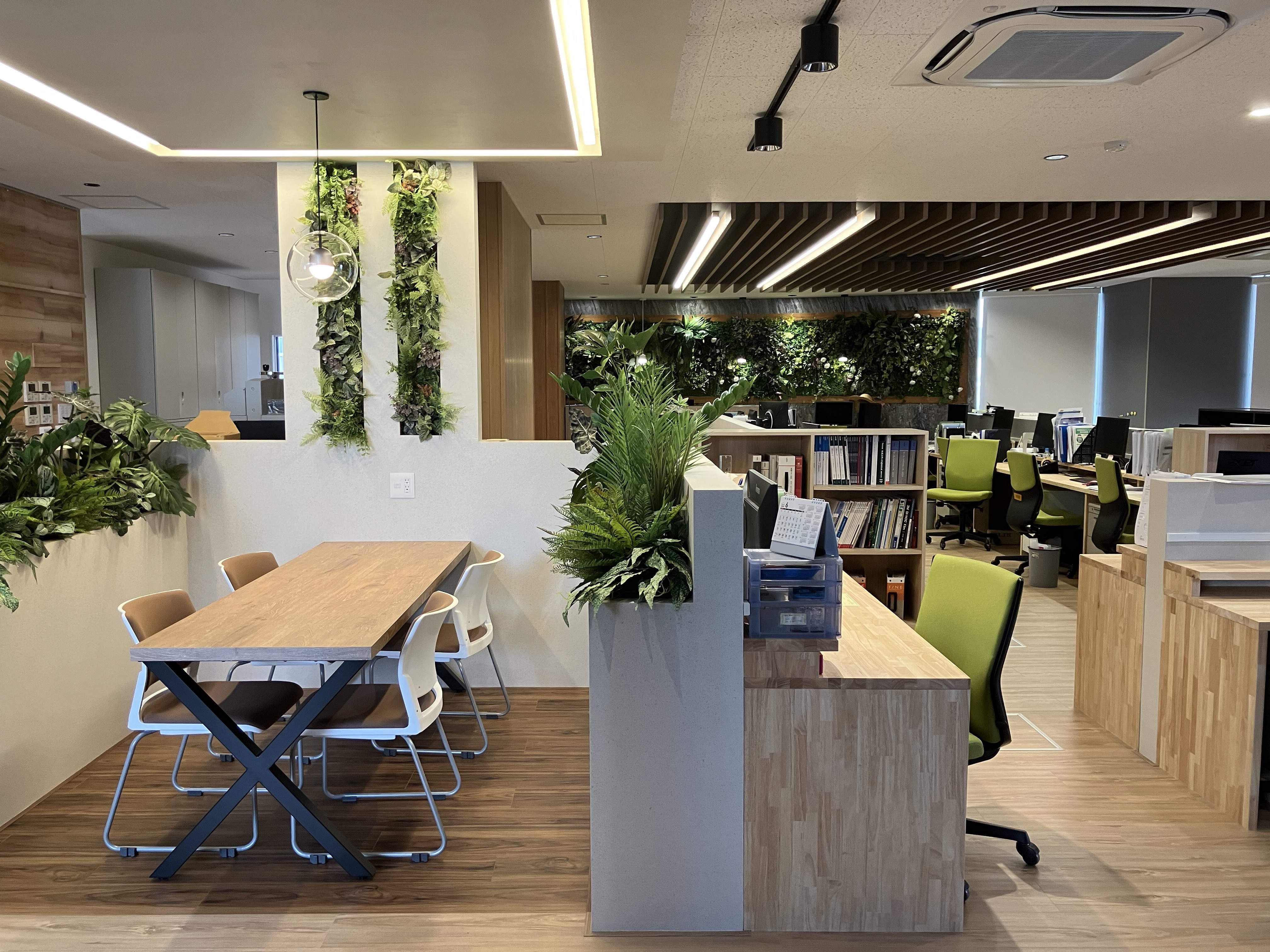オフィス内にグリーンを取り入れ開放的でリラックスのできる空間演出しています。