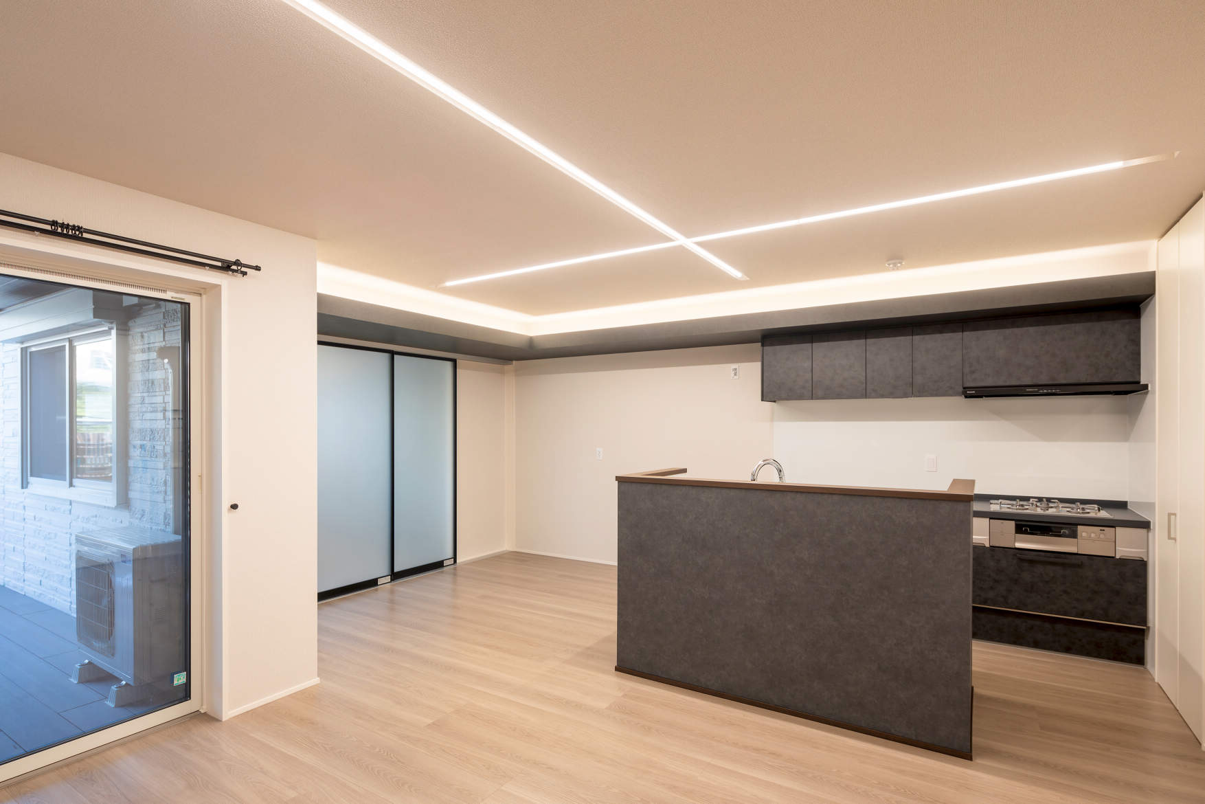 ダウンフロアになったリビングは、コーニス照明でタイル壁を引き立てています。