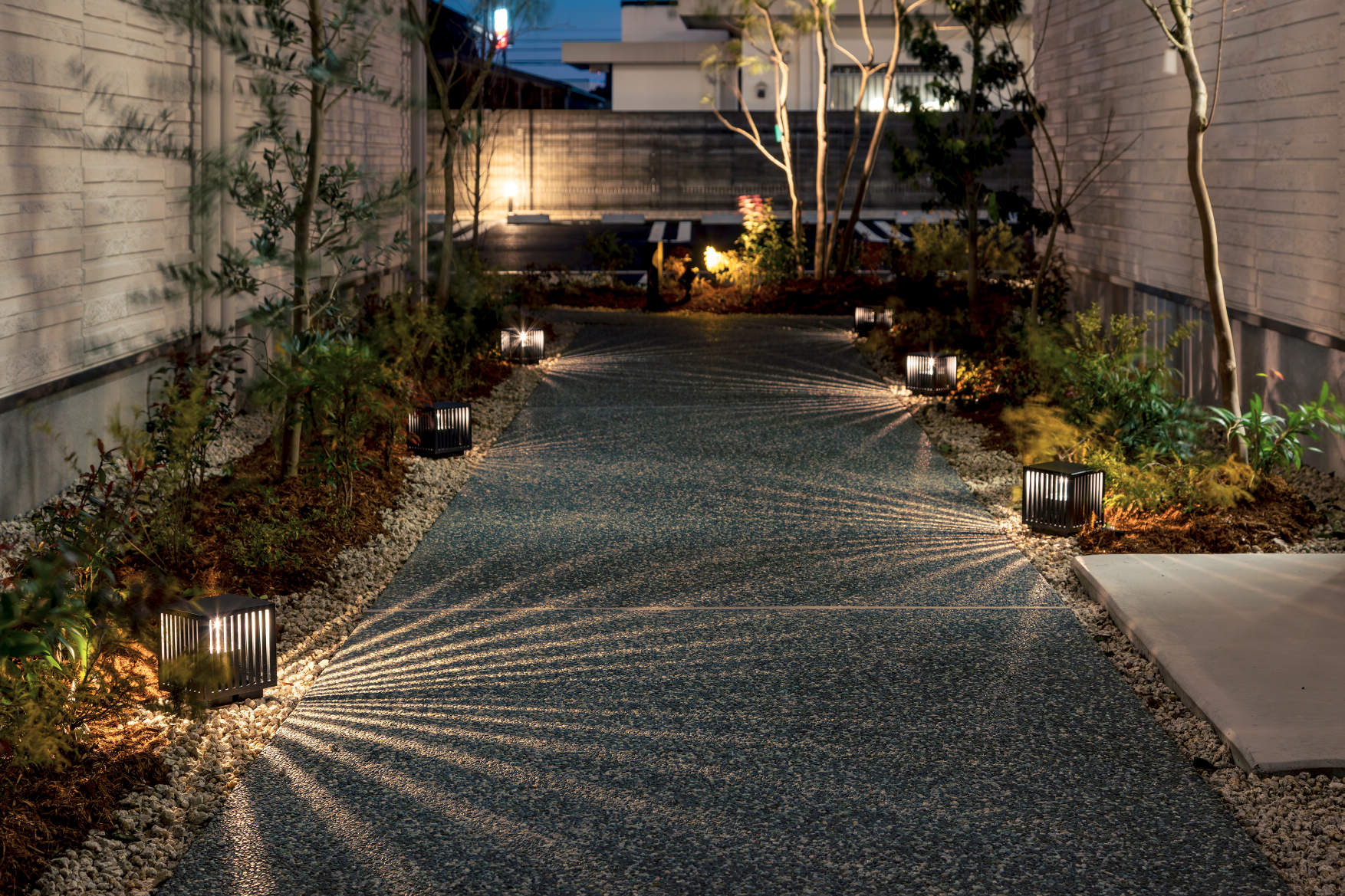 正面の植栽を照らすスポットライトとスリット光のスタンドは