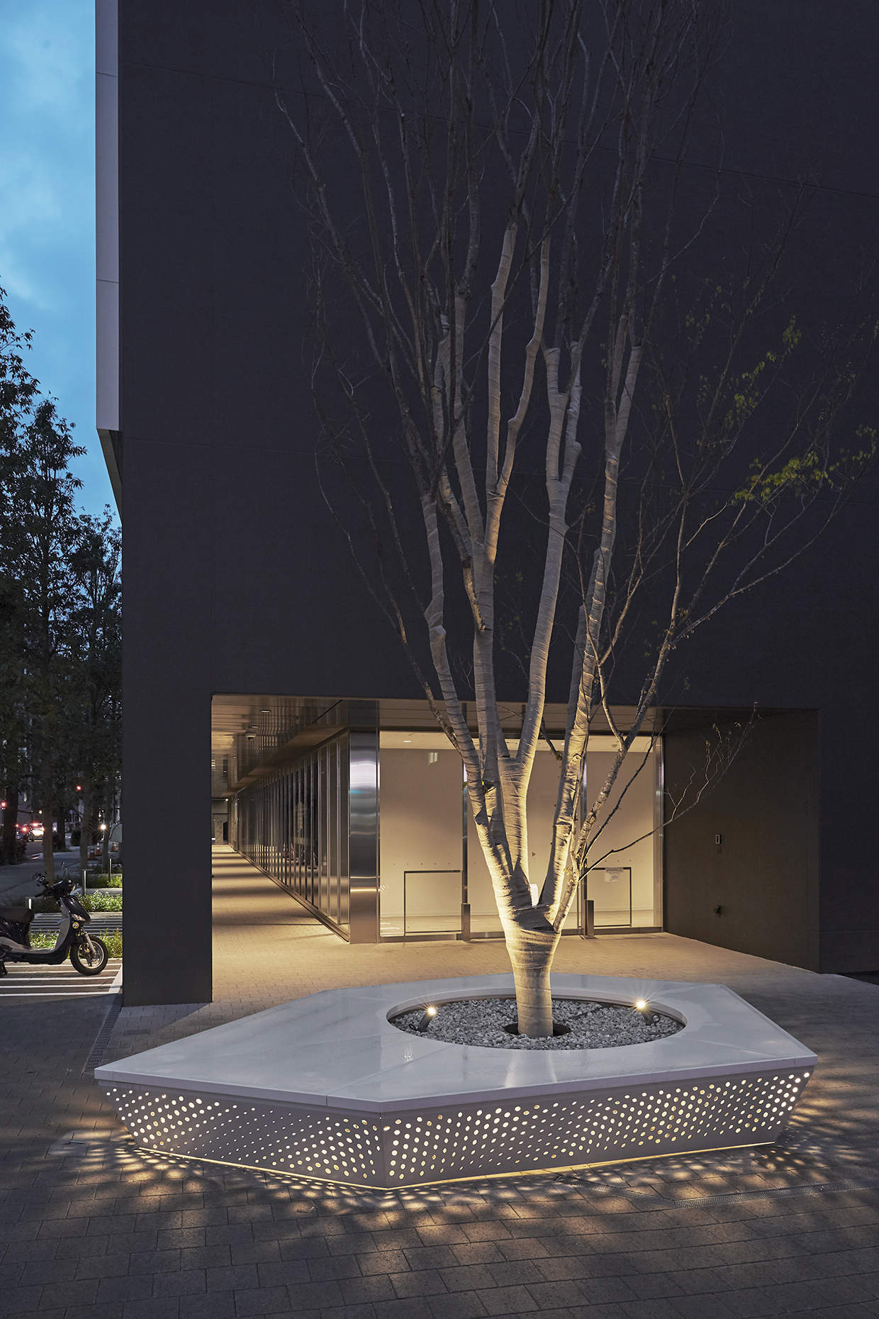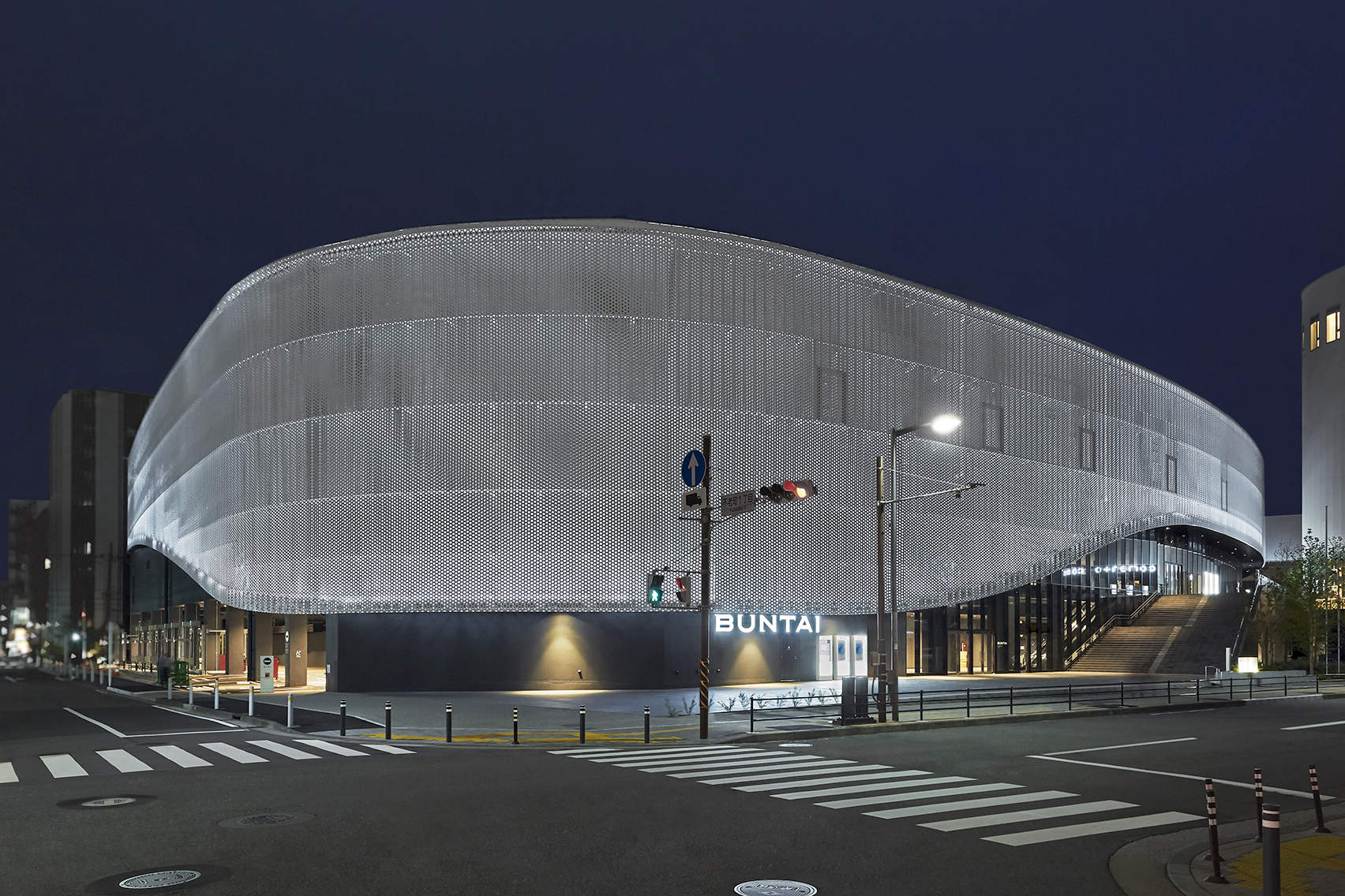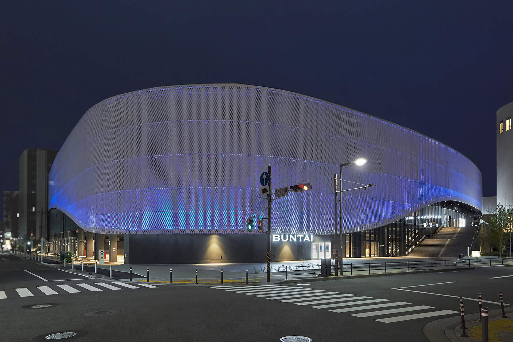 建物外観は横浜の浜風を受けて進む船の帆をコンセプトとして、曲線を取り入れたデザイン。外装アルミ板に80mmの穴を開け、内壁のドット模様を干渉させることで、移動すると帆がたなびくような視覚効果を与えています。また、外装板の裏側にライトアップ演出用照明器具「アーキライン」を組み込み、四季やイベントによりカラー演出を実施しています。ここで照明演出に用いたのがパナソニックのライトニングフロー。ライトアップ演出用「コントローラーAREAS」を手元のPCから遠隔制御することで、演出を確認しながら短時間で現場調整を完了します。これにより、屋外における調整作業の負担軽減が期待されます。