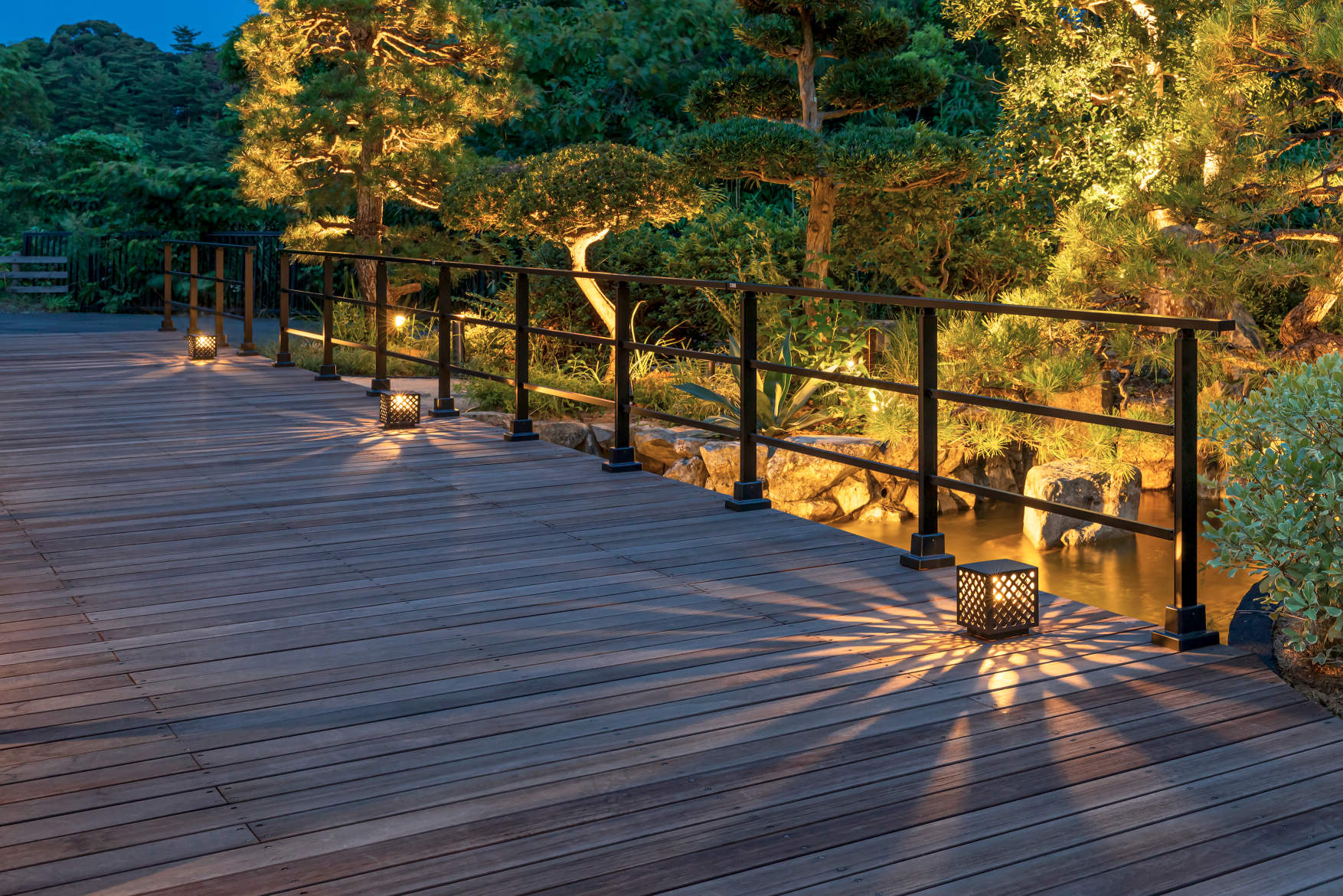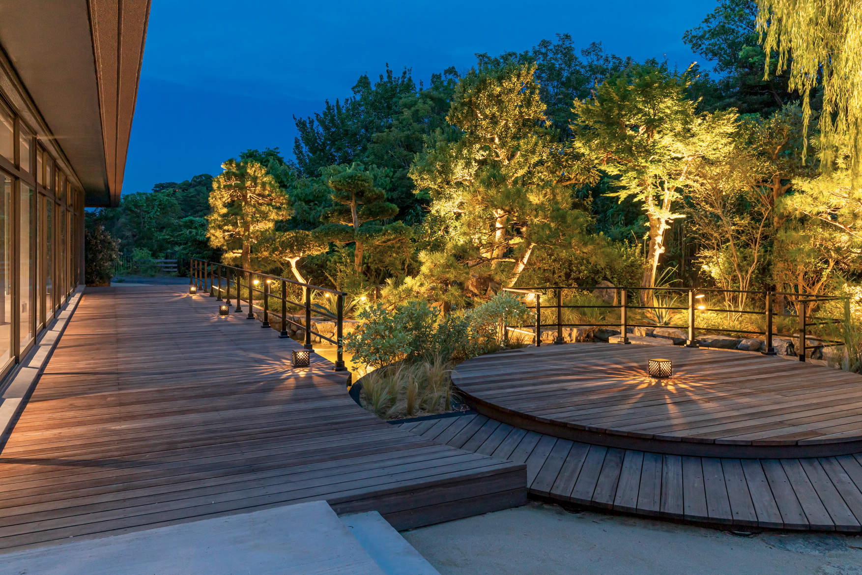 元の日本庭園の魅力を活かす形でデッキなどを設置。