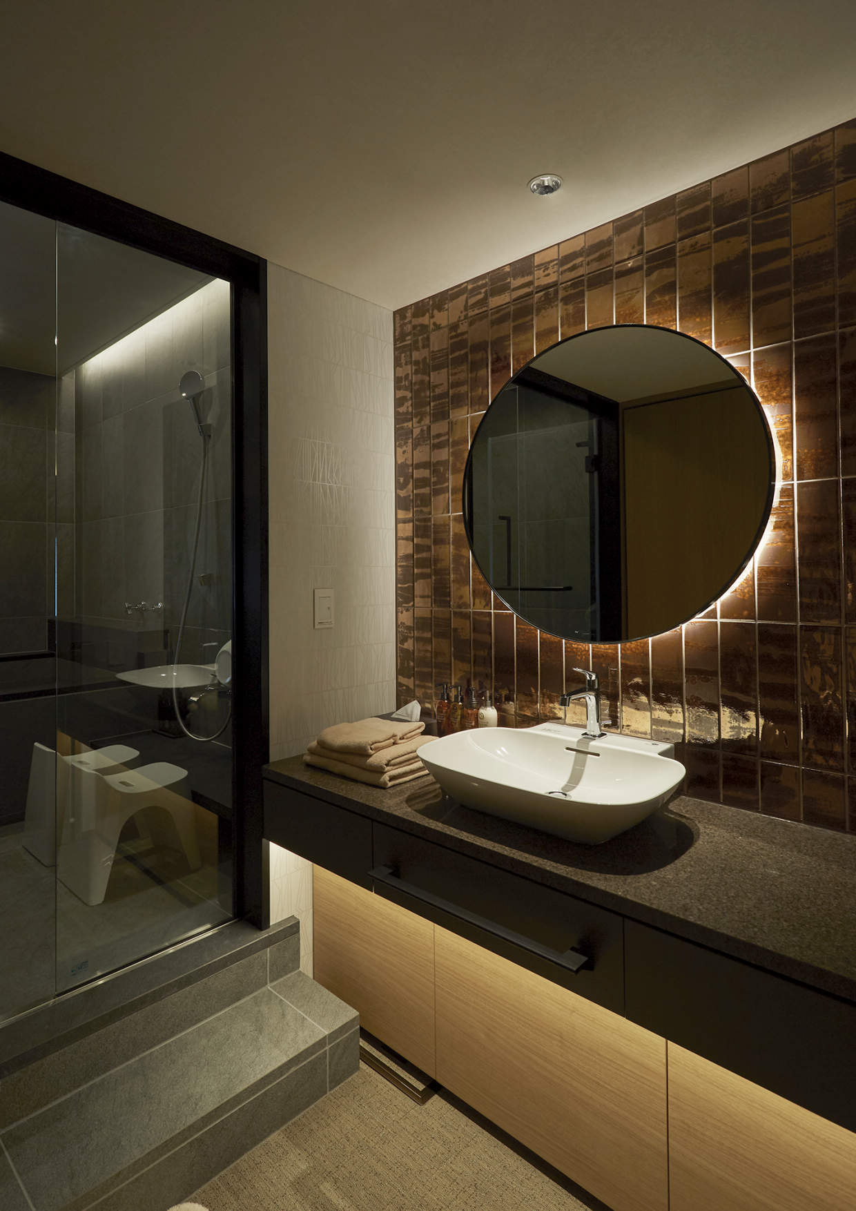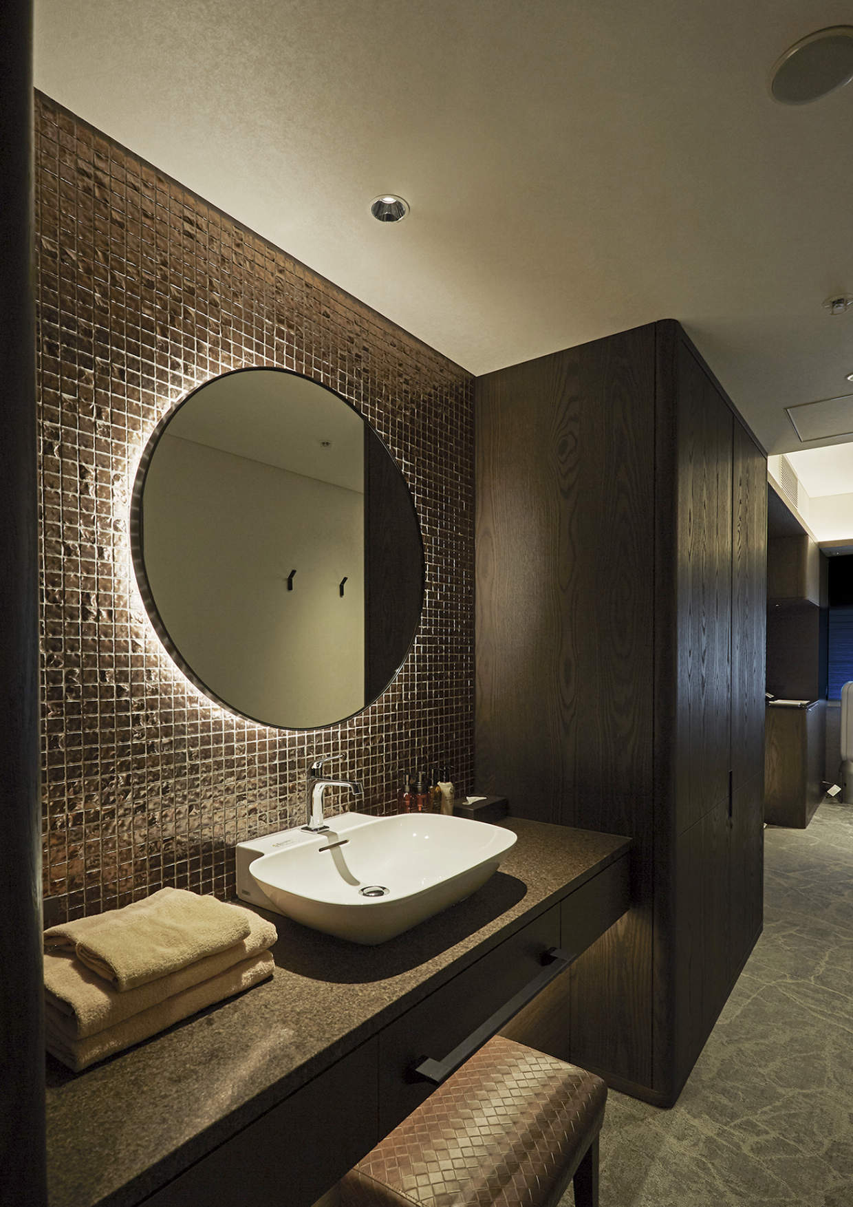 コンパクトな器具が円形ミラーの外周スリットに沿って曲線配置され、柔らかい拡散光で壁や天井を演出しています