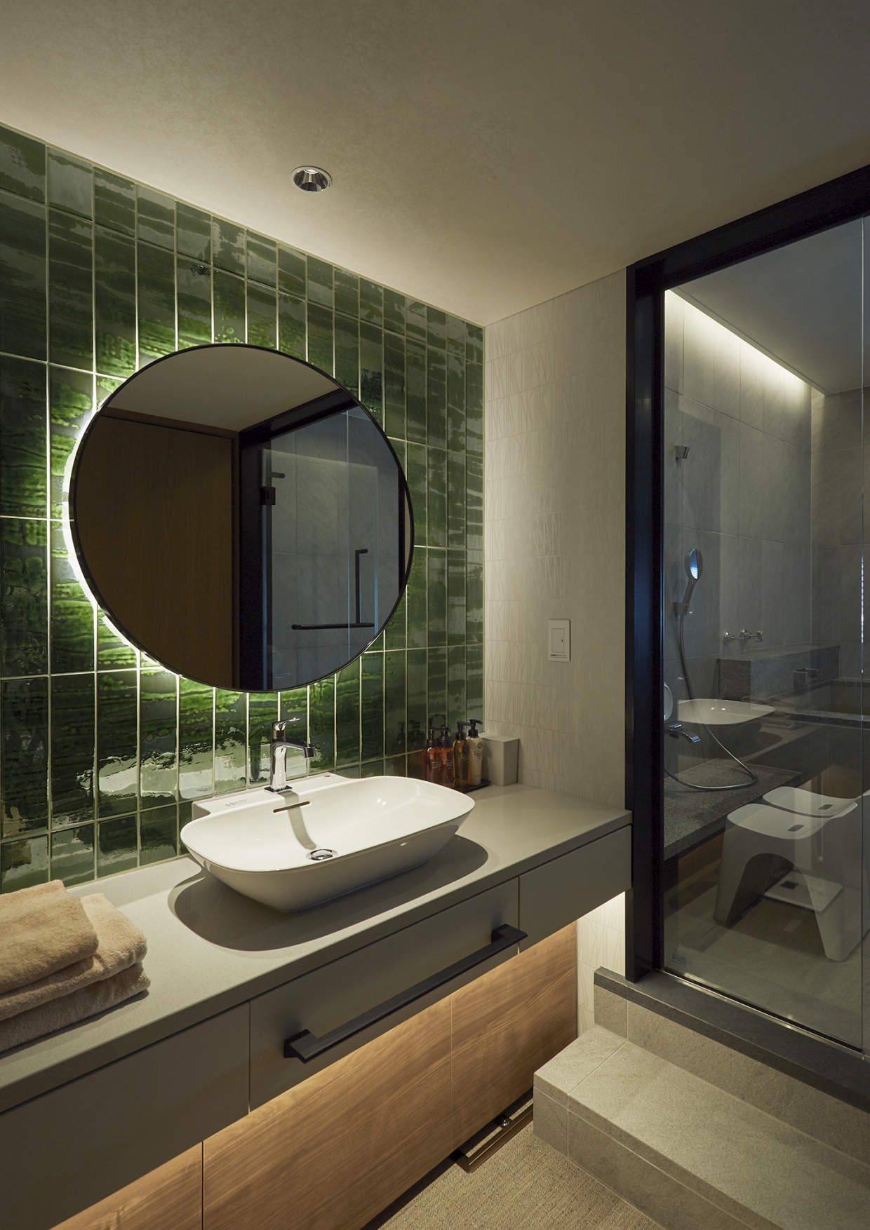 洗面器直上の「SmartArchiΦ75グレアレスダウンライト」がお客様のお顔をしっかりと照らします