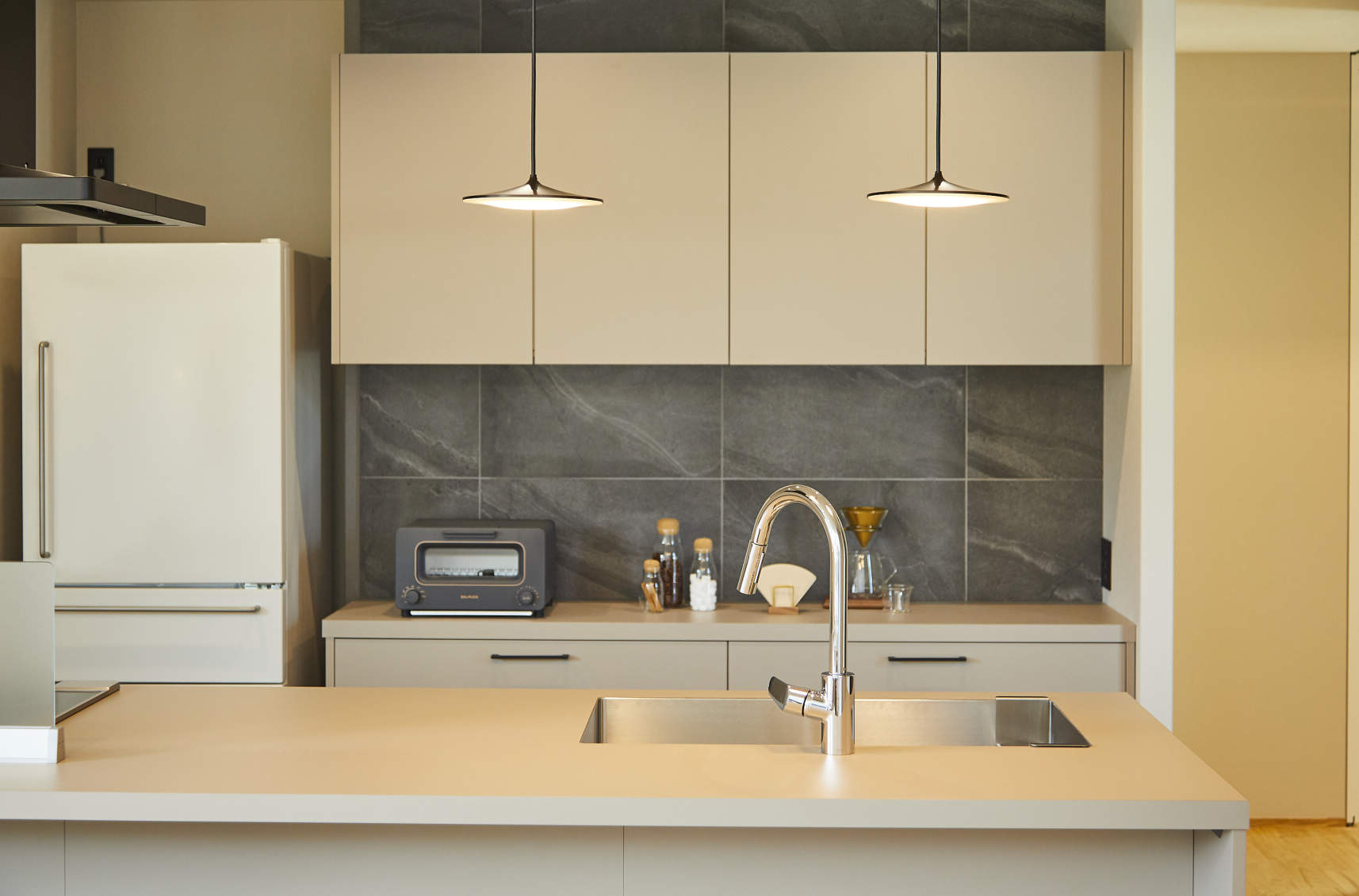 背面の石目調のタイルにも、ブラック色の配線器具を組み合わせた。単なる設備ではなく、デザイン要素としても機能している