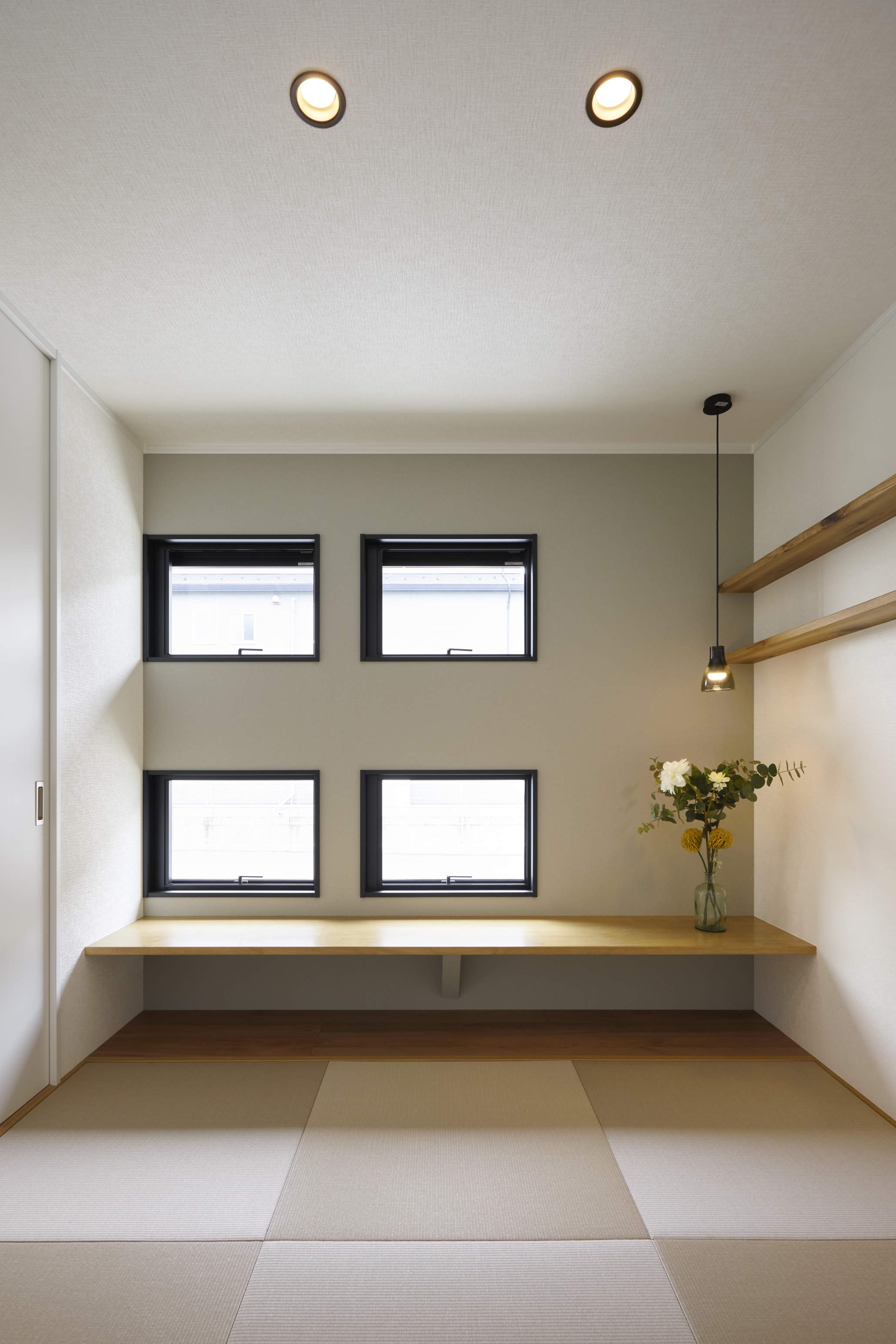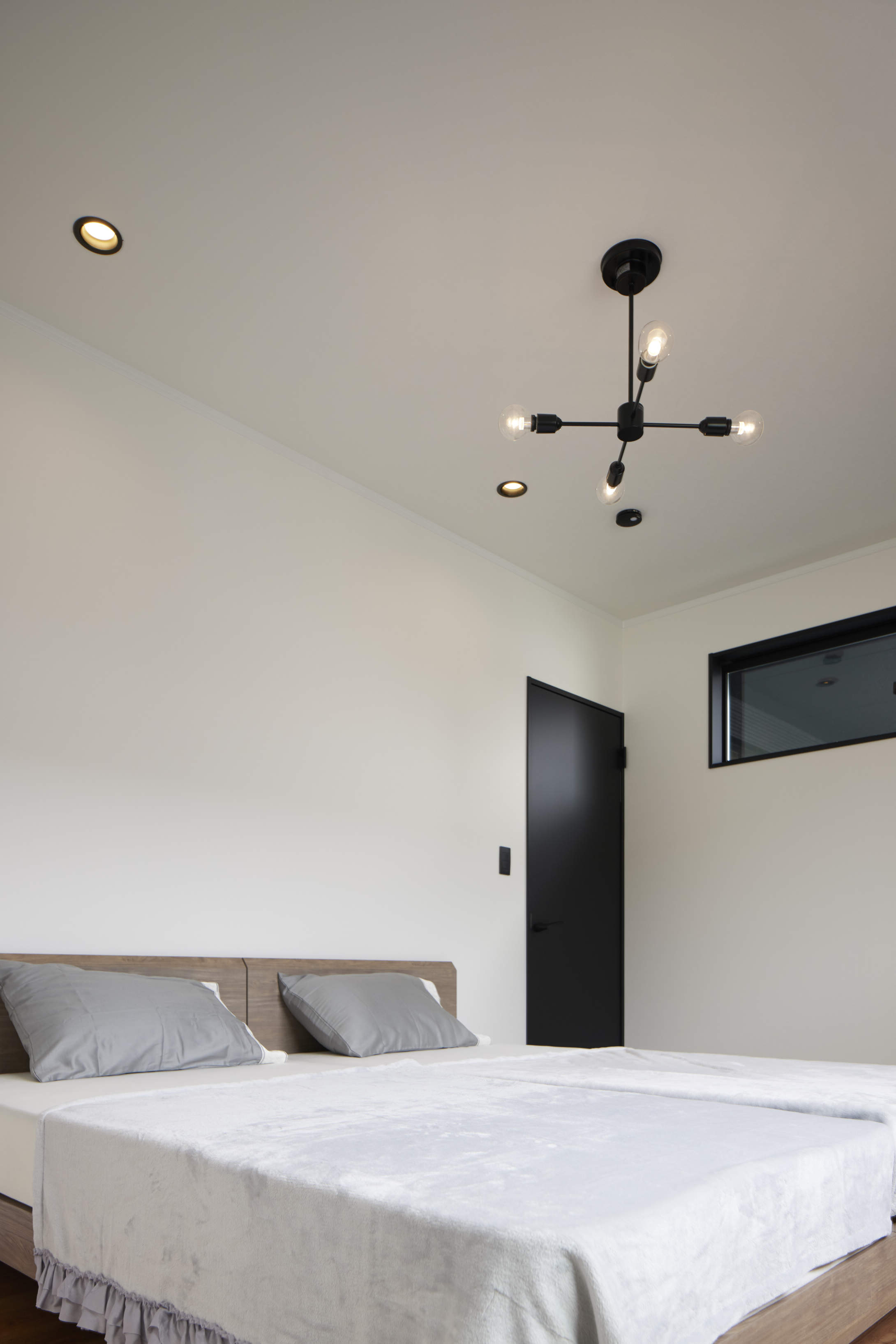 個性的な窓の配置による窓枠と、照明器具のブラック色との調和もポイント。