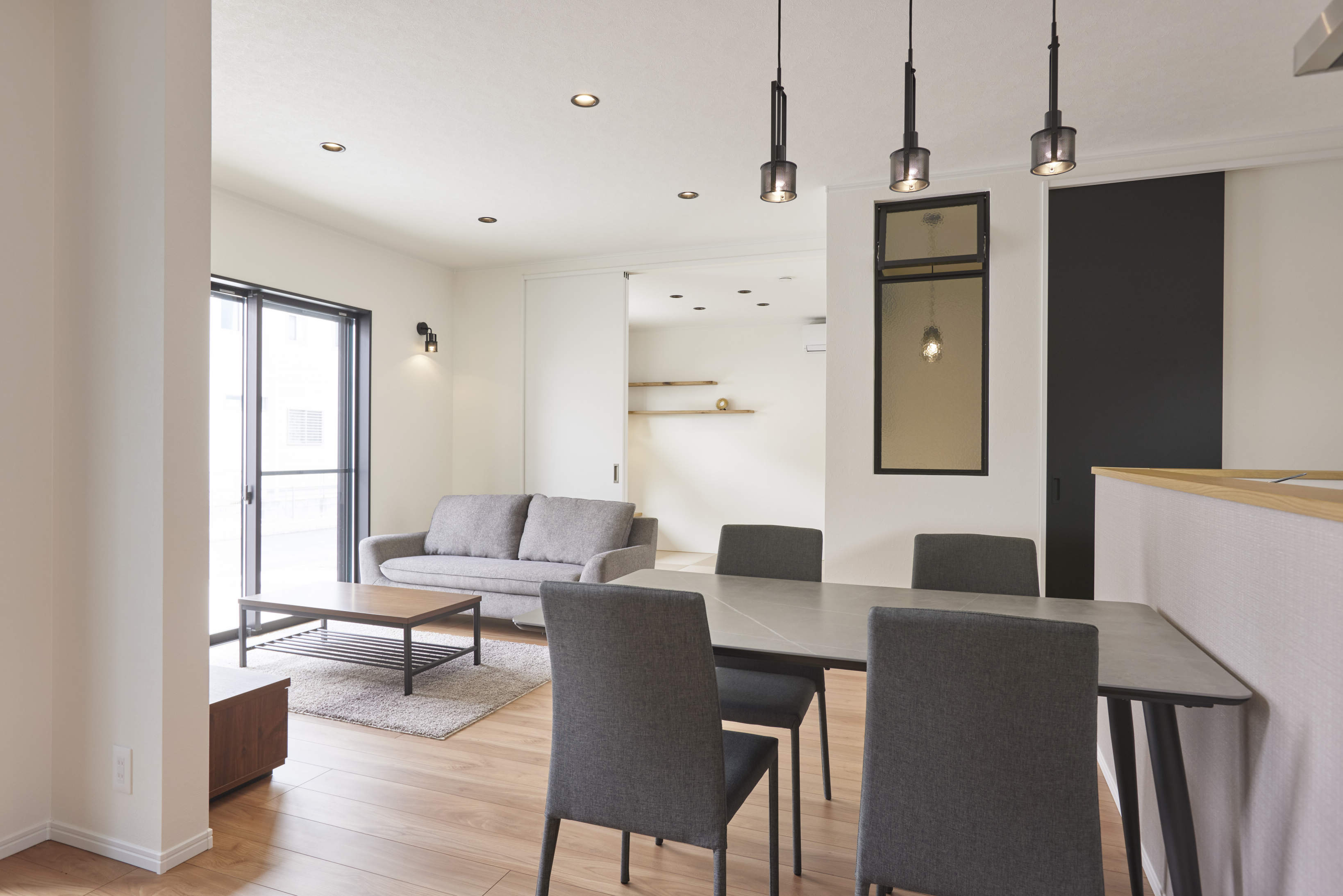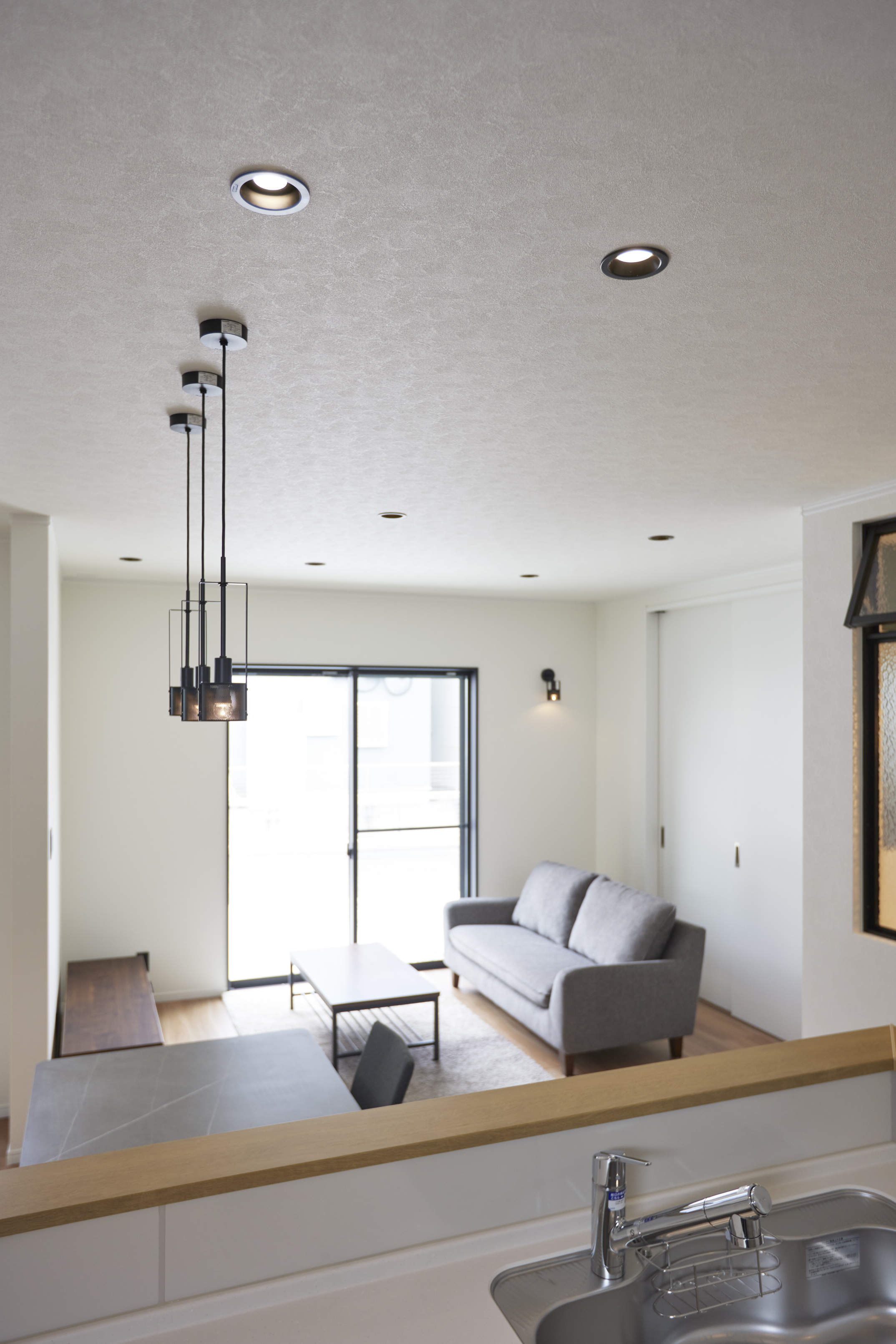 LDKでは、ダイニングテーブル上のペンダントライト、キッチンのダウンライト、リビング窓側のブラケットにブラック色を採用。