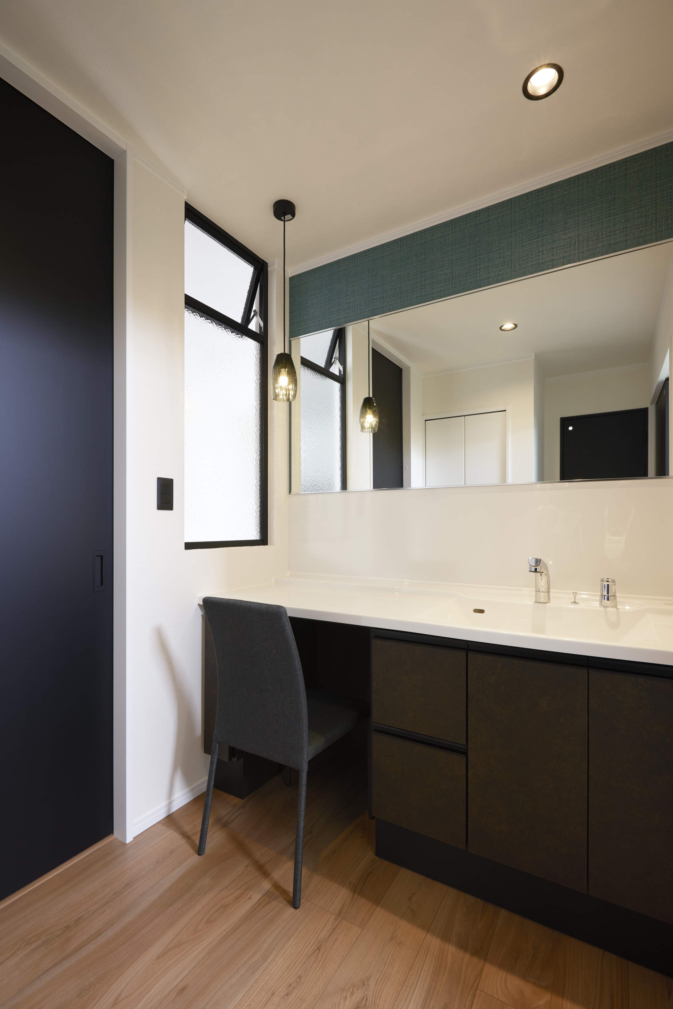 洗面スペースにはペンダントライトを採用。ガラスセードから発せられるレトロな光が美しい。通常、洗面室にはダウンライトを採用することが多いが、あえてデザイン性をプラスする狙い。