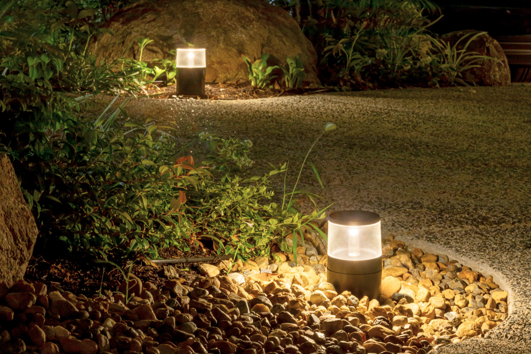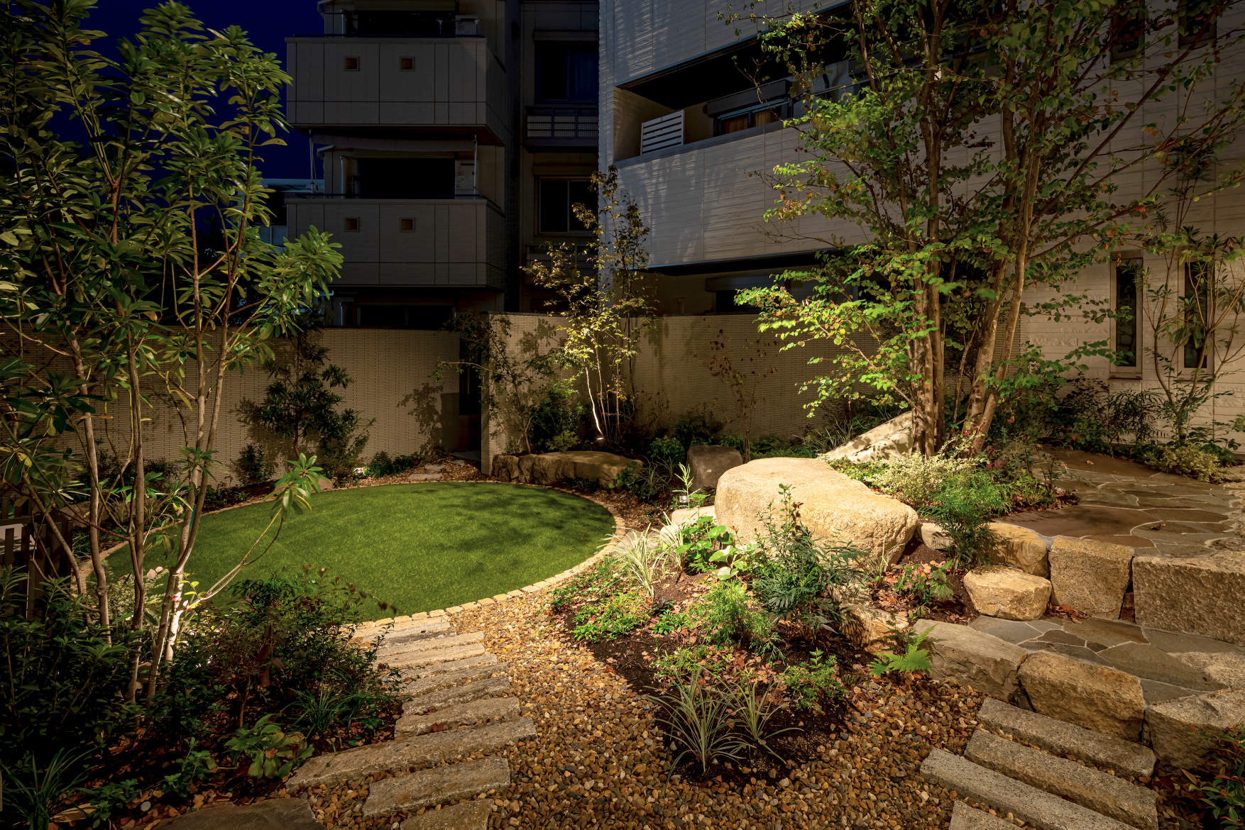 多くの植栽や造作をご用意されている中で、夜間を彩る照明にもこだわられました。