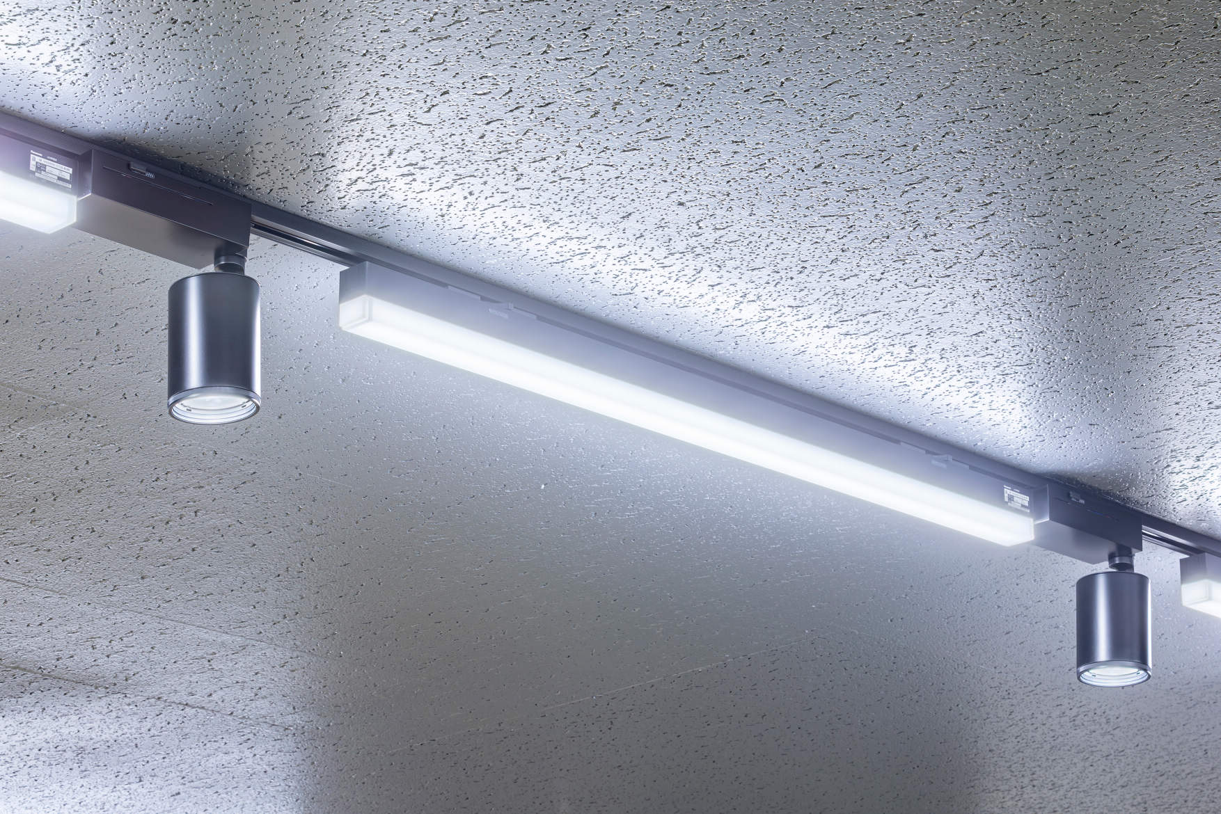 黒を基調とした天井に配線ダクトタイプのsBシリーズとスポットライトを部屋全面に設置することで、メリハリのある落ち着いた空間に仕上げながらも、連結したiDシリーズで壁面を照らすことで明るさ感を損なわない設計に。”心の豊かさとエコの両立“を体現した新しい空間をご体感いただけます。