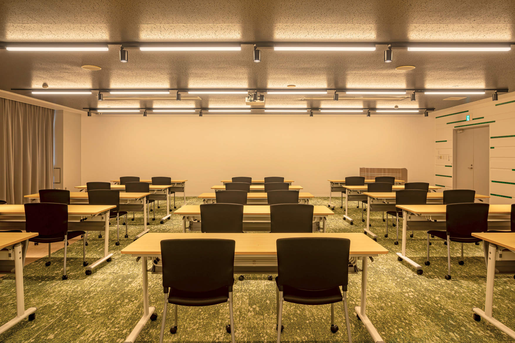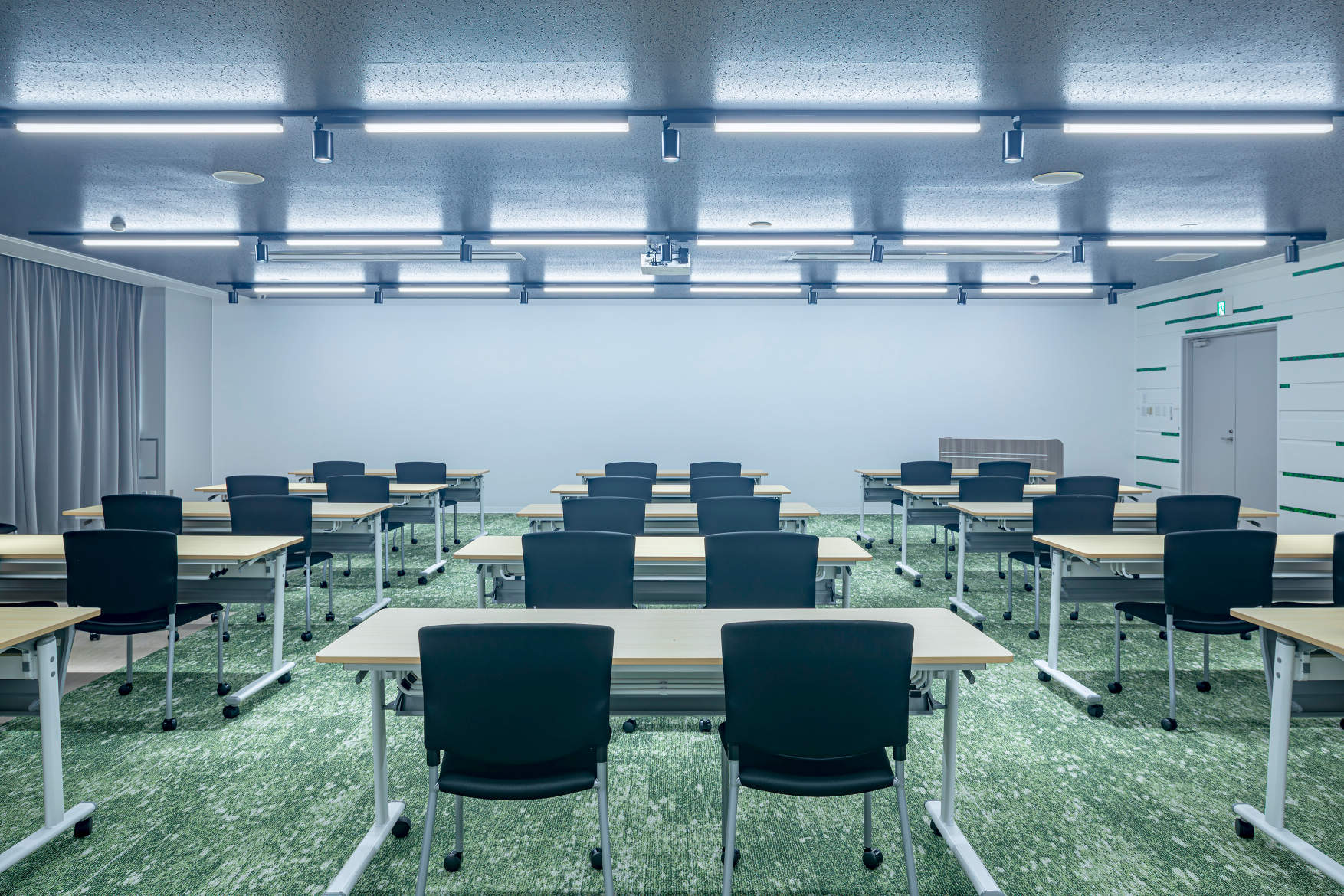 隣接ショールームは、コンセプトである"GREEN&TECHNOLOGY"をイメージし、LiBecoMを用いた照明シーンの切り替えで用途に合わせたフレキシブルな空間を演出。