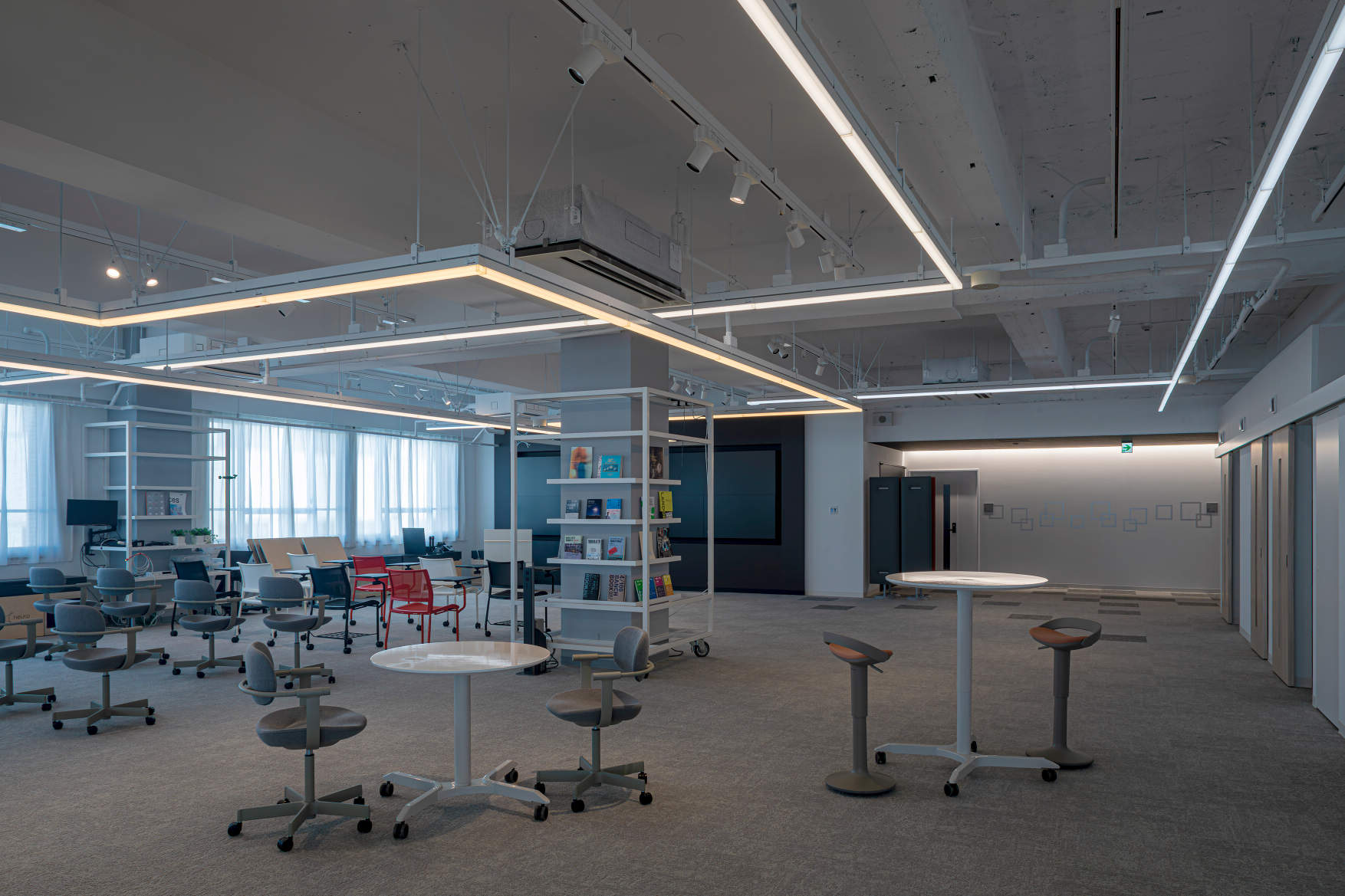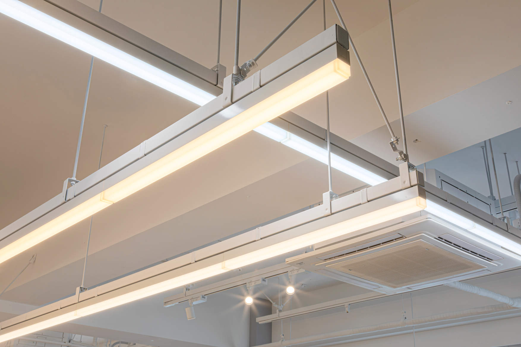 シンプルな形状のベースライトを採用。空間コンセプト「DIGTAL JUNCTION」をイメージし、天井面に「光のライン(5000K/4000K/3500K/3000K)」を描きます。空間のベースとなる「フラットな明るさ」を作りつつ、メリハリのある光と光の色が異なるラインで、近未来的な雰囲気を演出します。