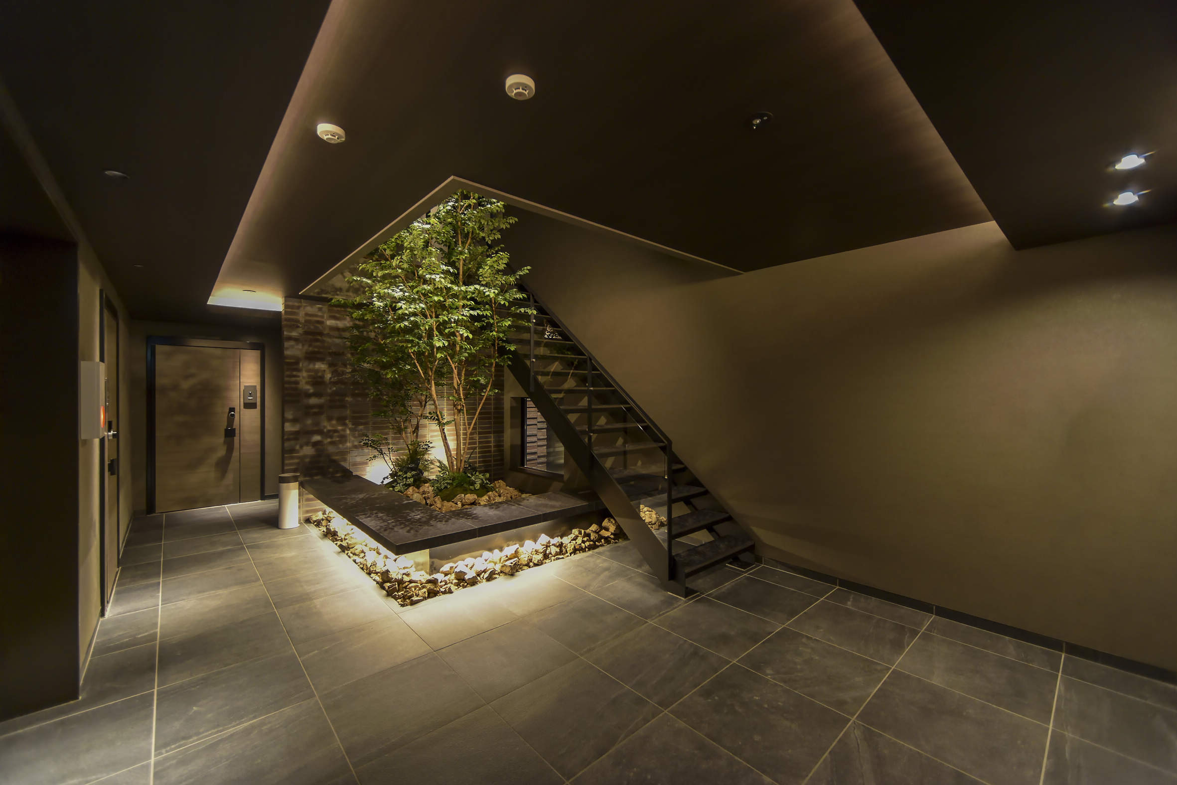 エントランス横の植栽は、夜間もラウンジから庭を楽しめる様に