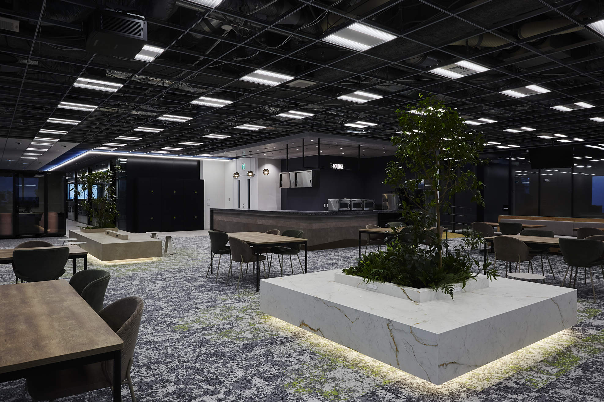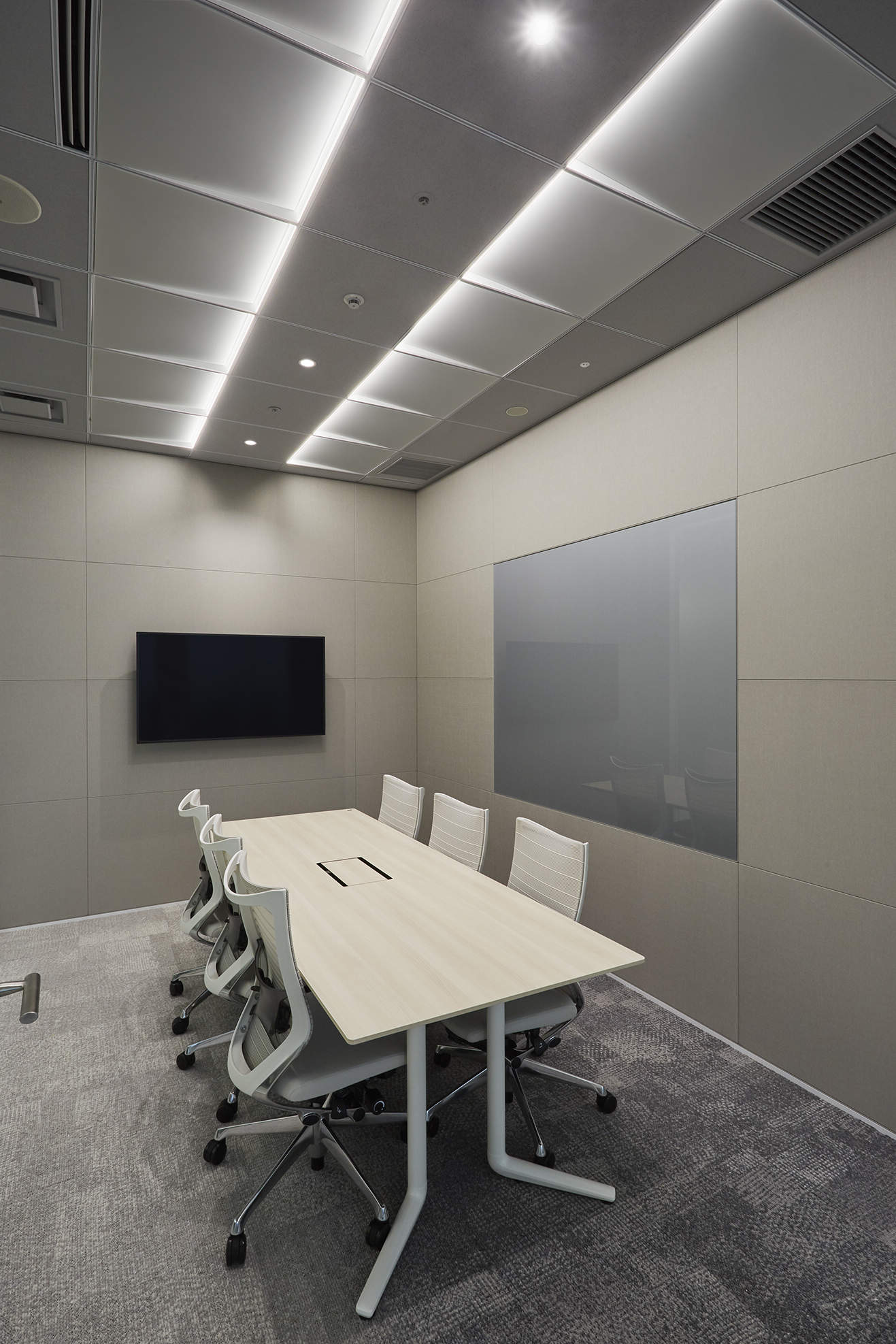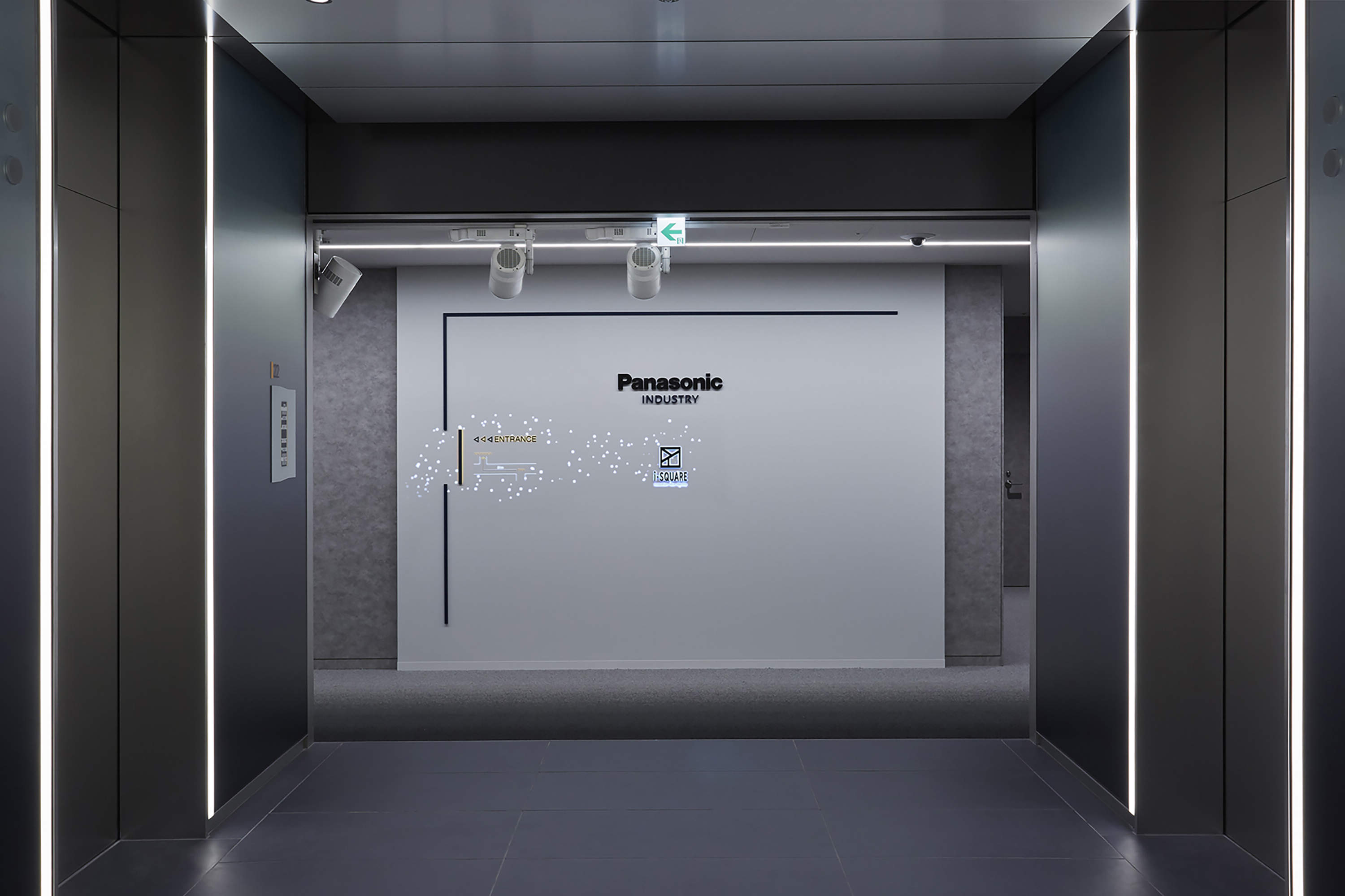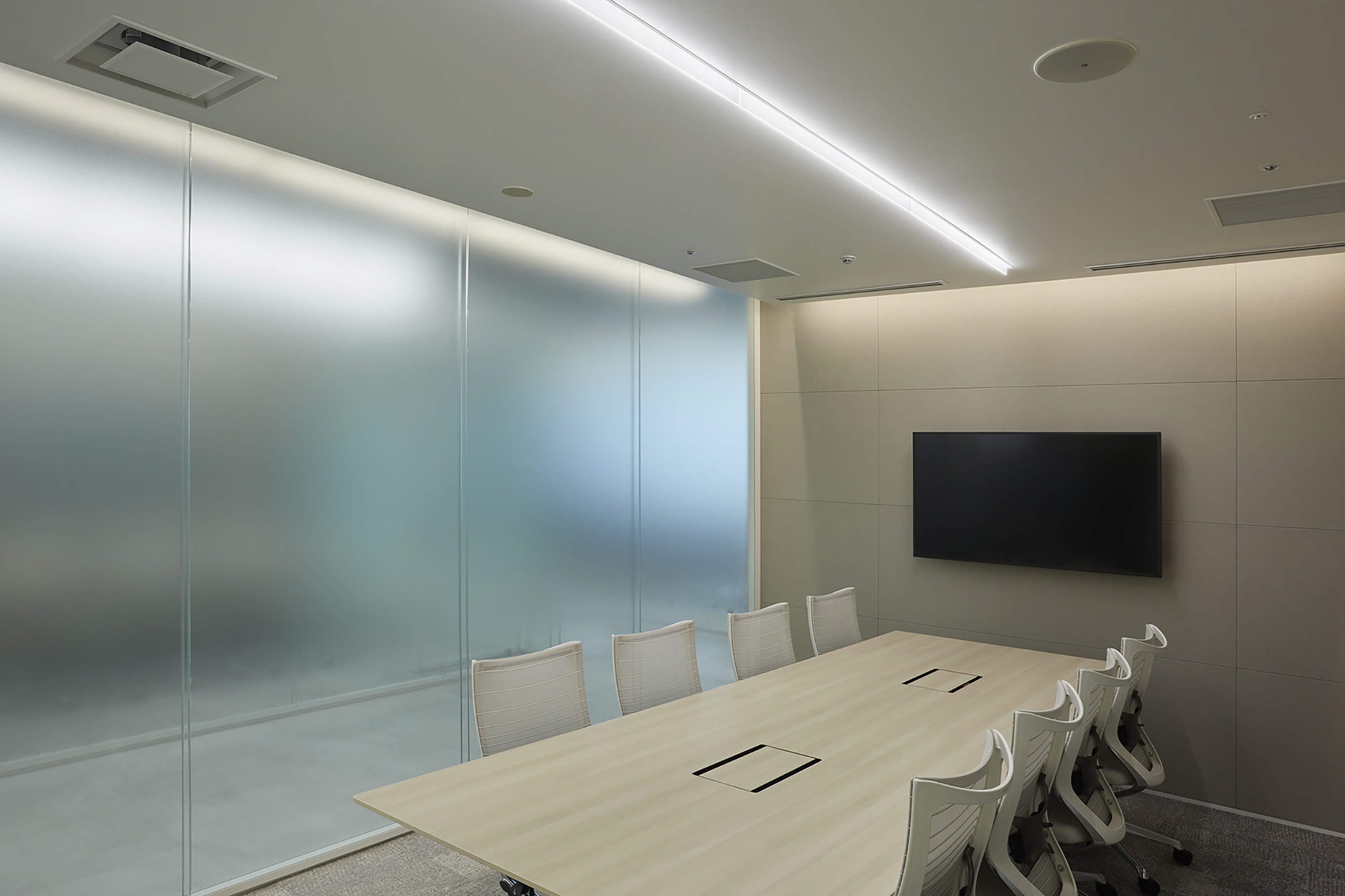 ライン照明はビル基準の他社商品を調光で明るさを調整して映像を映える様にしている。