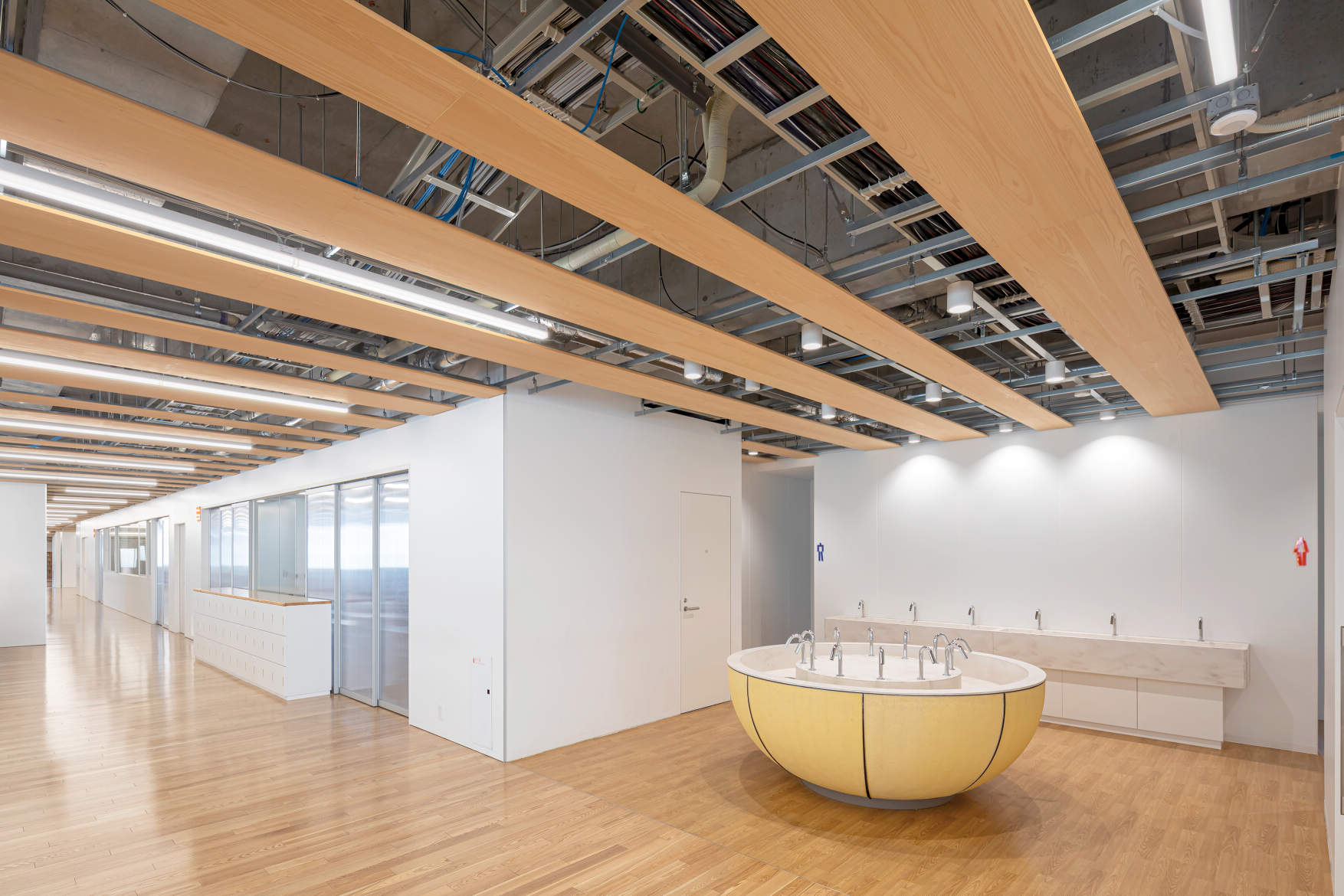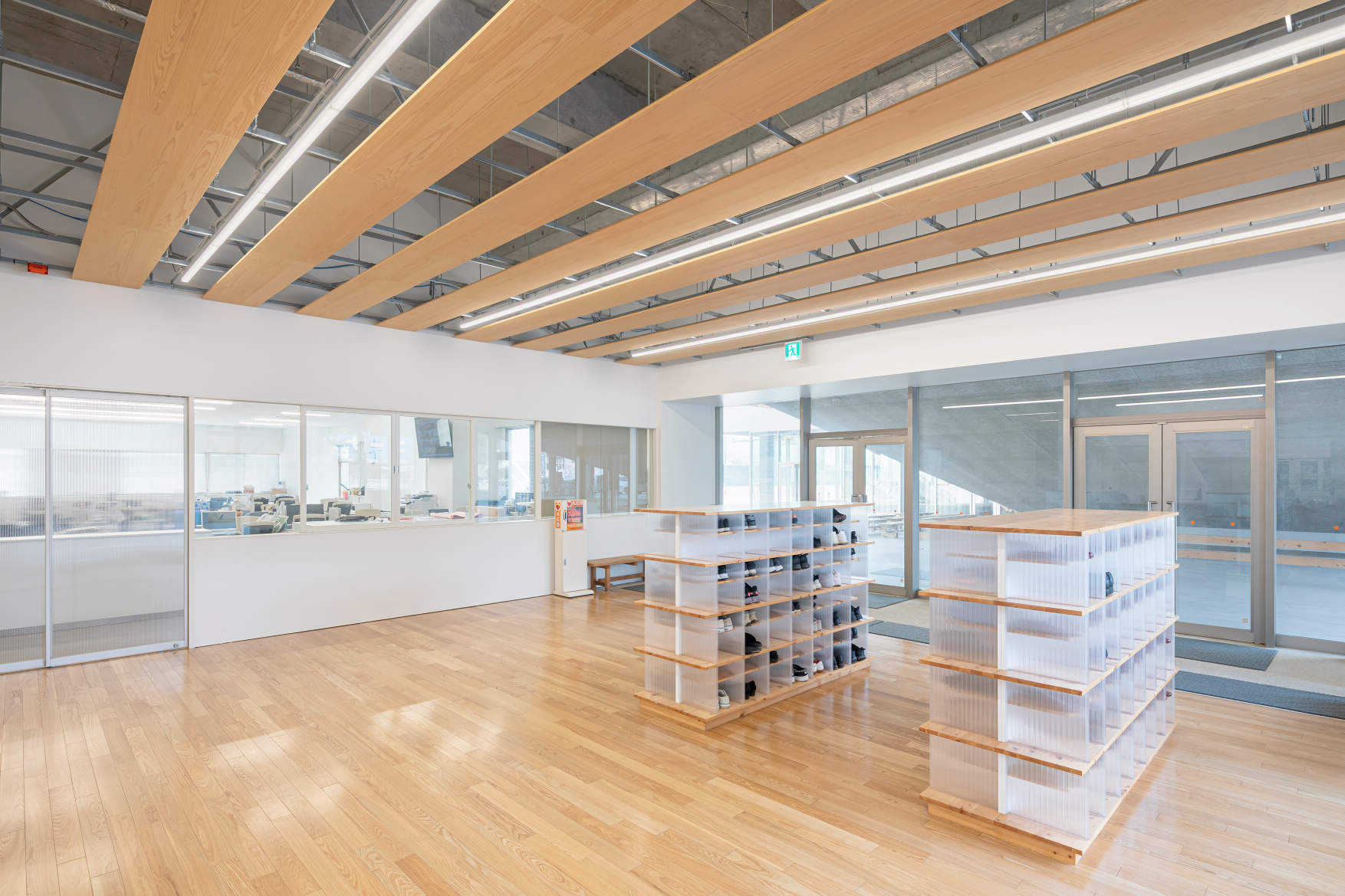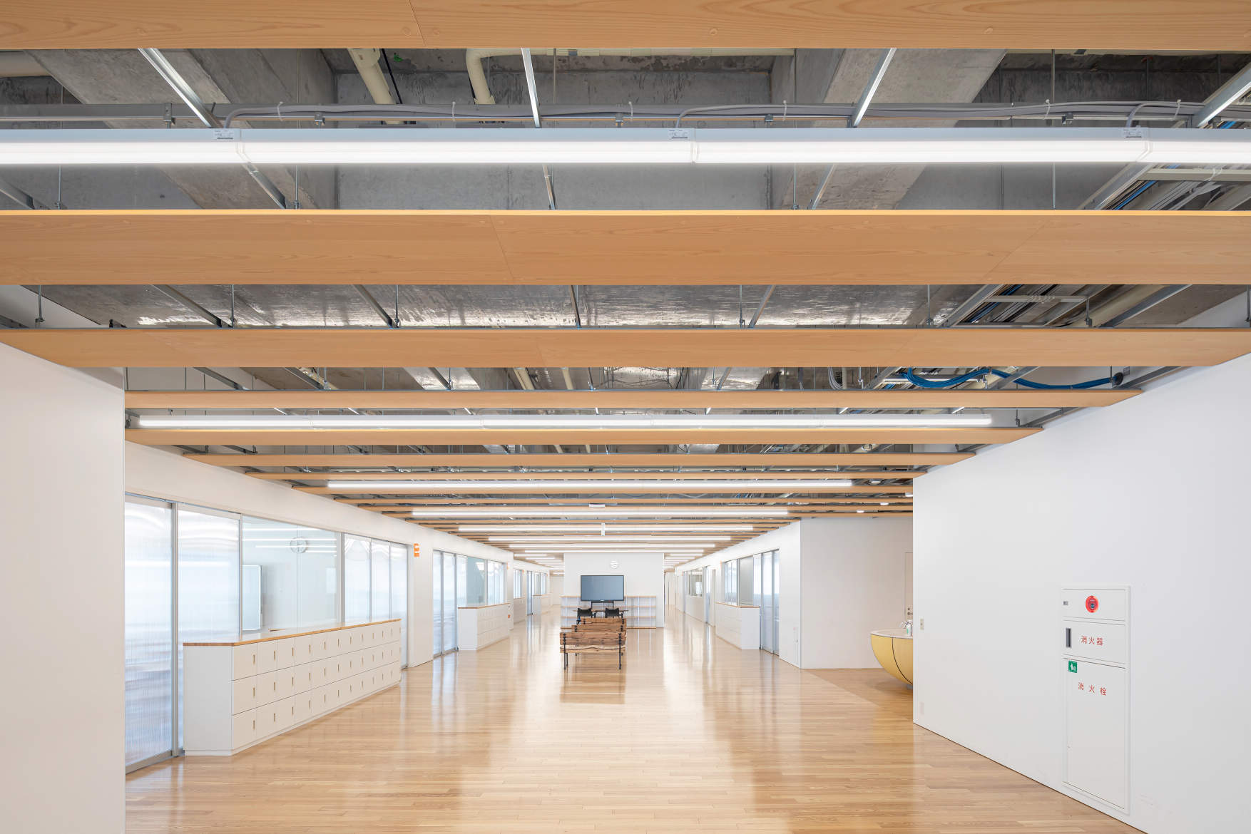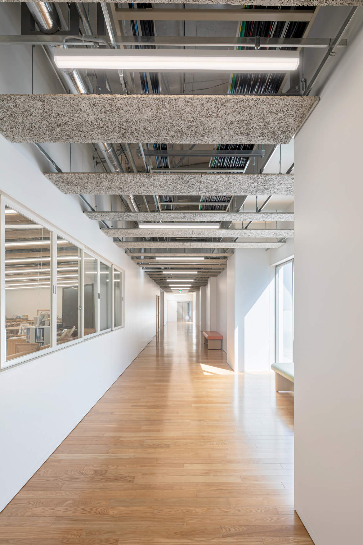スリット天井の溝にsBシリーズベースライトを埋め込むことによって、明るさを保ちつつスタイリッシュな印象に手掛けられ、オープンスペースや廊下に採用されています。