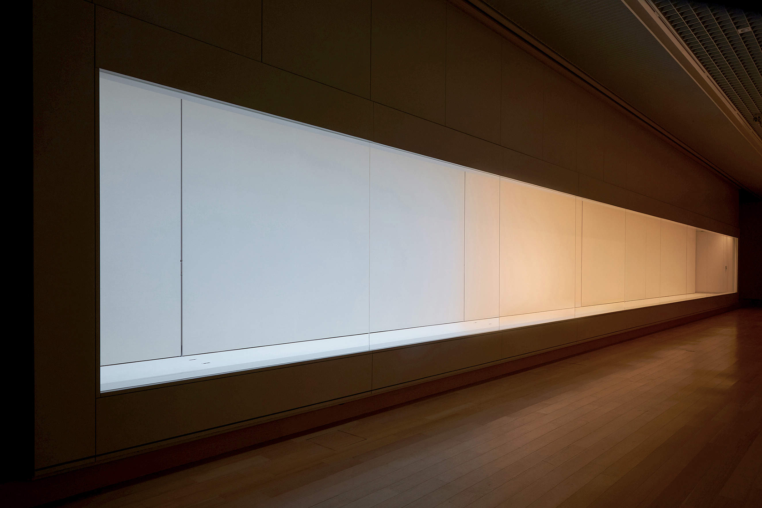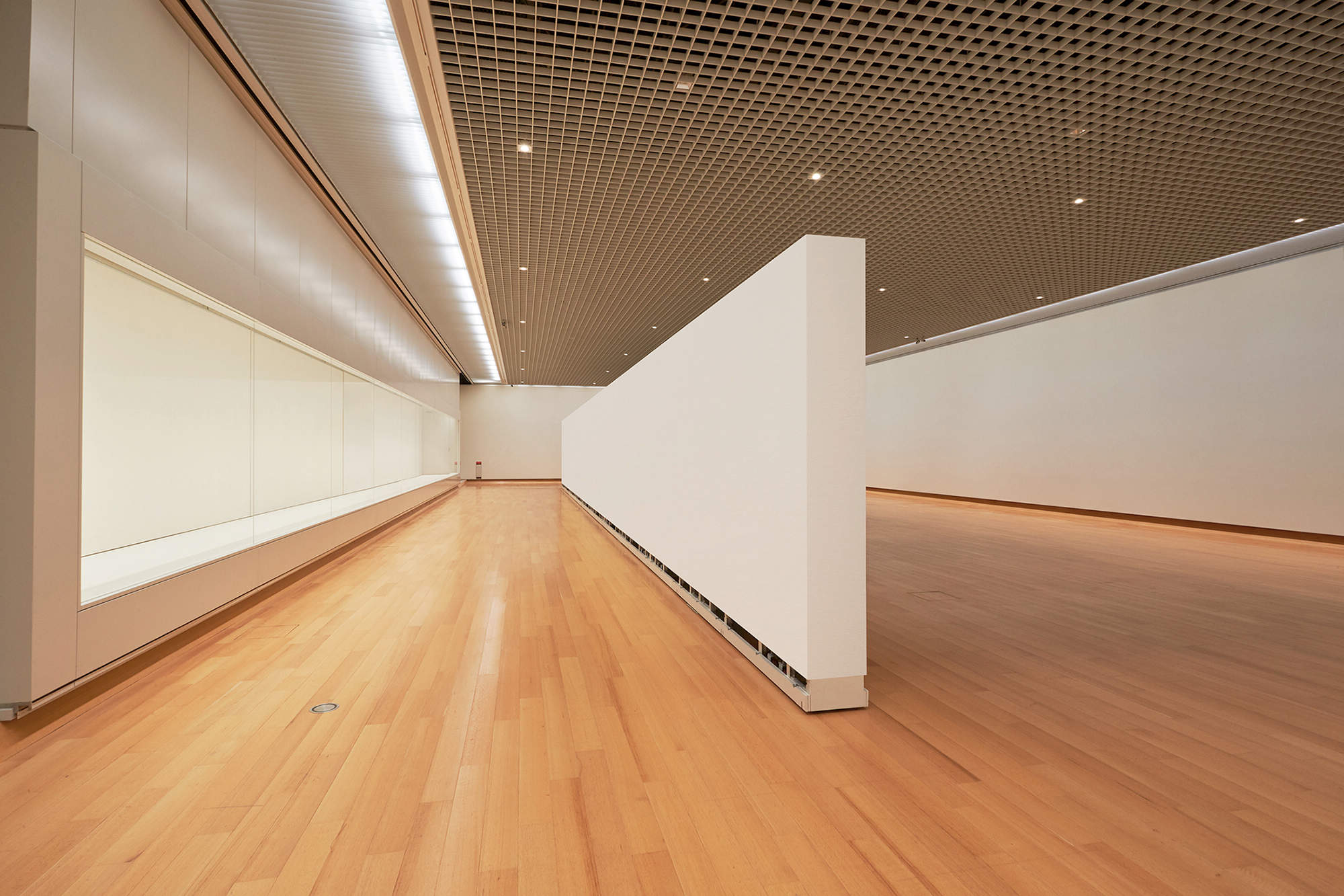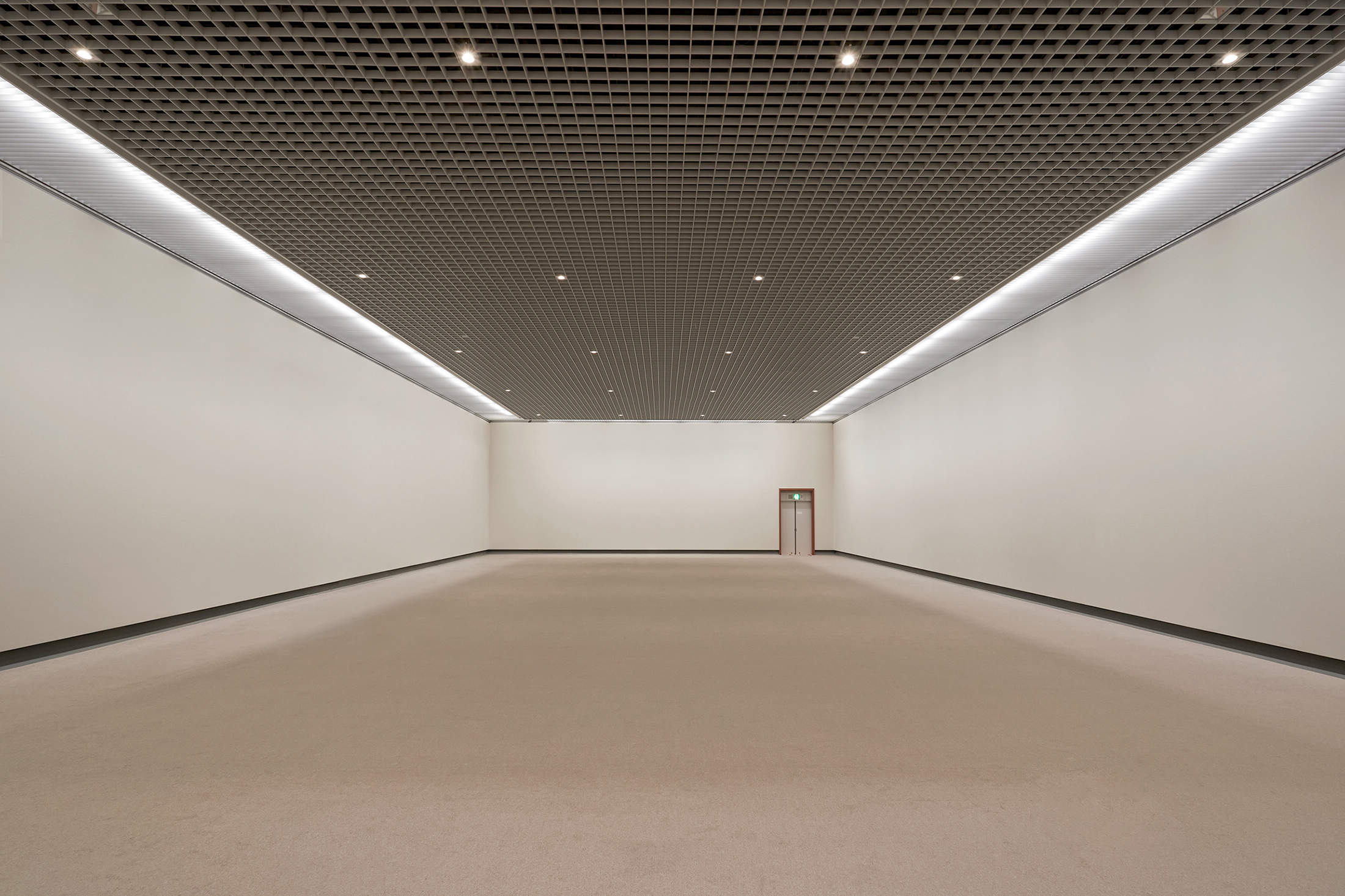 空間全体に特注ウオールウオッシャと特注埋込型LEDダウンライトをグリッド状に配置し、均一で柔らかい光環境を実現。高演色と省エネ性を兼ね備えたLED照明で、来館者に快適な鑑賞体験を提供します。