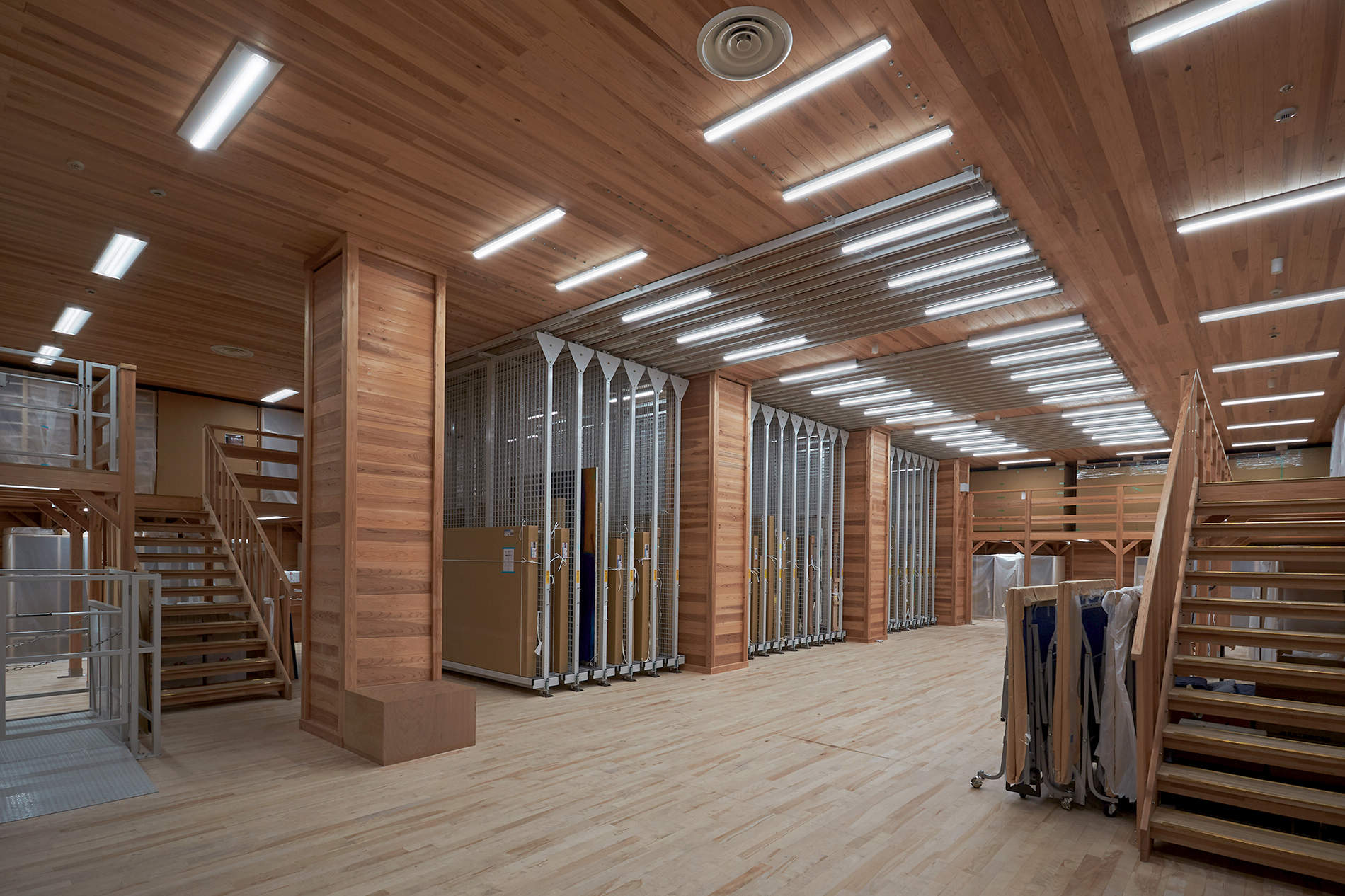 天井にグレアセーブタイプのLED照明を均等に配置し、空間全体を明るく照らしています。これにより、影が少なく視認性の高い環境が確保され、作業や展示準備が効率的に行えます。階段やメザニン部分にも光が届くように設計し、安全性にも配慮しています。