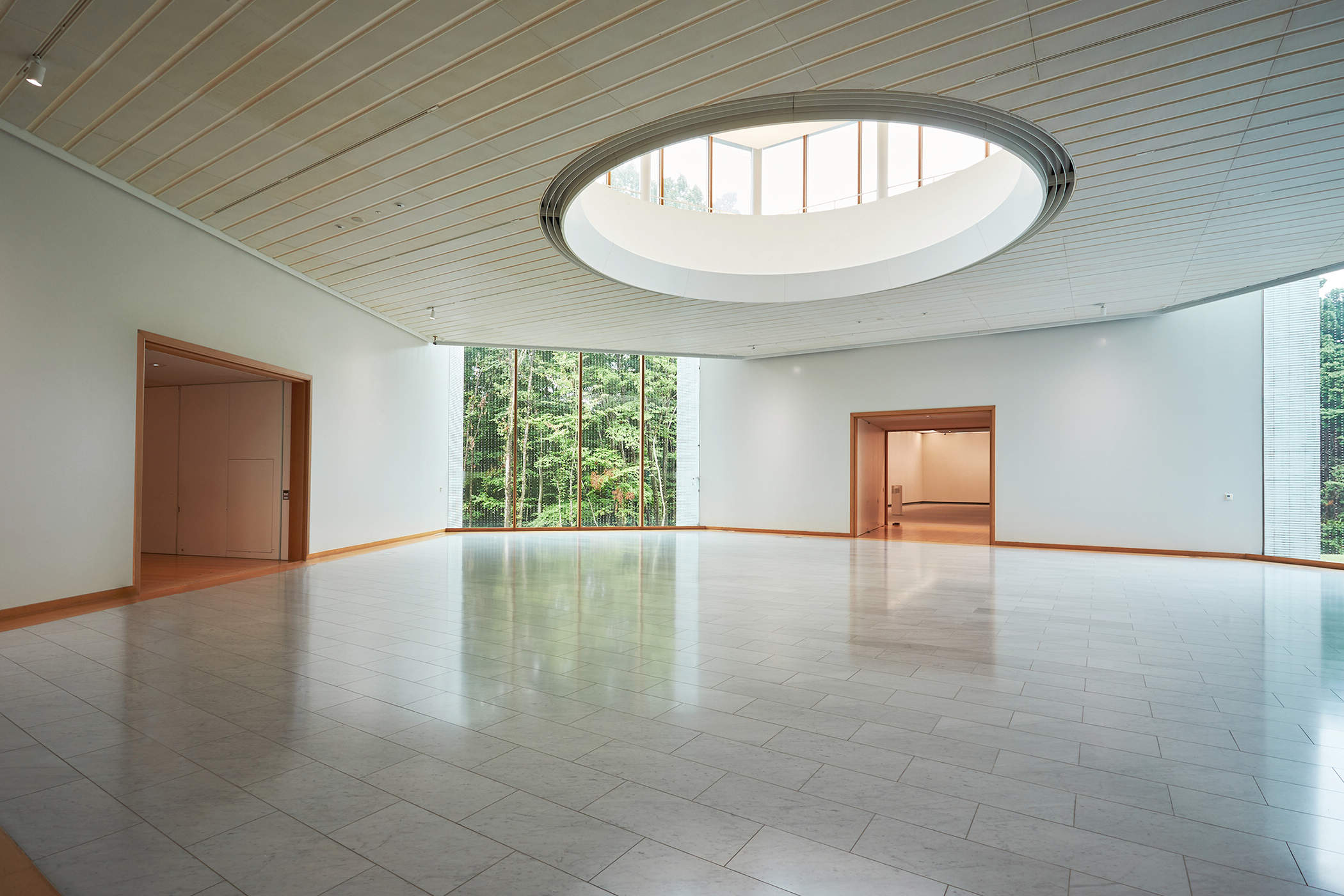 中央ホールでは、自然光を中心とした照明設計です。天井の円形間接照明と大きな窓から豊富な自然光が差し込み、白壁と明るい床材が光を柔らかく反射しています。また天井にはリモコン操作のPiPit高演色スポットライトが配置されており、夜間や曇天時にも安定した照度を確保しています。自然光と人工照明のバランスにより、静謐で開放的な美術館空間が構成されています。