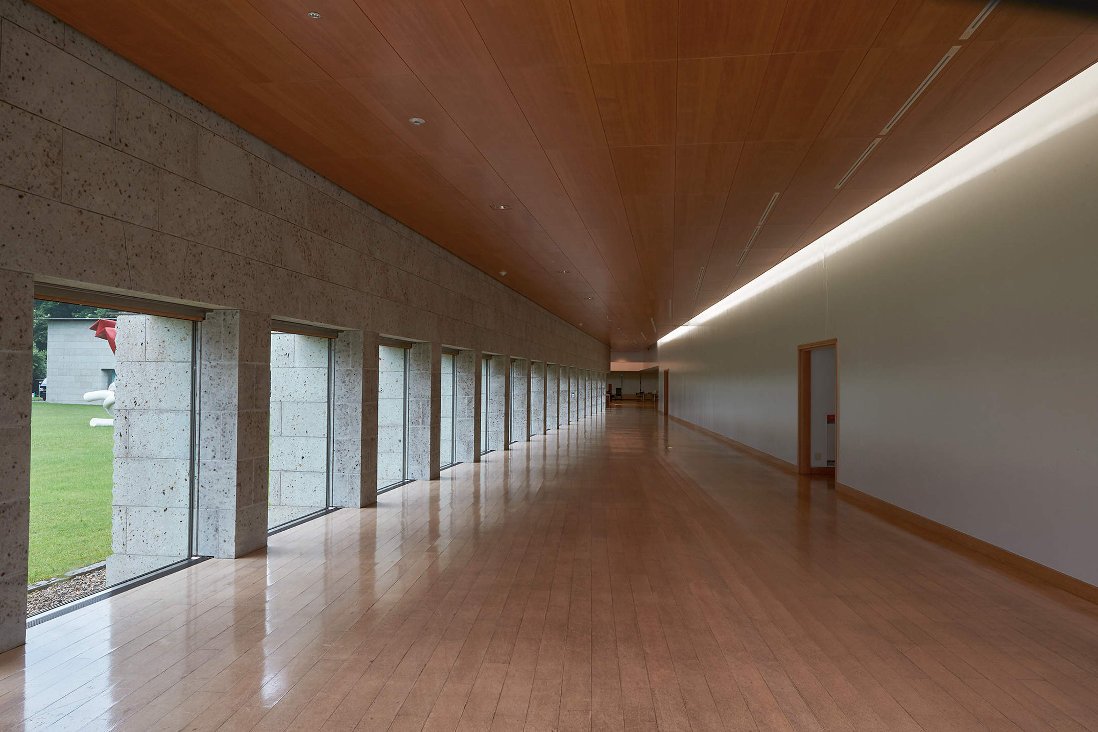 エントランスから展示室に繋がるプロムナードギャラリーには、壁に沿って間接照明が配置され、柔らかな光が静けさと落ち着きを演出。素材の質感や構造美を際立たせており、大きな窓から差し込む自然光と人工照明が融合し、時間帯によって異なる表情を見せる空間となっています。照明器具の配置は視線の誘導や空間の奥行き感を高める効果もあり、美術館全体が光によって構成された作品のような存在感を放っています。
