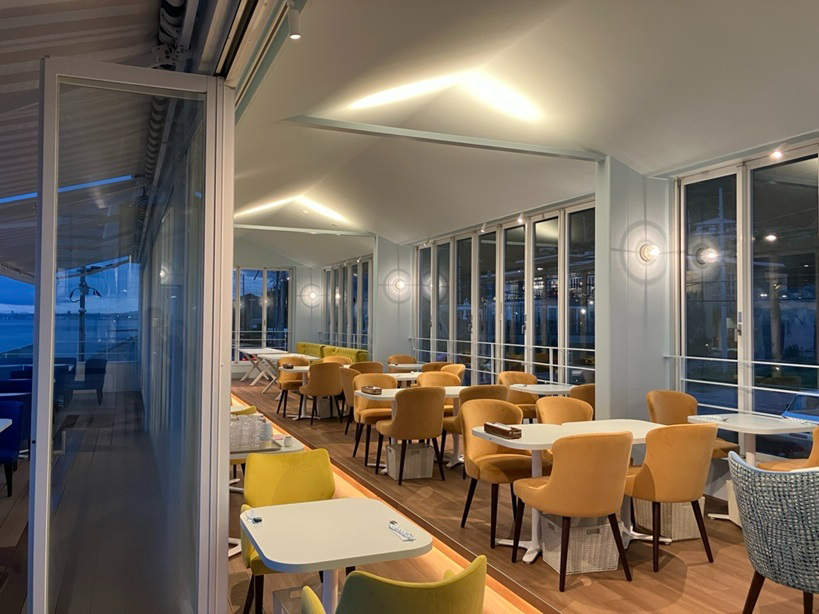 スリムラインを梁上に設置、アッパーの間接照明で明るく印象的な空間に仕上げ