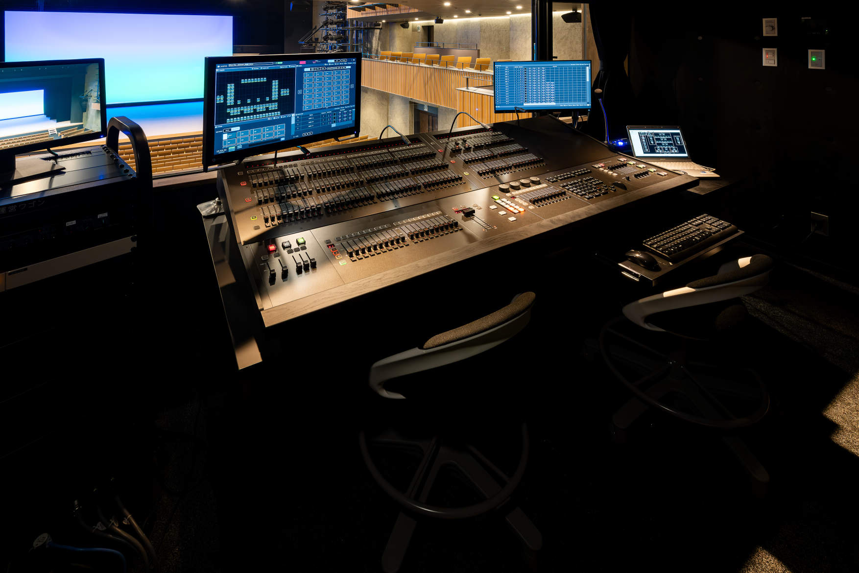 1階客席後方上手側の照明調整室。調光操作卓「JASTO-P3W(プリセットフェーダ80本×3段)」とネットワークラックを設置。舞台袖に設置された移動型操作卓との間で調光仕込データの送受信などが可能。