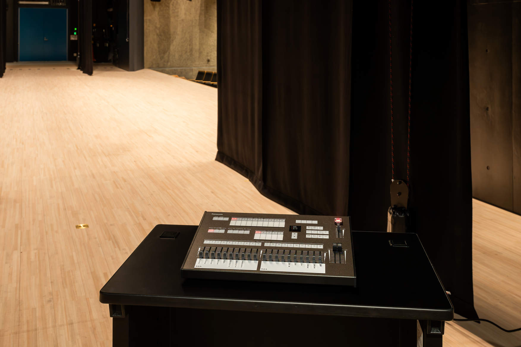 下手袖に設置された舞台袖用の移動型照明操作卓。舞台袖コンセント盤(上手・下手に各1面設置)のコネクタに中継ケーブルを介して接続して使用。大ホールと小ホール共に同一仕様(小ホールはリハーサル室と共用)。