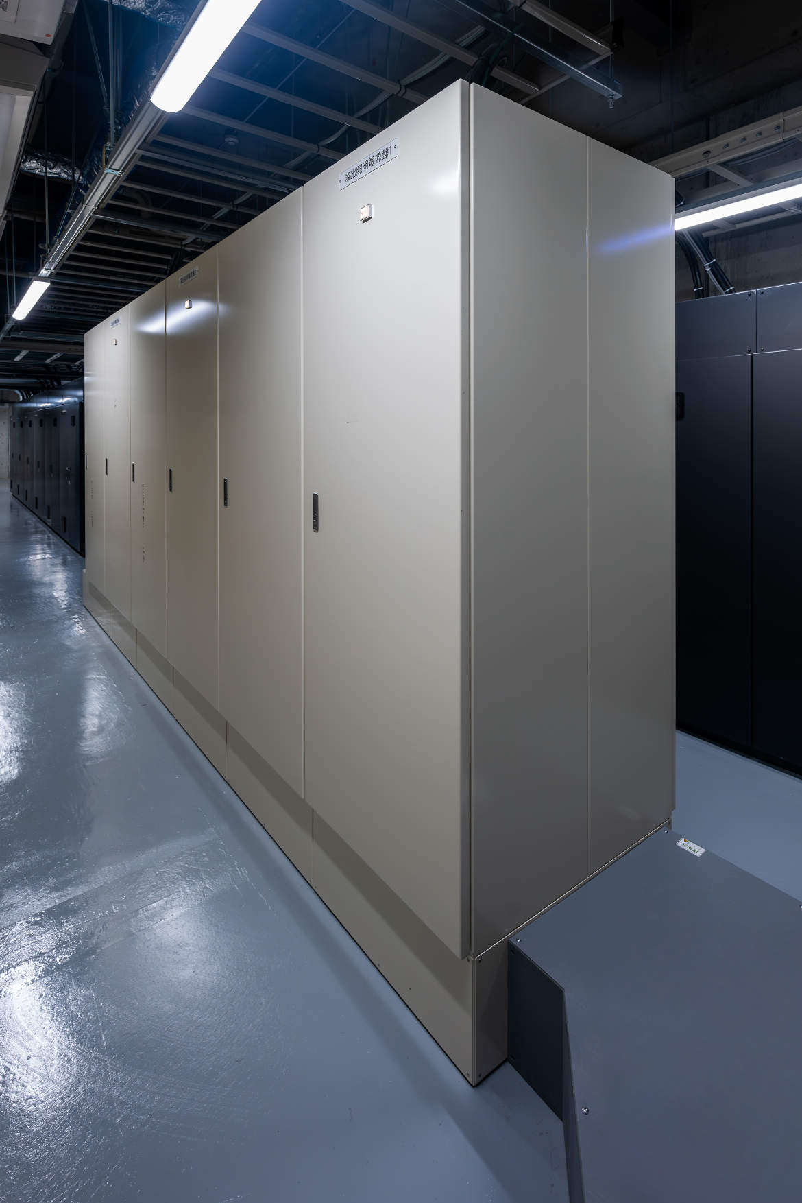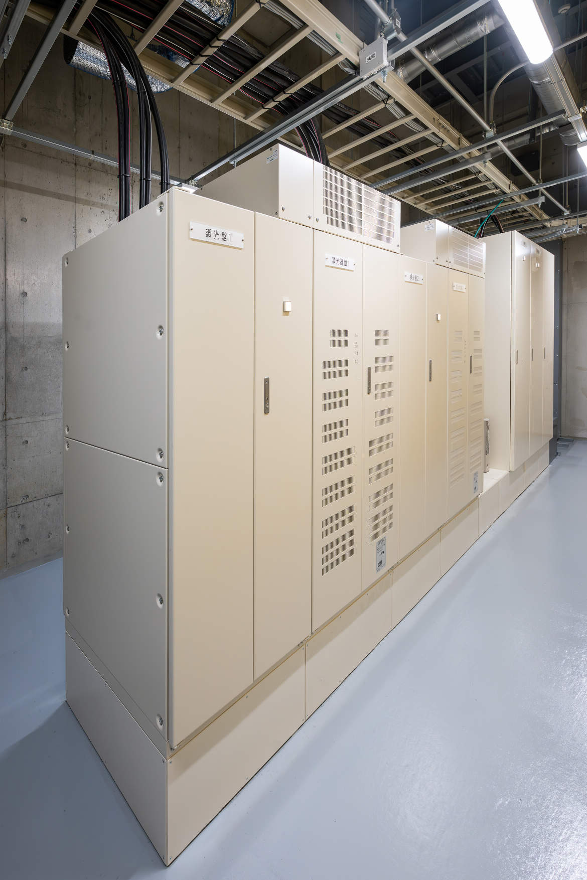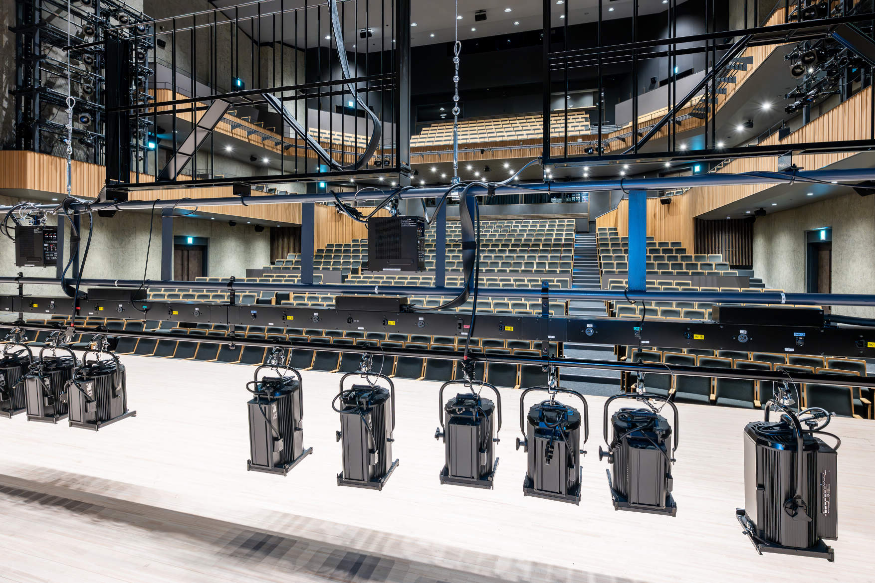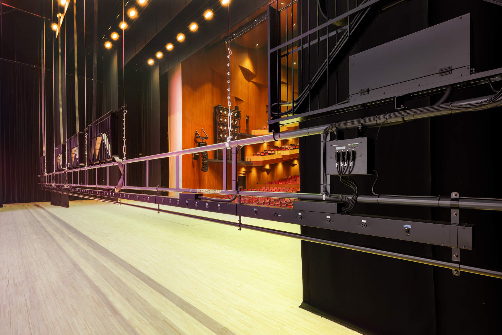 サスペンションフライダクト(L=19.8m)には、100V系でLED器具用の2P15A抜止コンセント×直8回路、主に可搬型調光ユニット用のC型30Aコンセント×直6回路、200V系の海外製持込み器具等に対応するためのD型200V20Aコンセント×直6回路、並びにDMXおよびLANコネクタ各8系統を同じダクト内に分散配置。インテリジェントボックス(スイッチングHUB、Ethernet/DMXインターフェース)付。