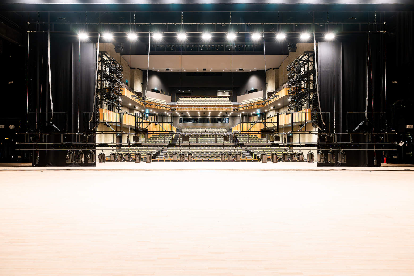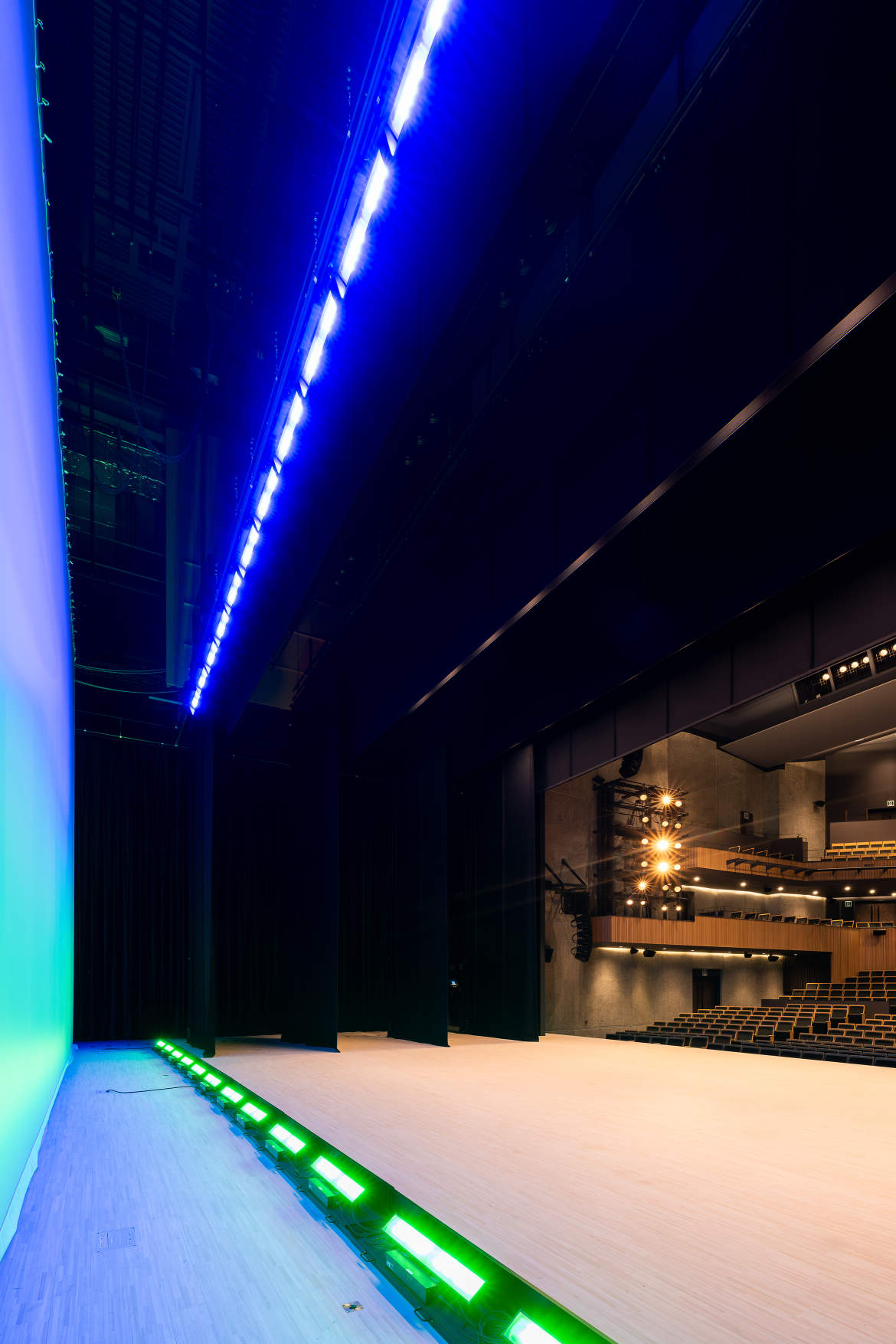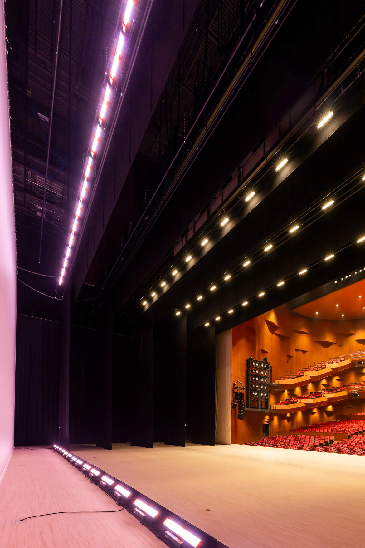 舞台照明常設器具の全てをオールLED化。この規模では業界初と思われる。。ハロゲン器具等への対応は備品の可搬型調光ユニットを各所に接続することで可能。