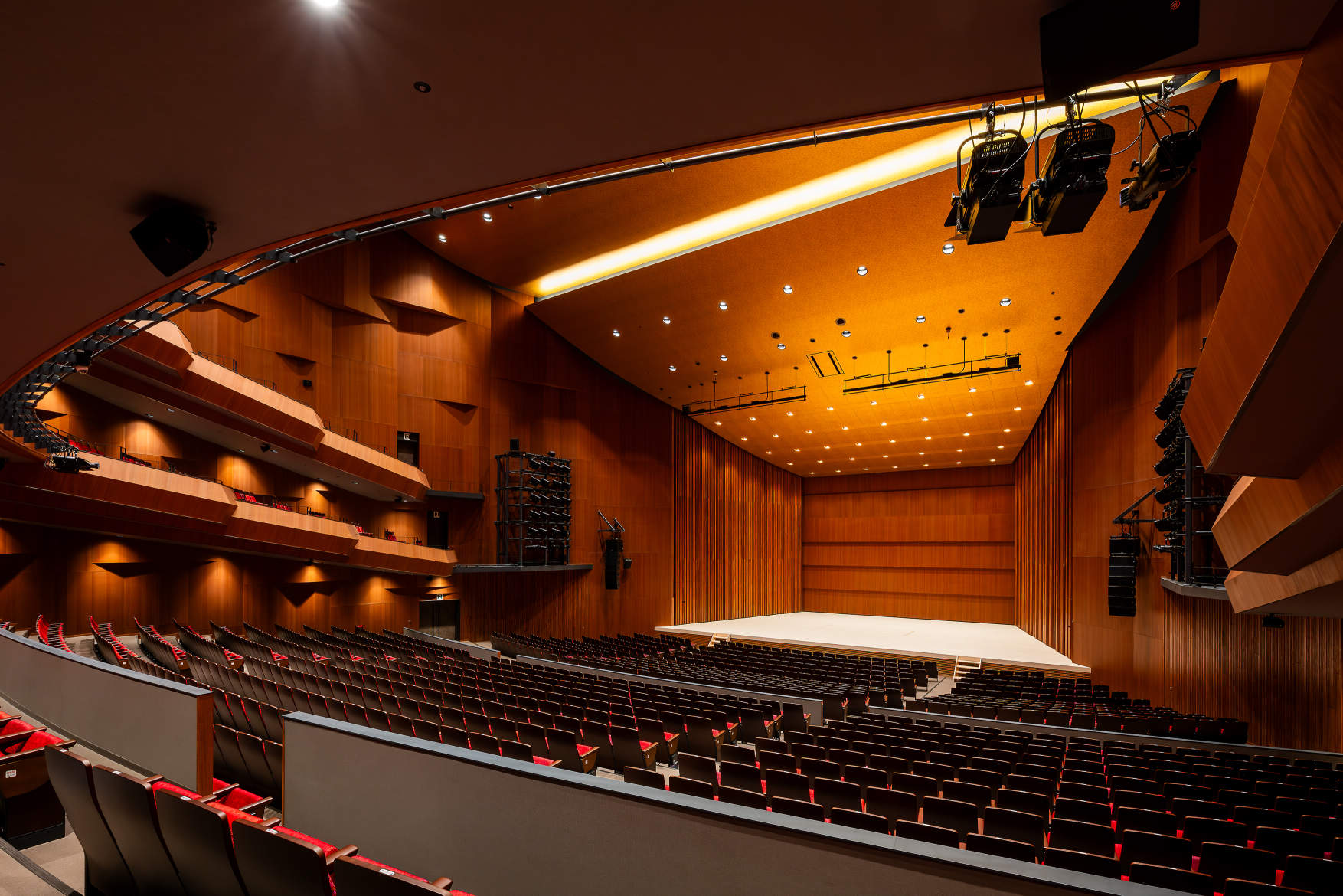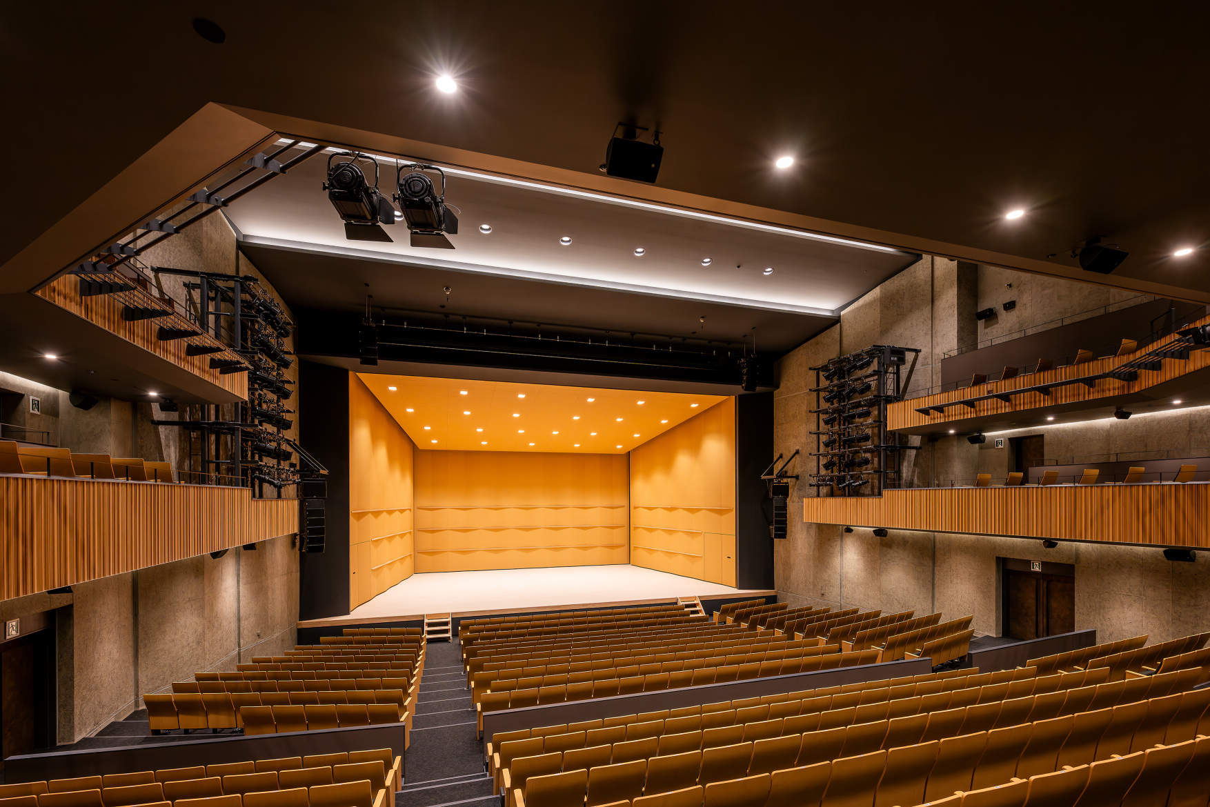水平バルコニー形式で芝居小屋のような“包まれ感”がある、臨場感あふれる空間。音響反射板や仮設花道の設置も可能で、演劇等の舞台公演から市民の文化芸術活動まで幅広く対応可能。