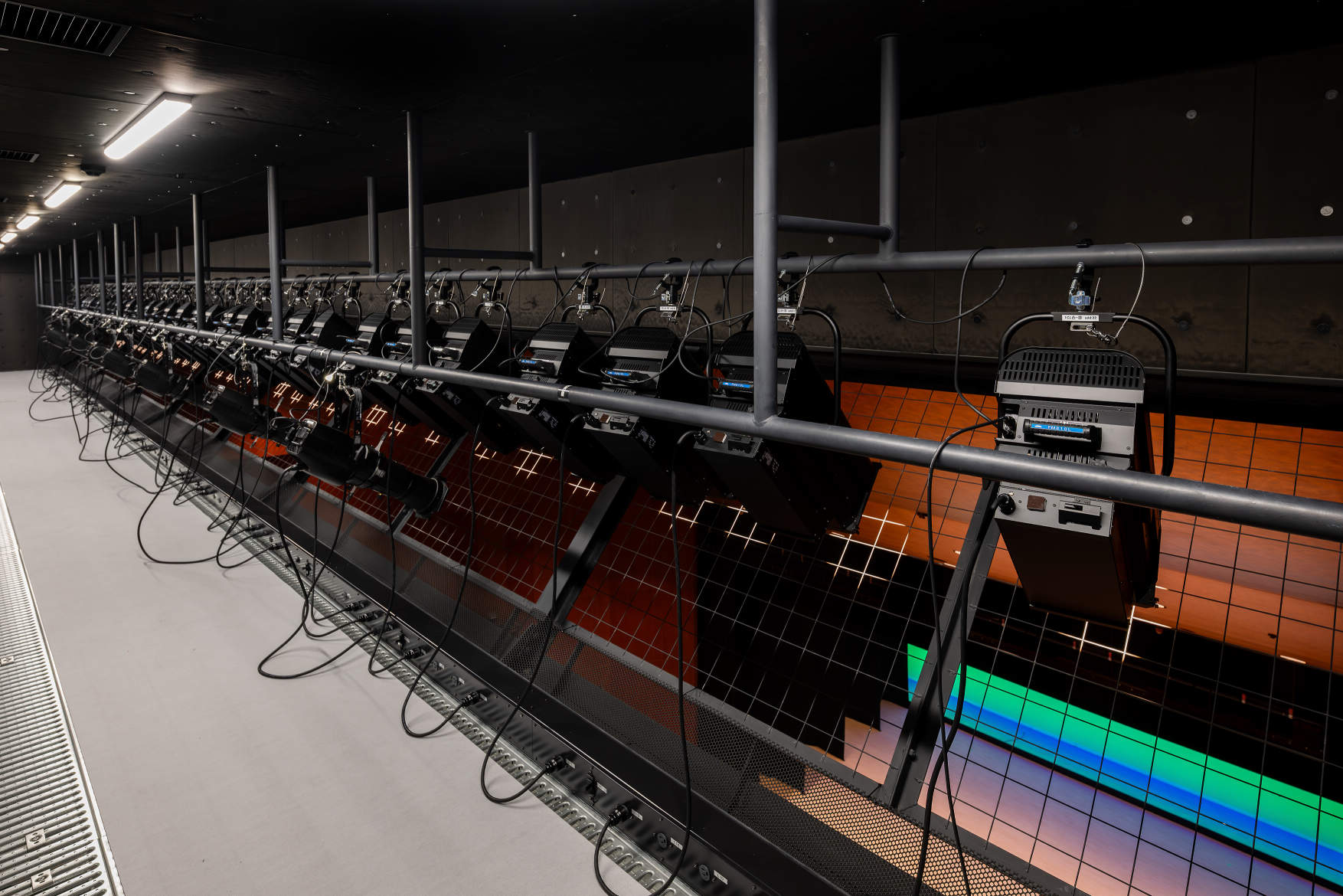 ・舞台上部と床部:第1~第2Bボーダーライト、第1~第3SUSサスペンションフライダクト、UHアッパーホリゾントライト、LHロアホリゾントライト、GALギャラリーコンセント、FC各種フロアコンセント、袖コンセント盤、仮設電源盤