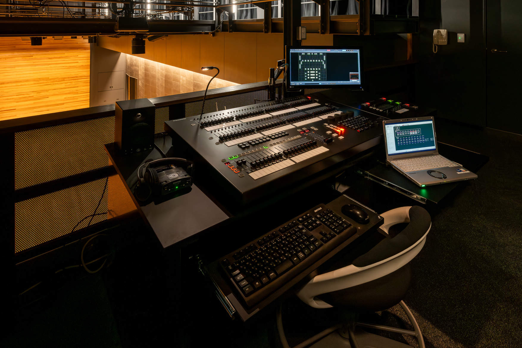 客席後方上部の技術ギャラリー。大・中ホールと同等の操作性を持つネットワーク対応の調光操作卓「JASTO-P2(プリセットフェーダ40本×2段)」を導入。場内用の移動型照明操作卓も同様にデータ連係可能な専用卓を装備(リハーサル室と兼用)。