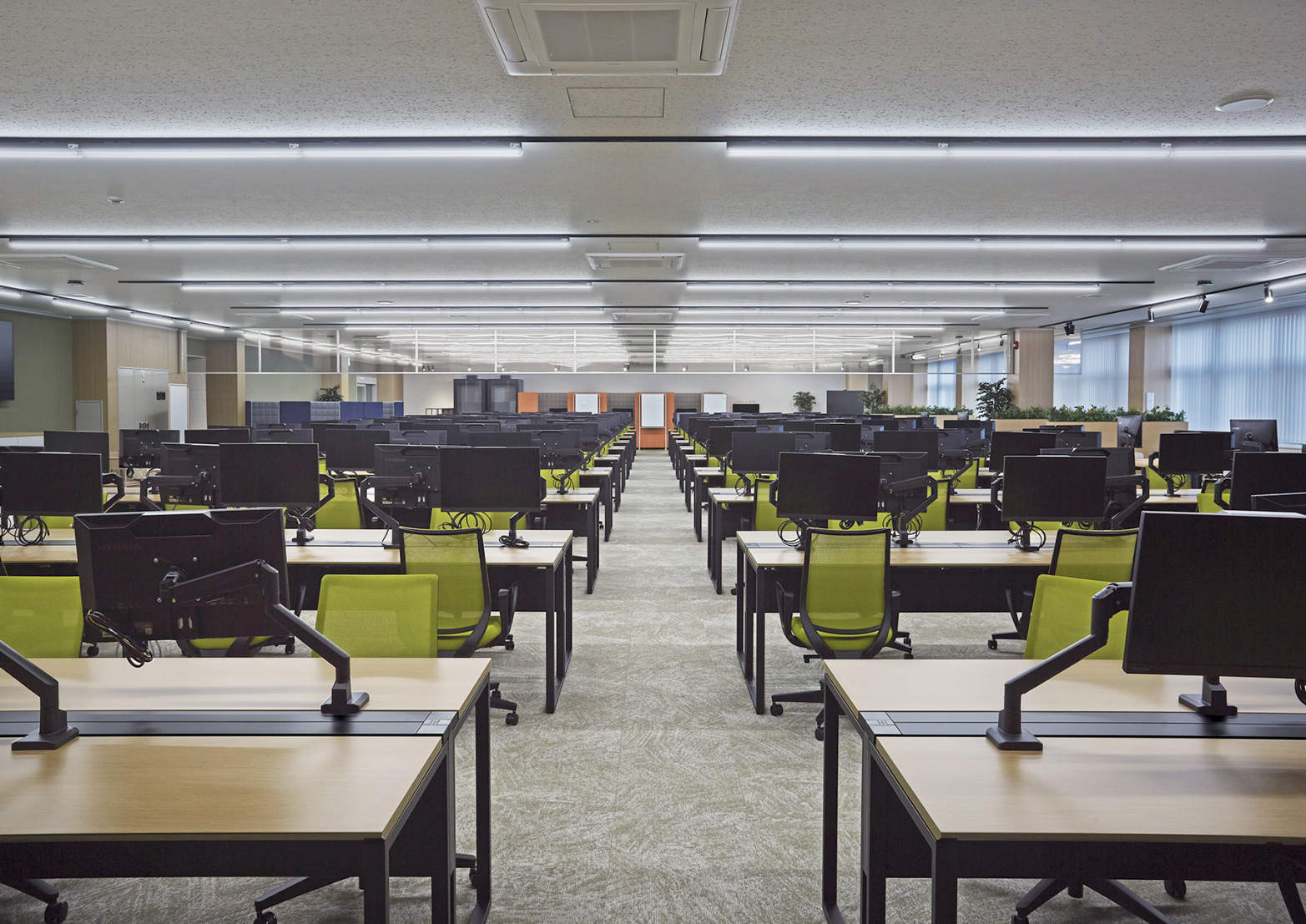 - パナソニック インダストリー株式会社 郡山工場では、既存事務所の老朽化とキャパシティ不足を背景に、新たに増築棟を整備。従来の「暗い・固い」といった印象を刷新し、部門を越えたコミュニケーションが自然に生まれるオフィス環境を目指しました。照明は、sBベースライトとスポット・ダウンライトを適所に組み合わせ、さらにLiBecoMによる調光調色・スケジュール運用で、時間帯に合わせた快適性とメリハリを両立。執務エリアはスケジュール自動制御、打合せブースはシーン選択で用途に応じた光環境を簡単に切り替え可能とし、将来のレイアウト変更にも柔軟に対応できる計画としました