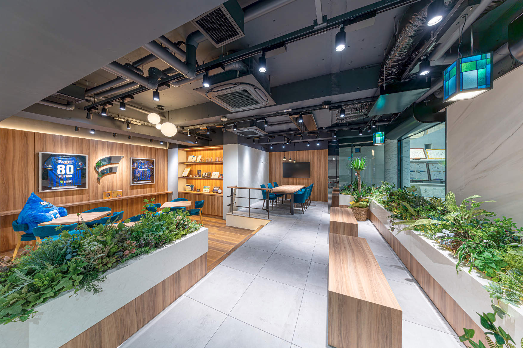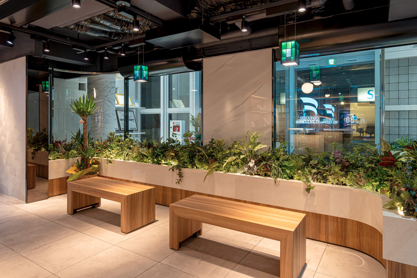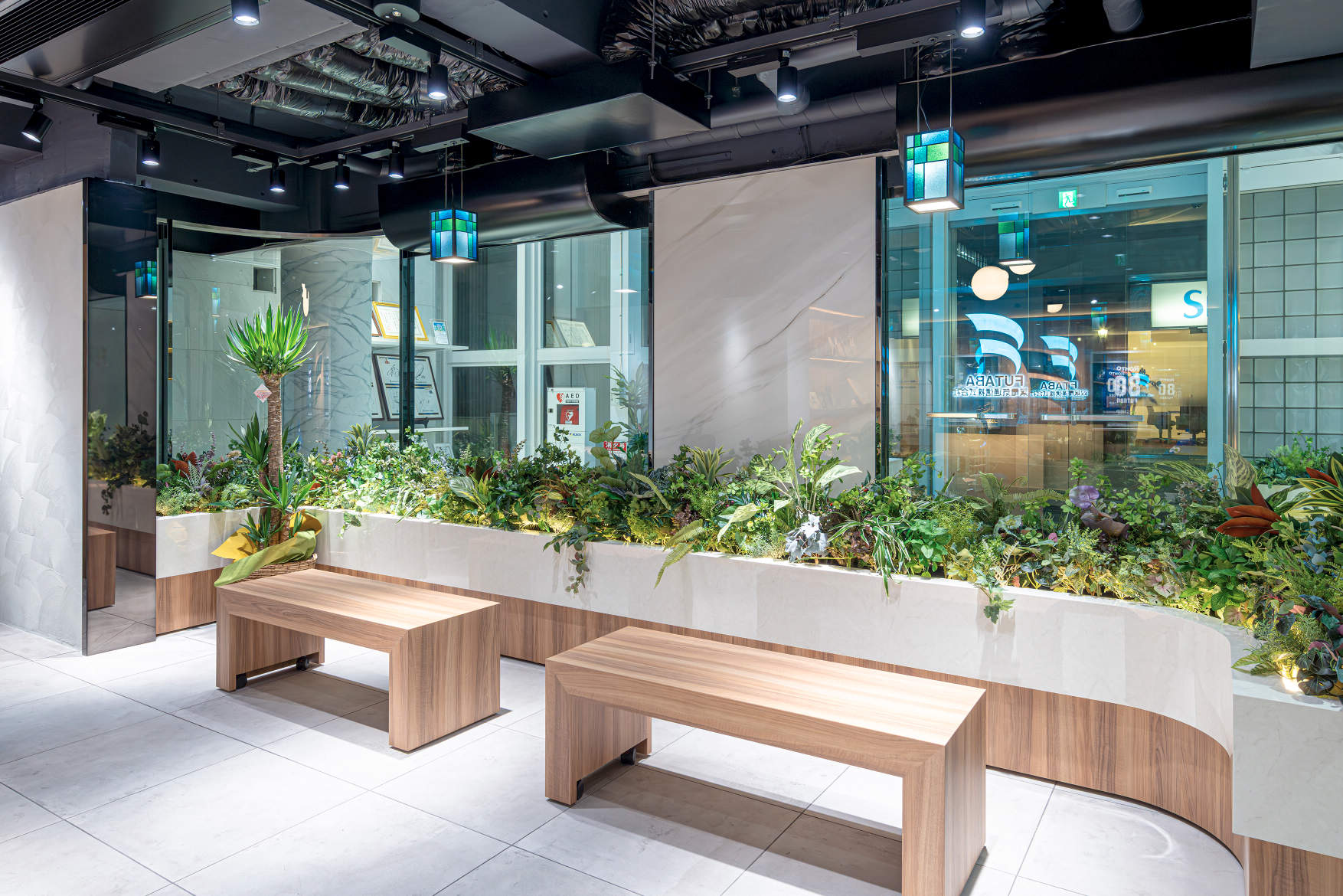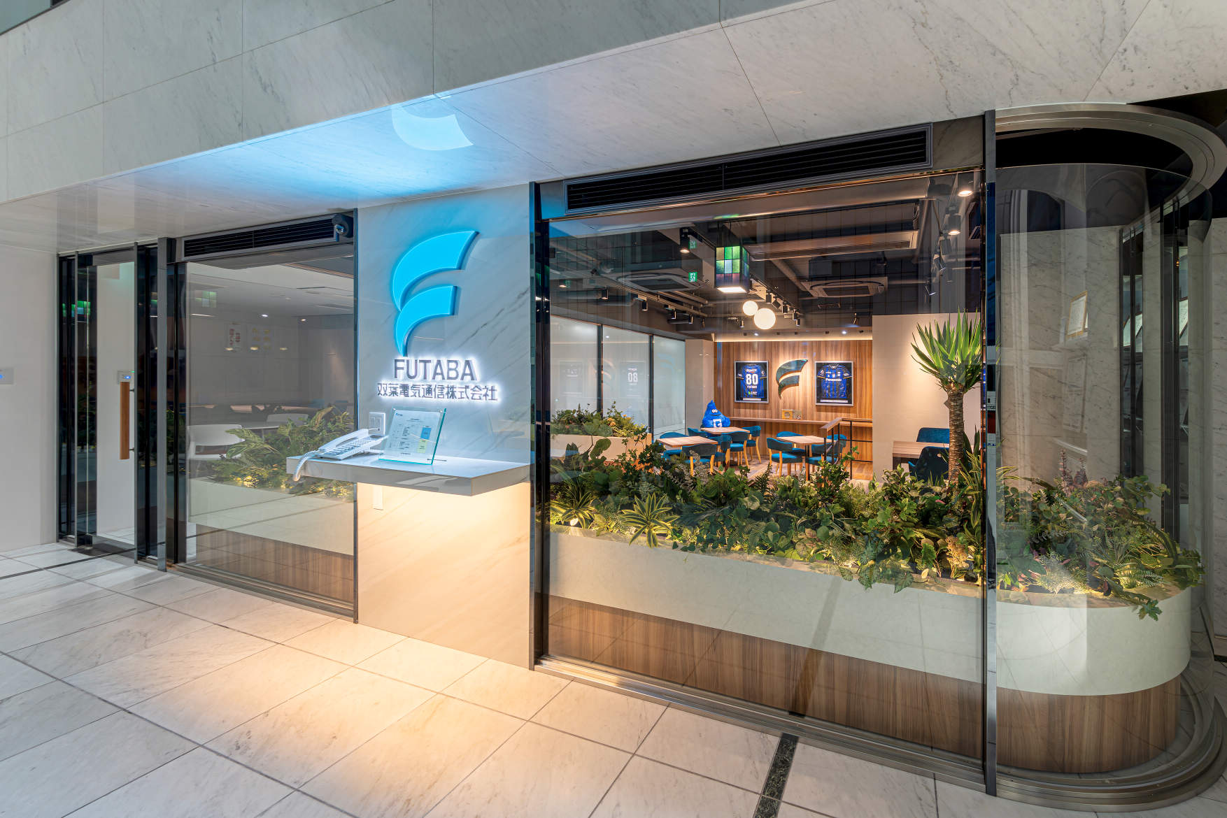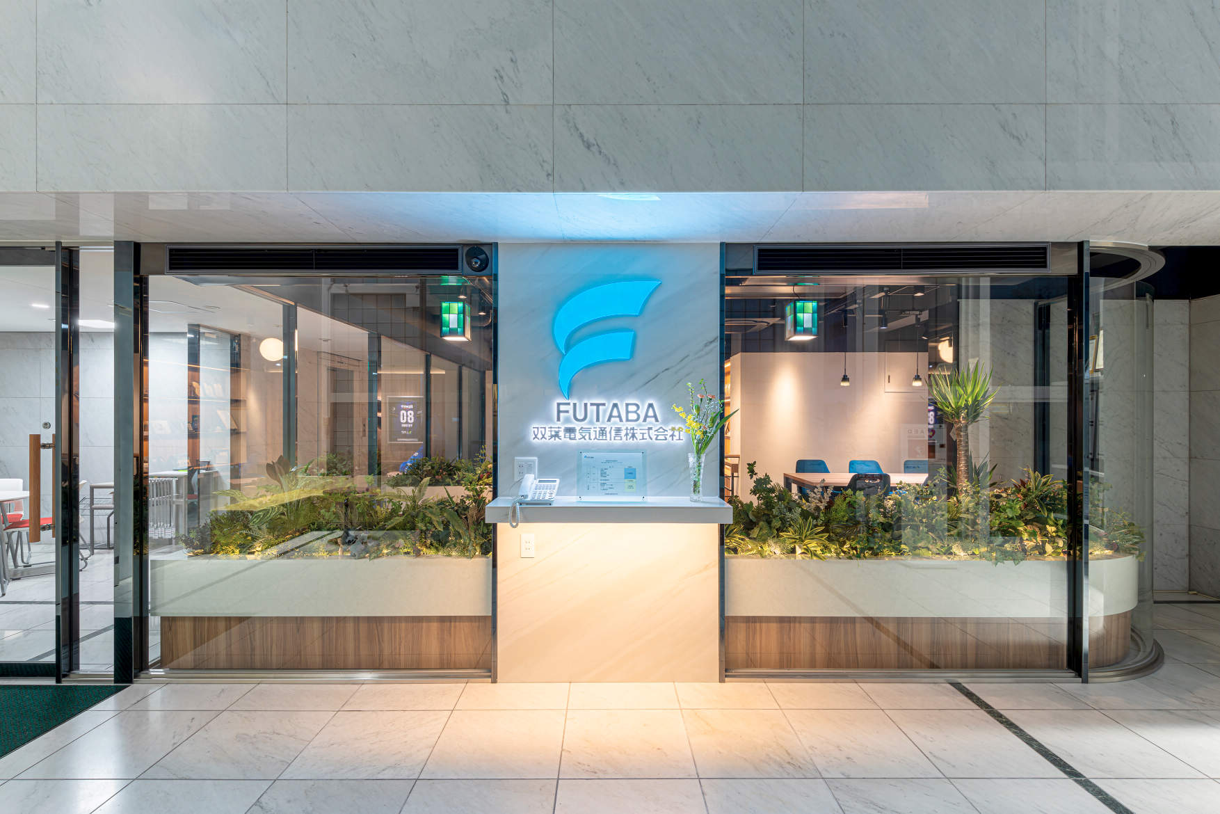 - 双葉電気通信株式会社 本社オフィスのリニューアルにあたり、特徴的なガラス張りのエントランスをはじめ、