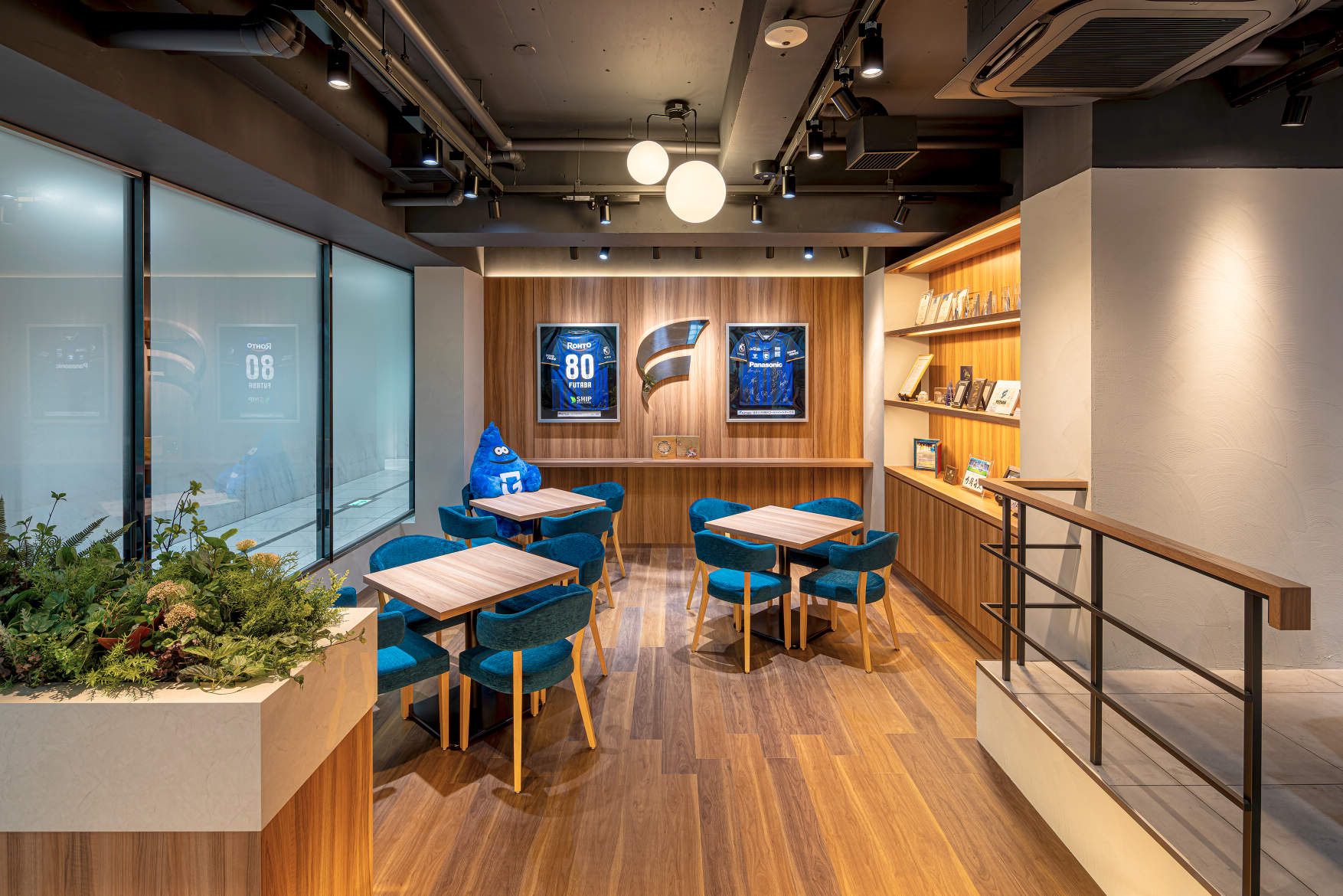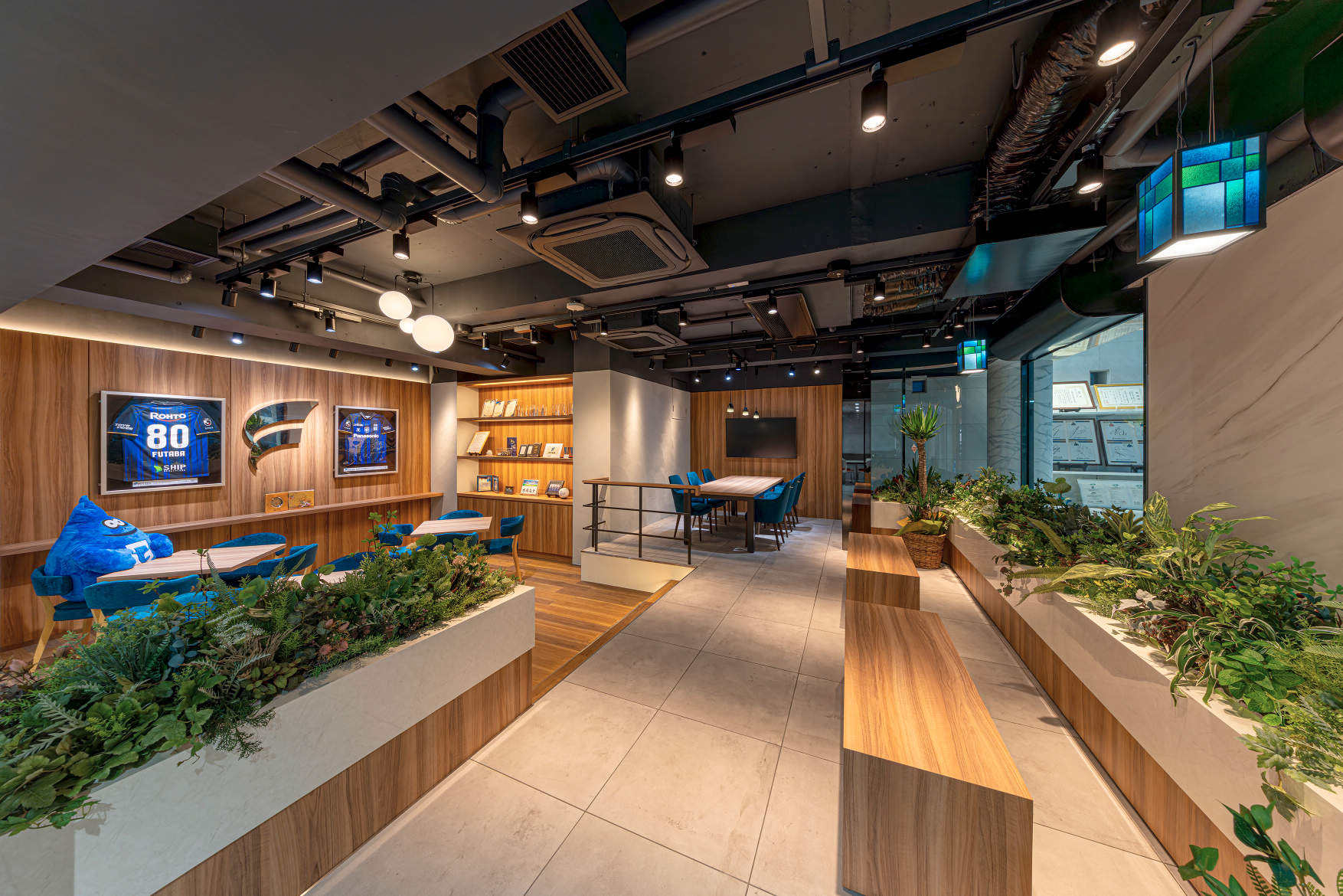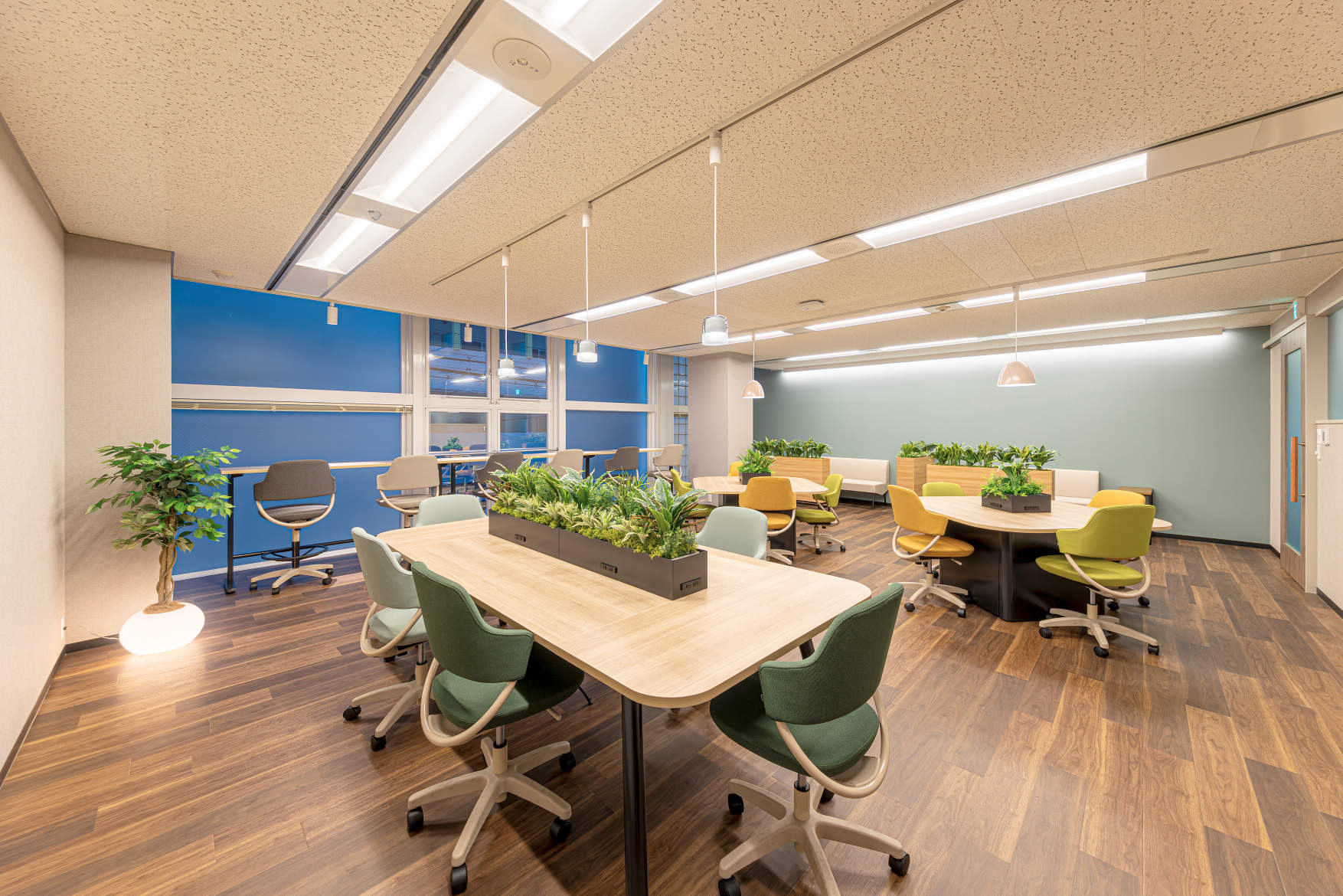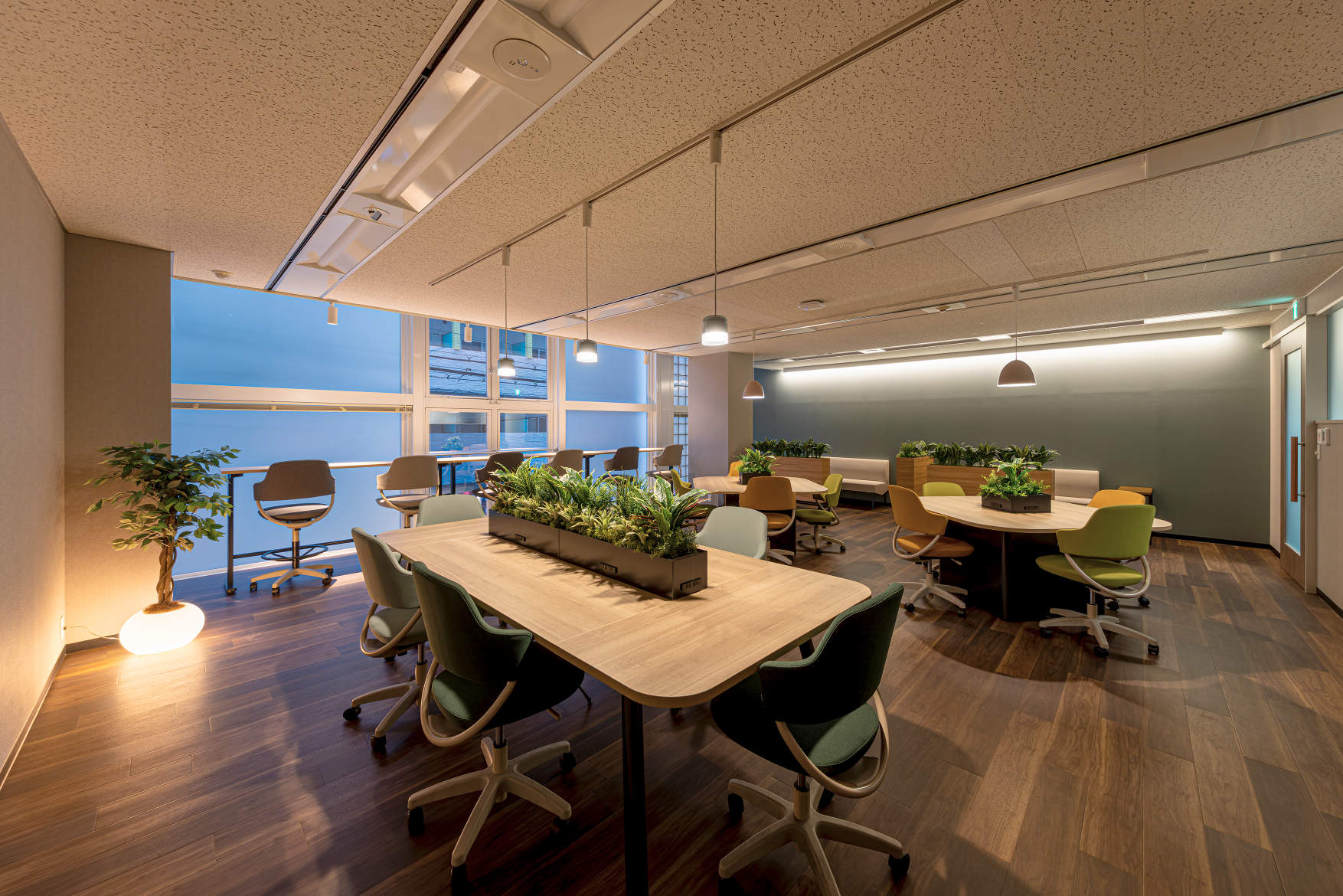 2Fの休憩スペースでは、間接照明・ペンダント・スポットライトを組み合わせ、メリハリのある落ち着いた空間へと改良しています。