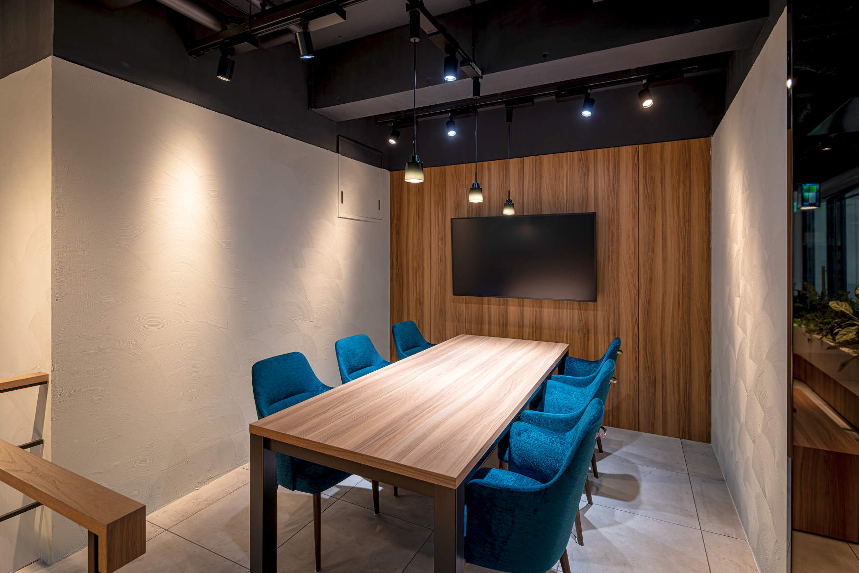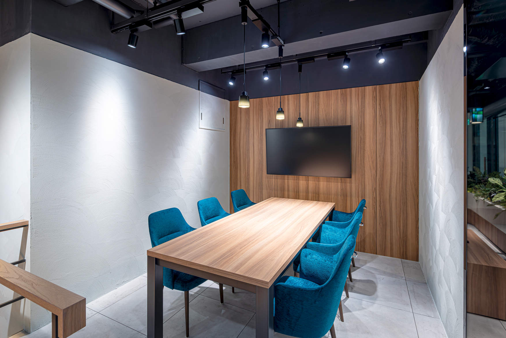 1Fの商談スペースには、LiBecoMの調光・調色スポットライトを採用し、打ち合わせの用途に応じて照明シーンの切り替えが可能です。